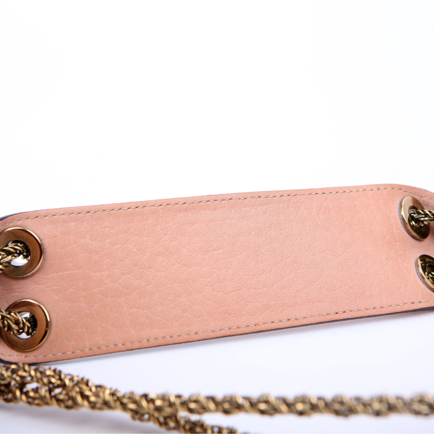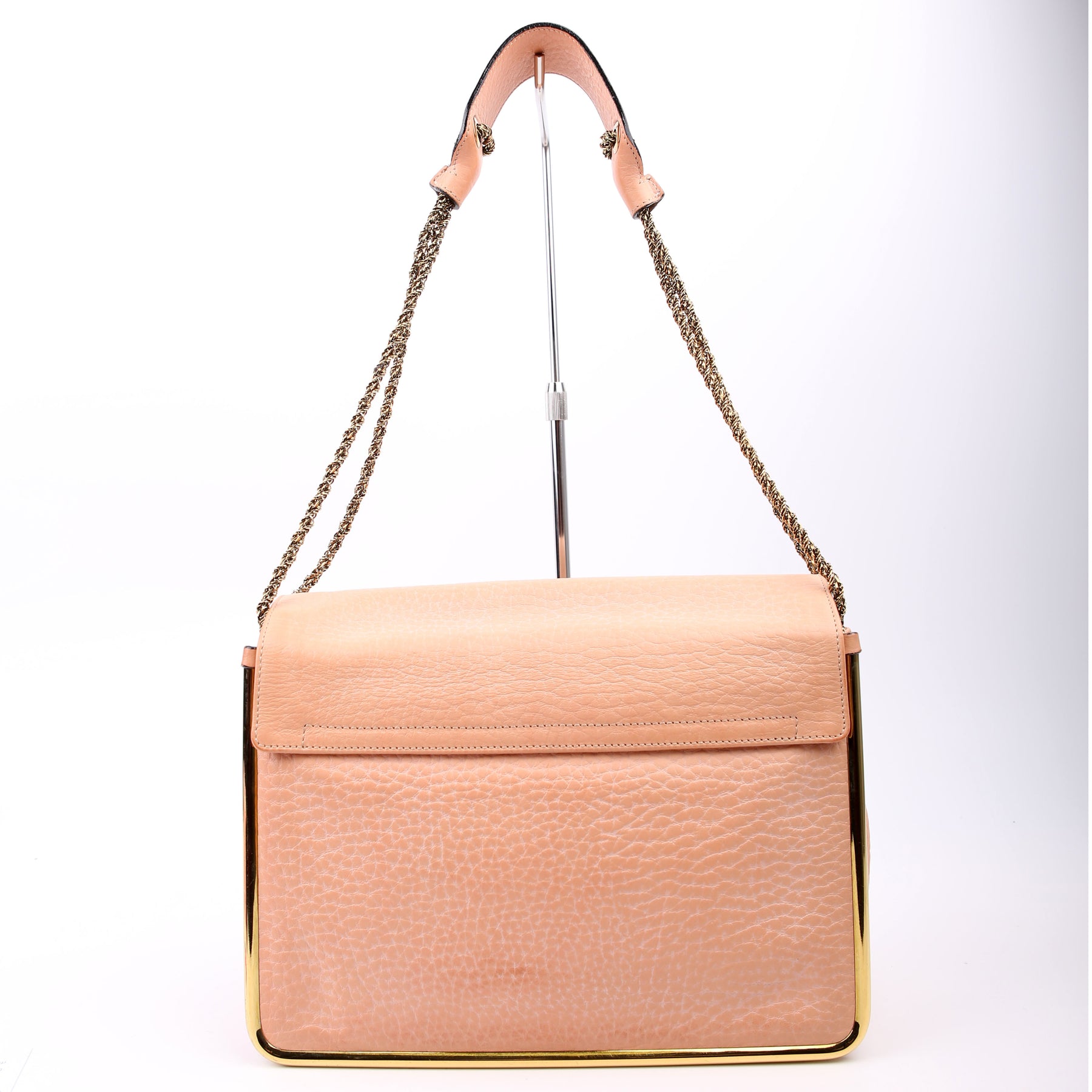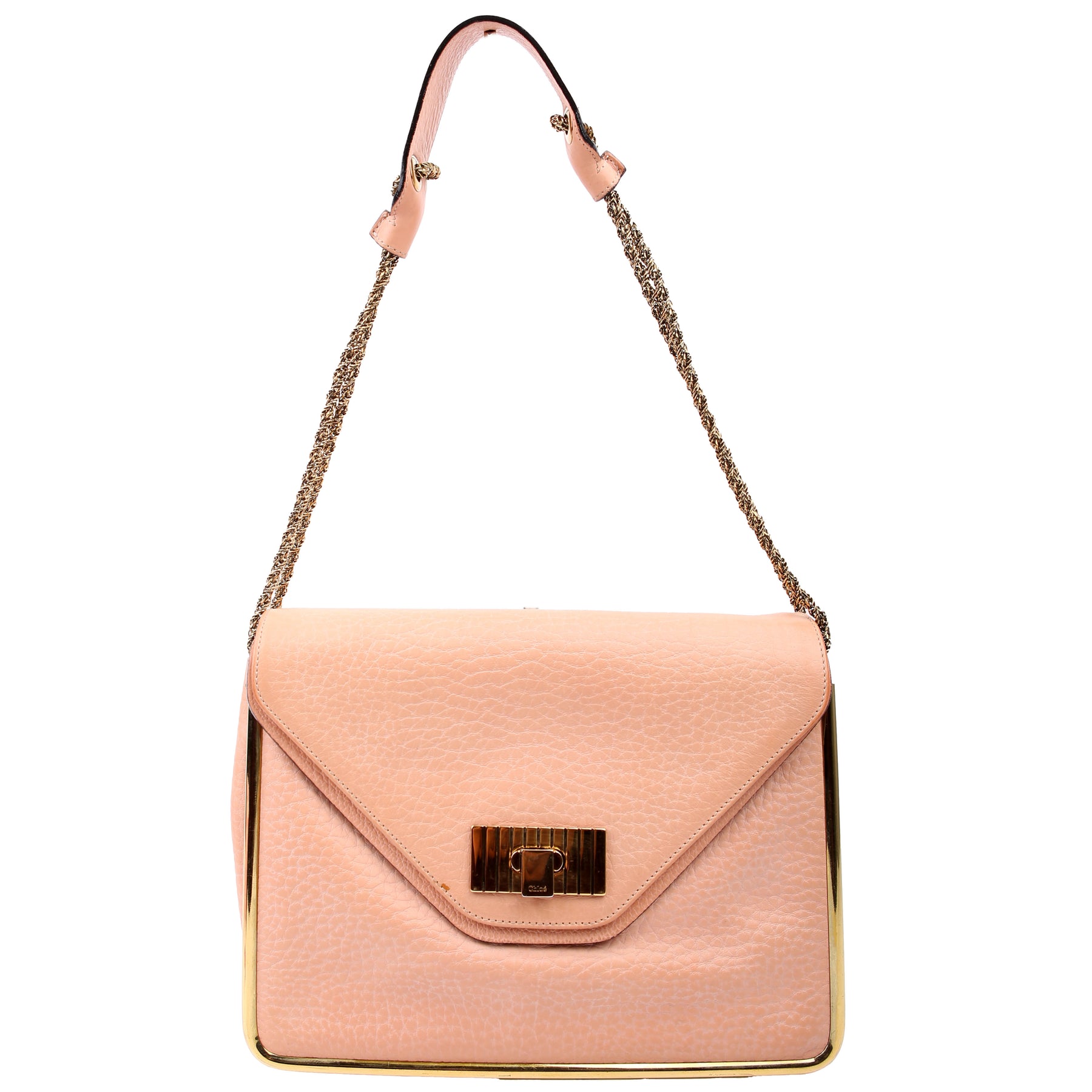 Strap: The shoulder strap shows minor wear and discoloration along the leather. The chain shows minor discoloration.