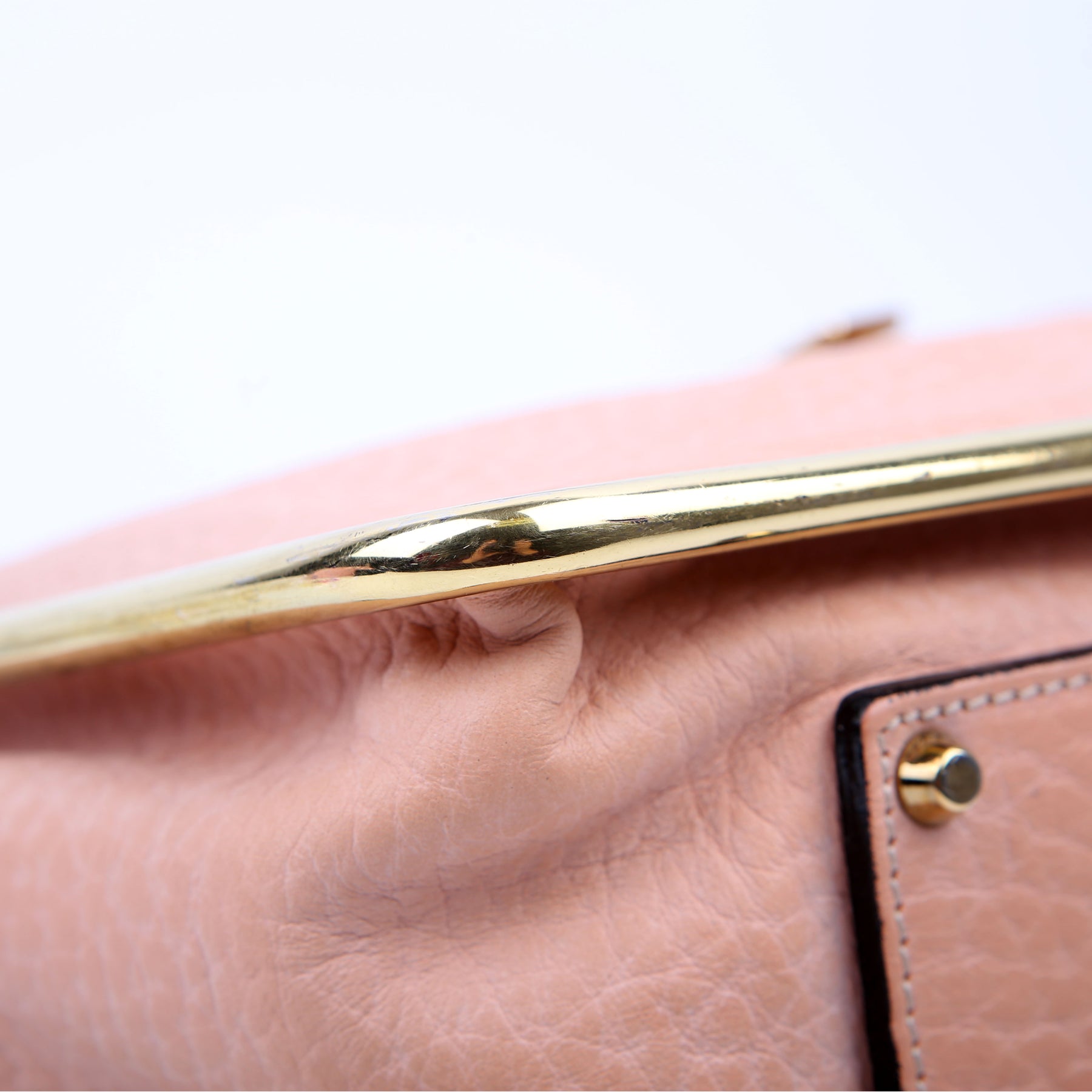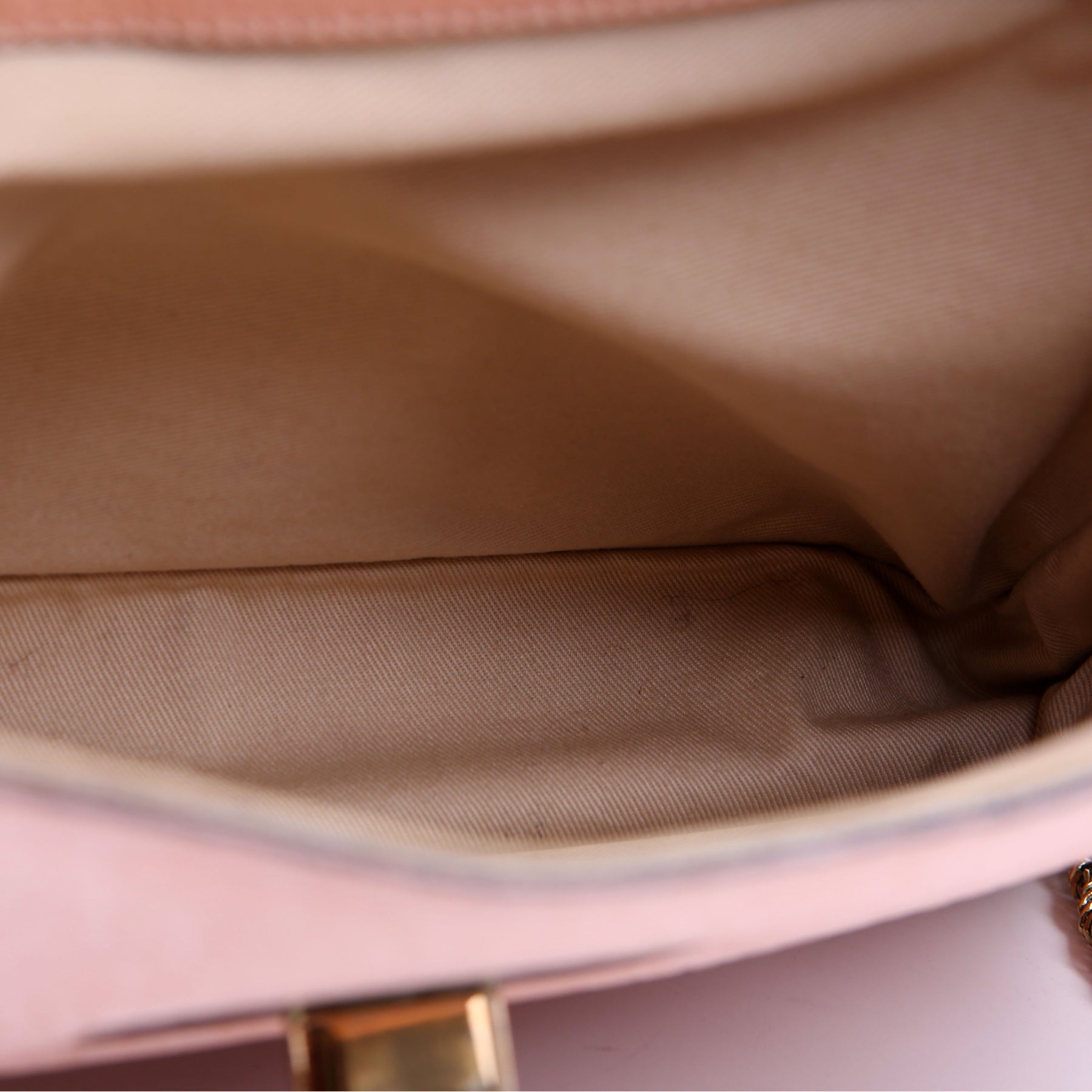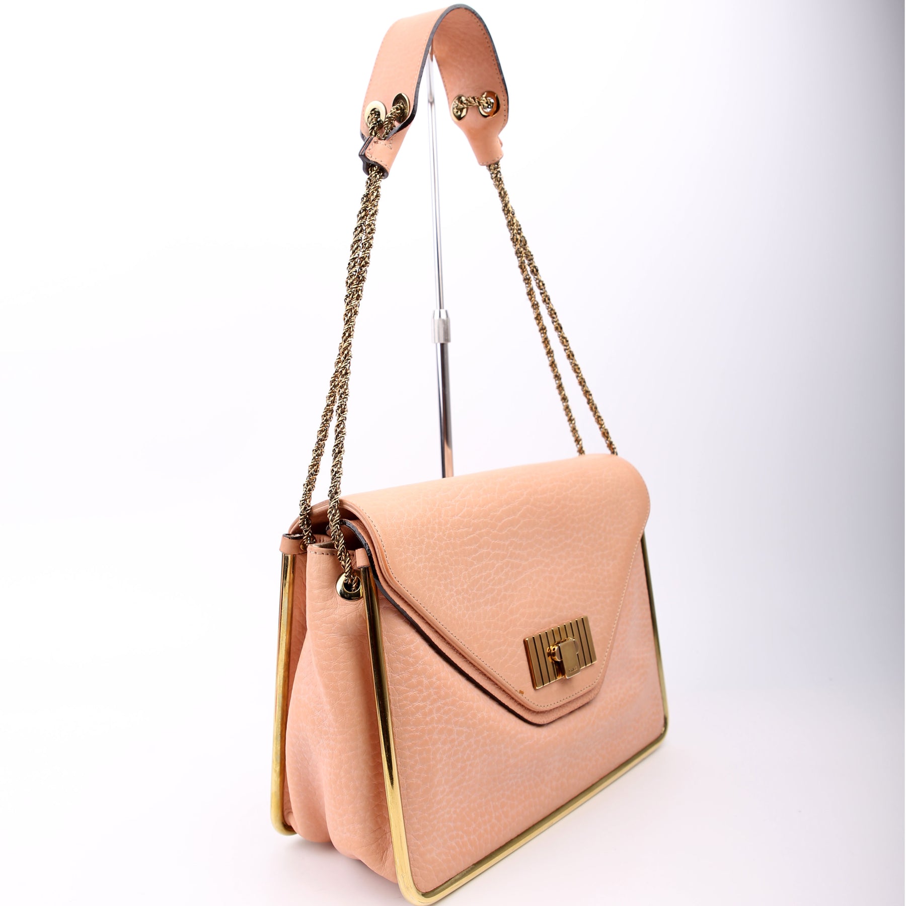 Strap: The shoulder strap shows minor wear and discoloration along the leather. The chain shows minor discoloration.