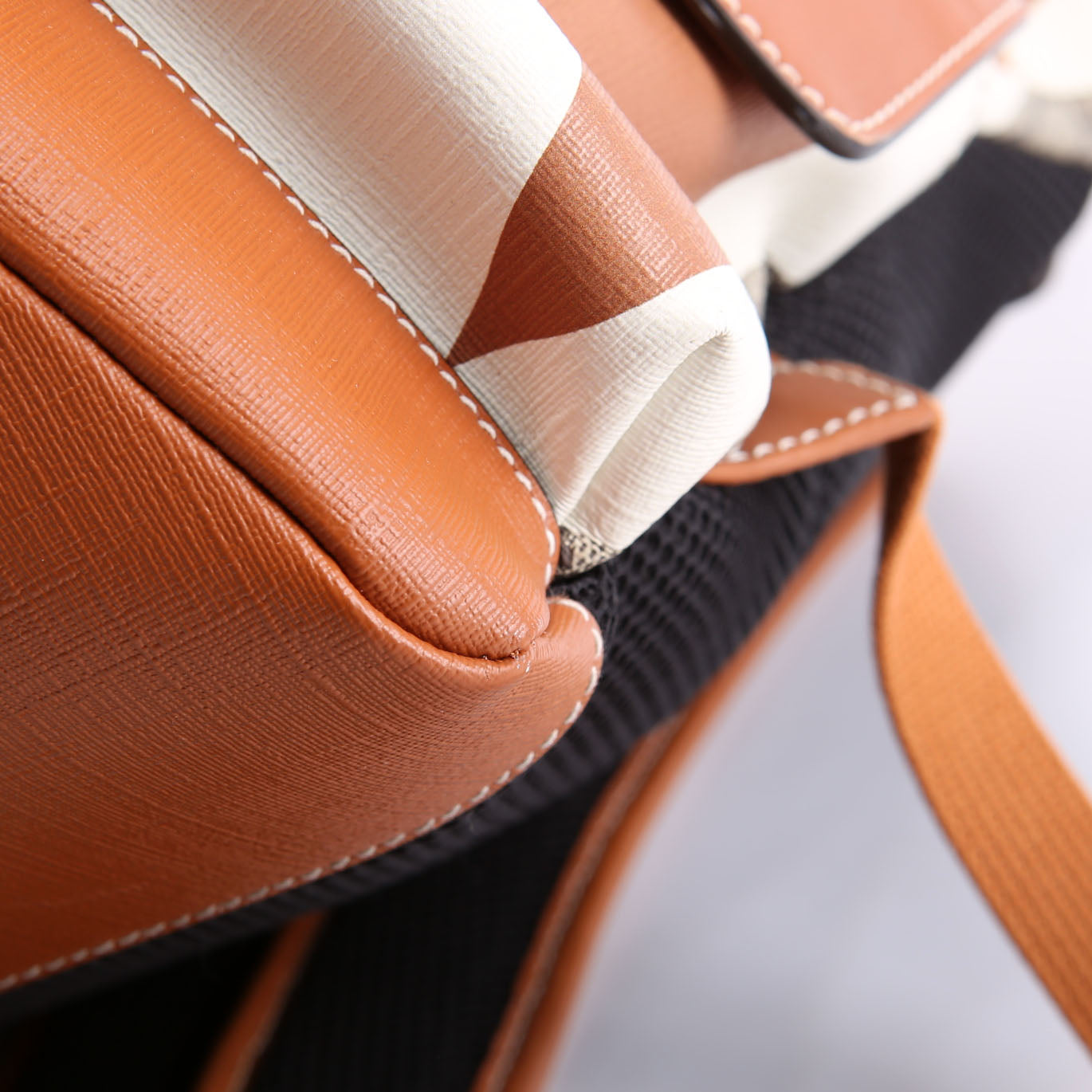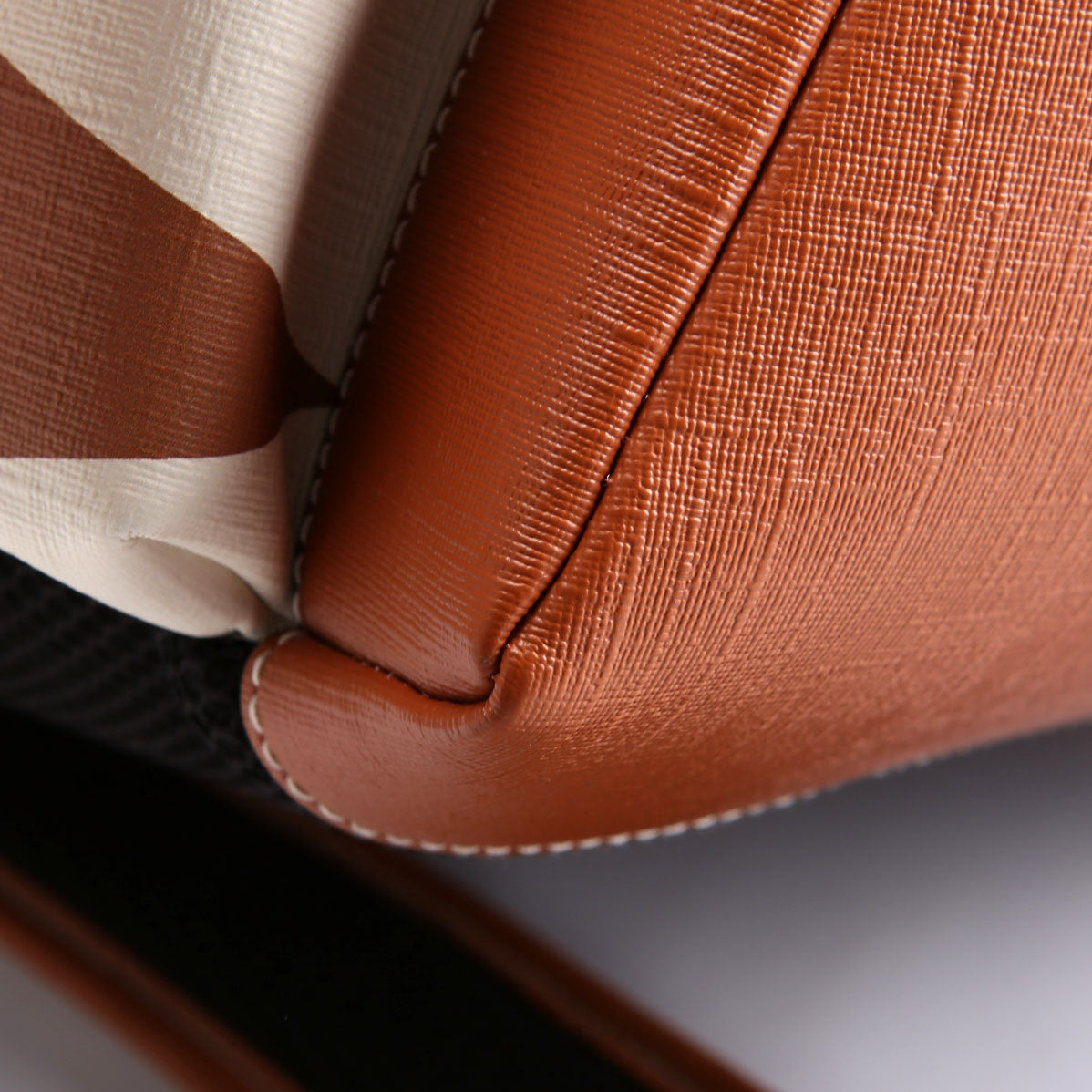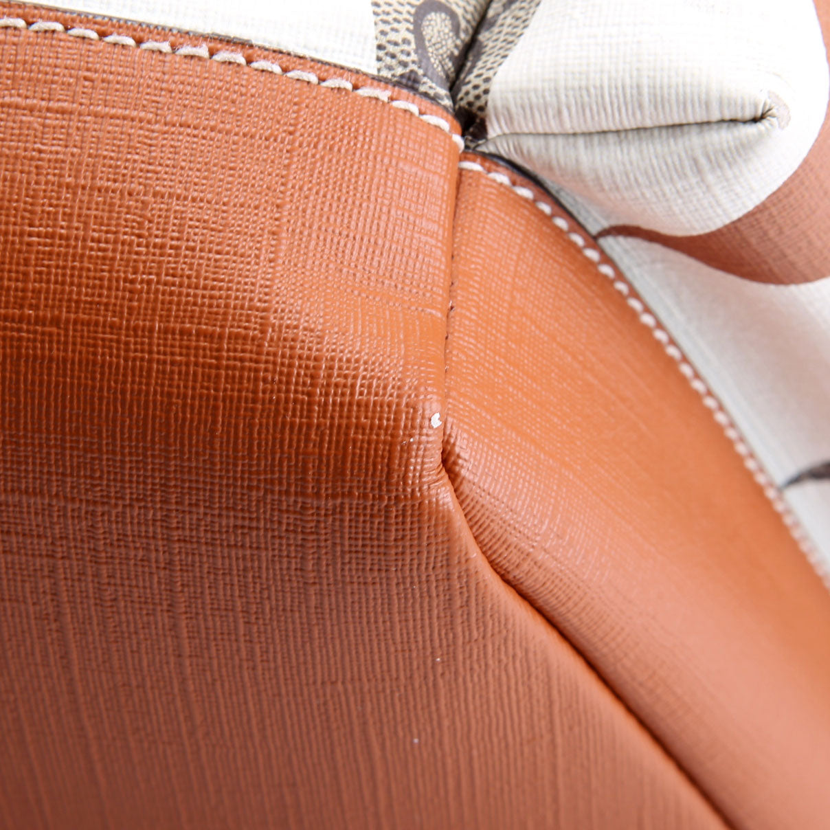 Exterior: There are minor scratches throughout the leather detail and minimal scuffs throughout. The corners show wear and peeling. The exterior features two flap magnetic closure pockets.
