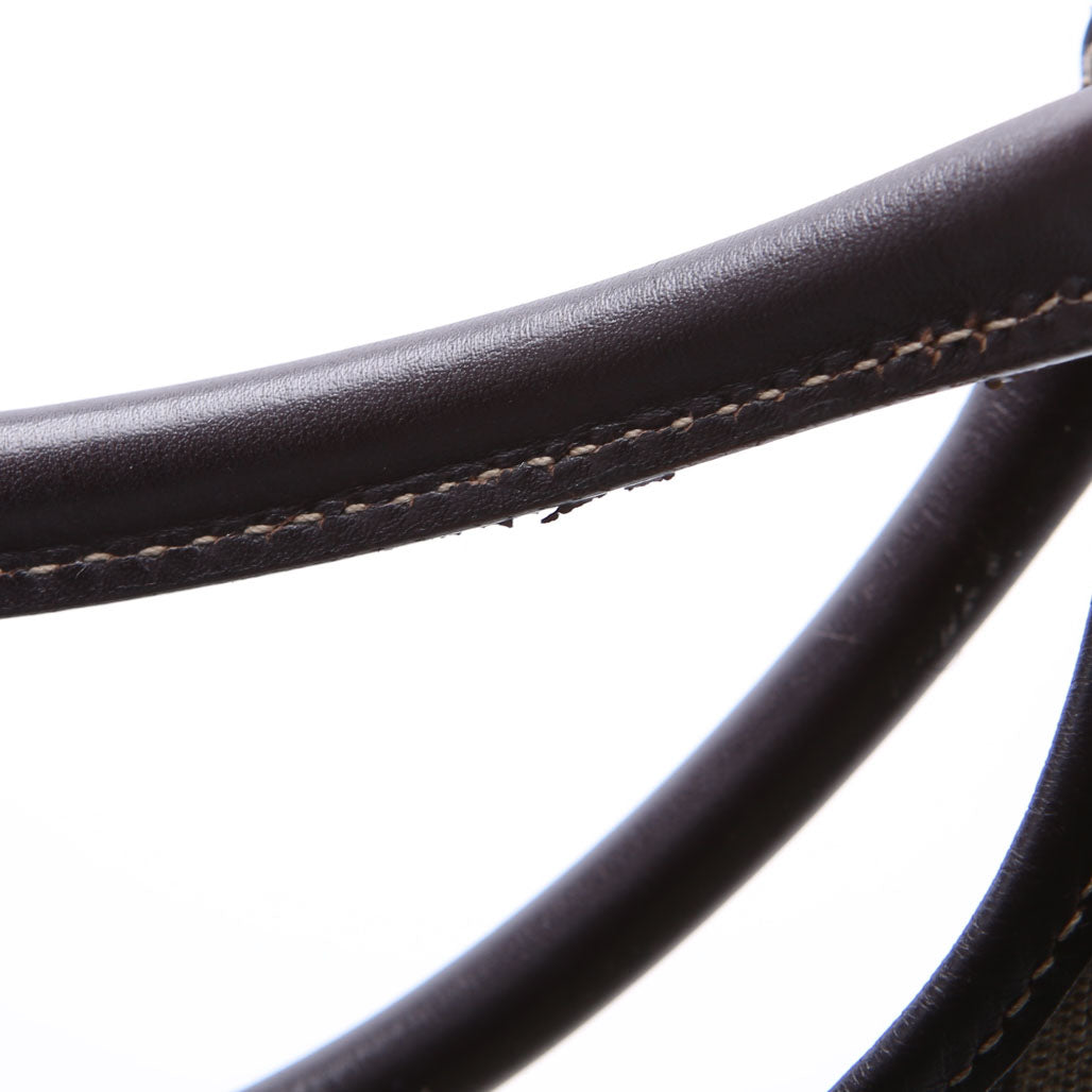 Exterior: The exterior coated canvas is free from wear. The leather detail shows light wear and marks. The corners show wear and rubbing. The structure is slightly misshapen from storage and wear.