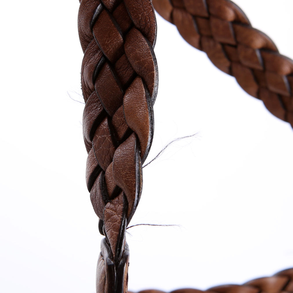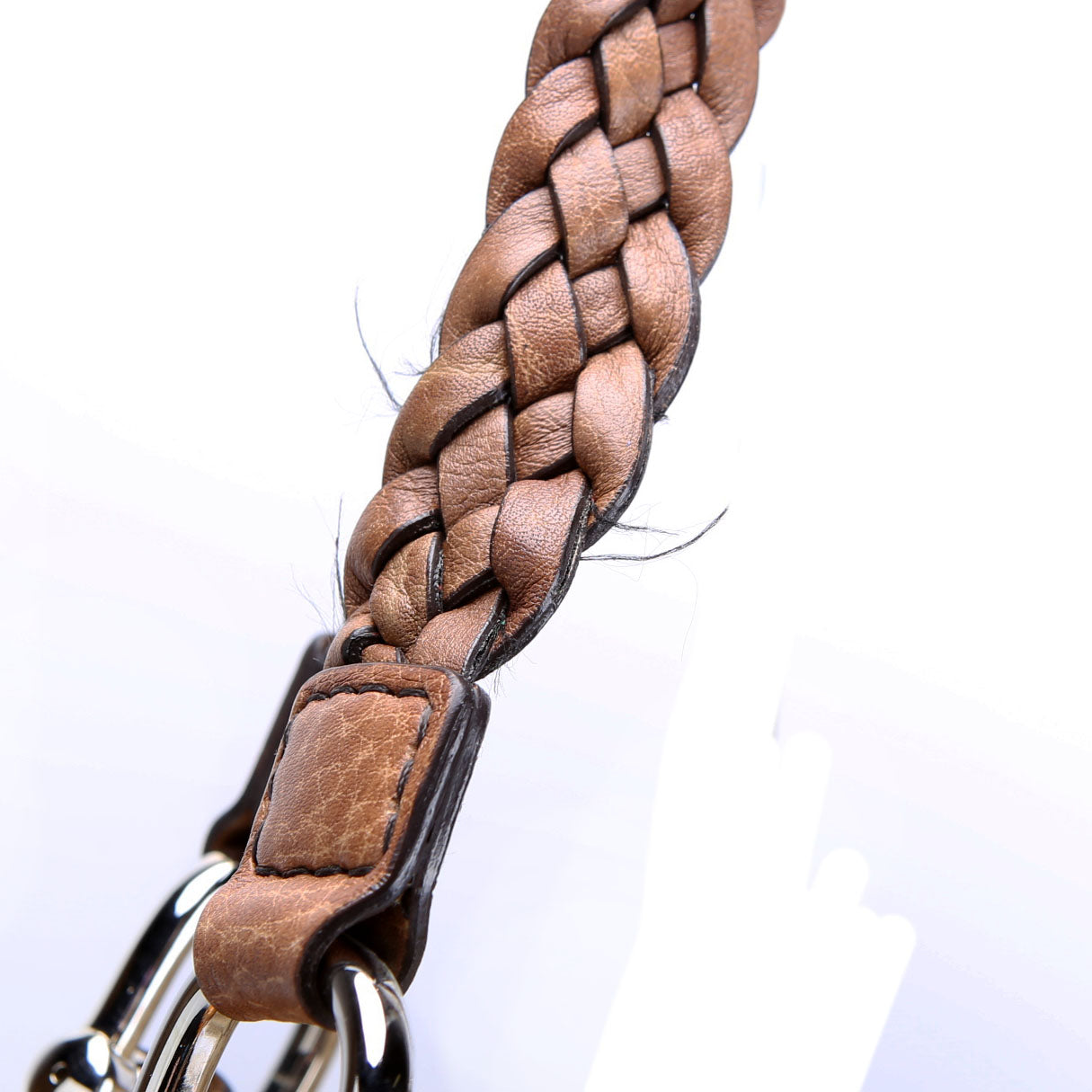 Strap: The leather strap shows wear and rubbing. There is stitch wear along the piping.