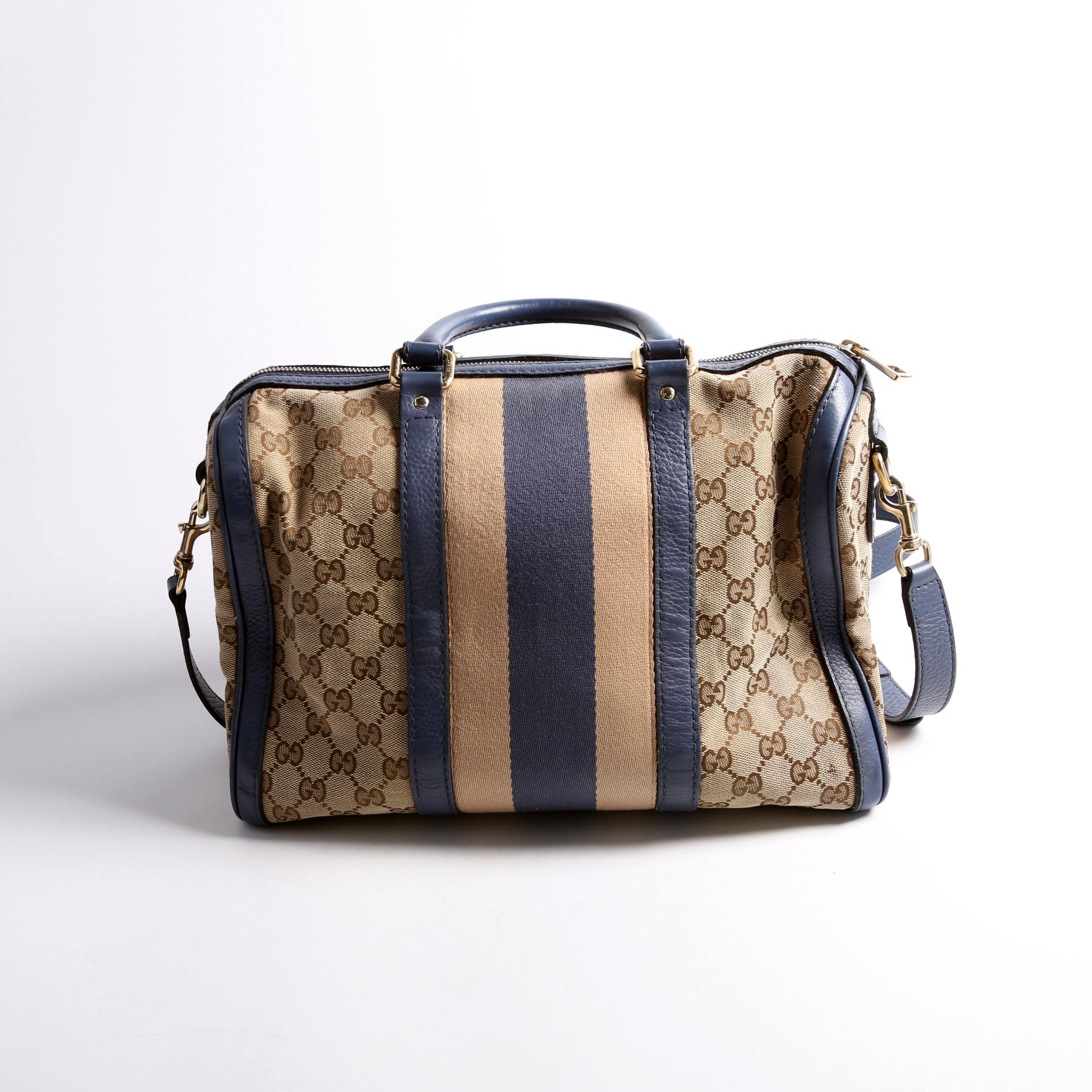 This pre-owned Gucci GG Canvas Boston Bag is guaranteed 100% authentic. The exterior is in the classic Gucci GG canvas.