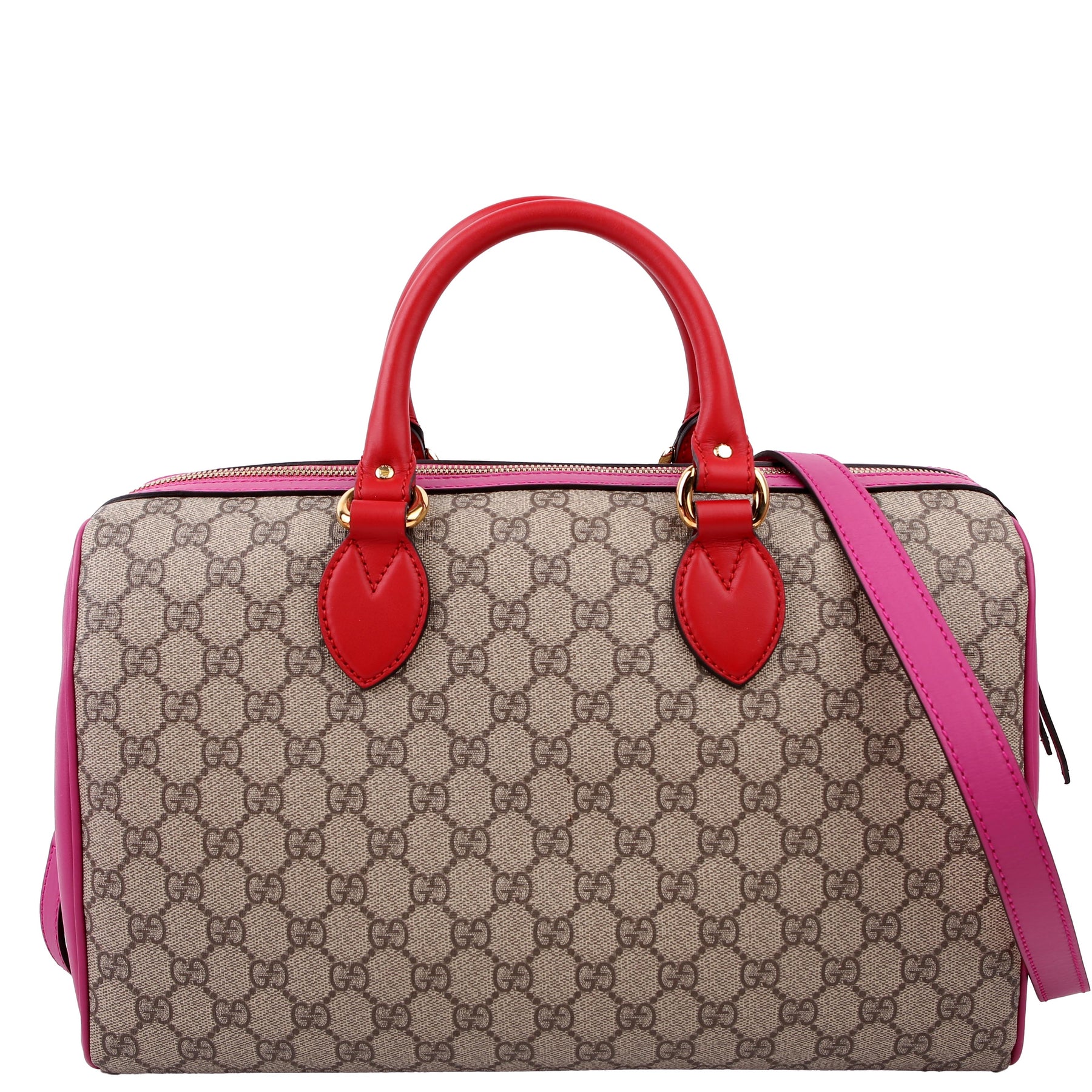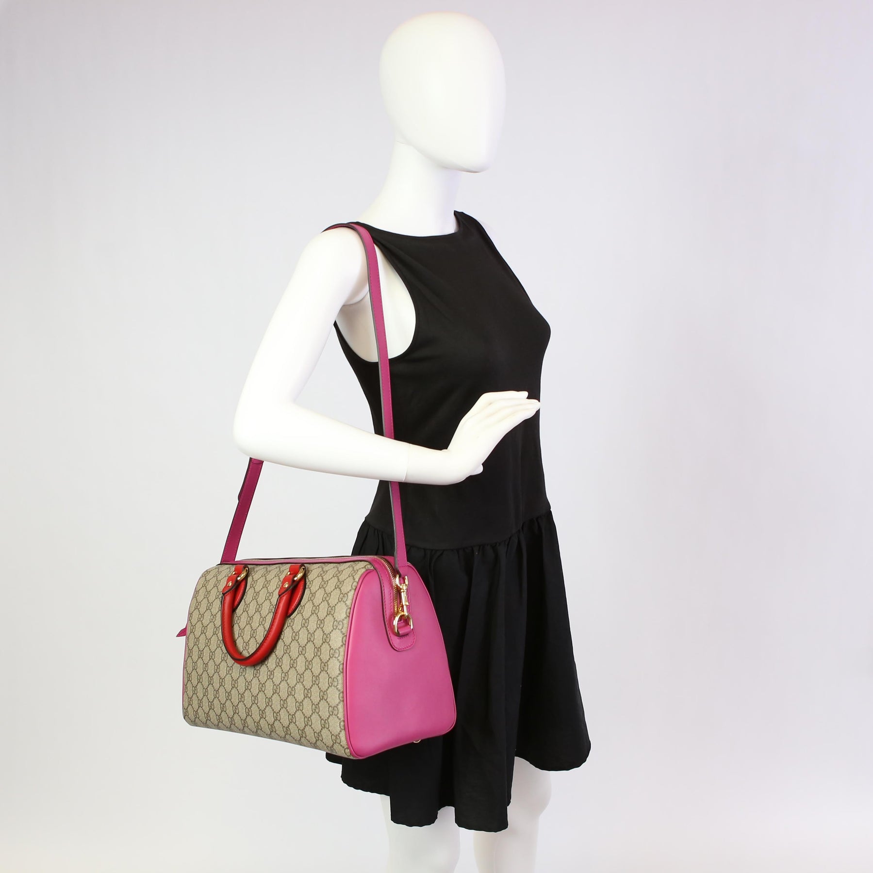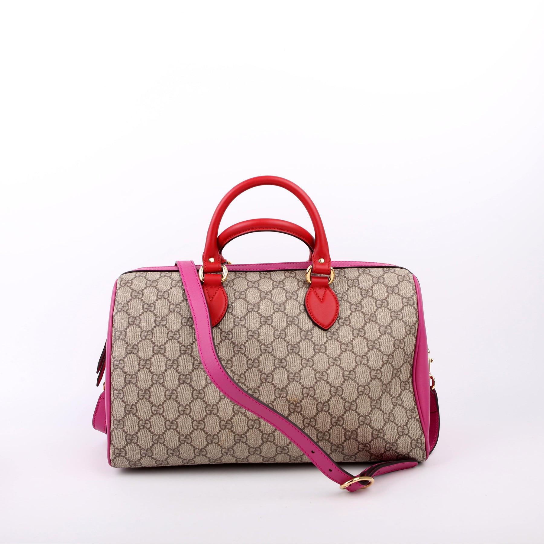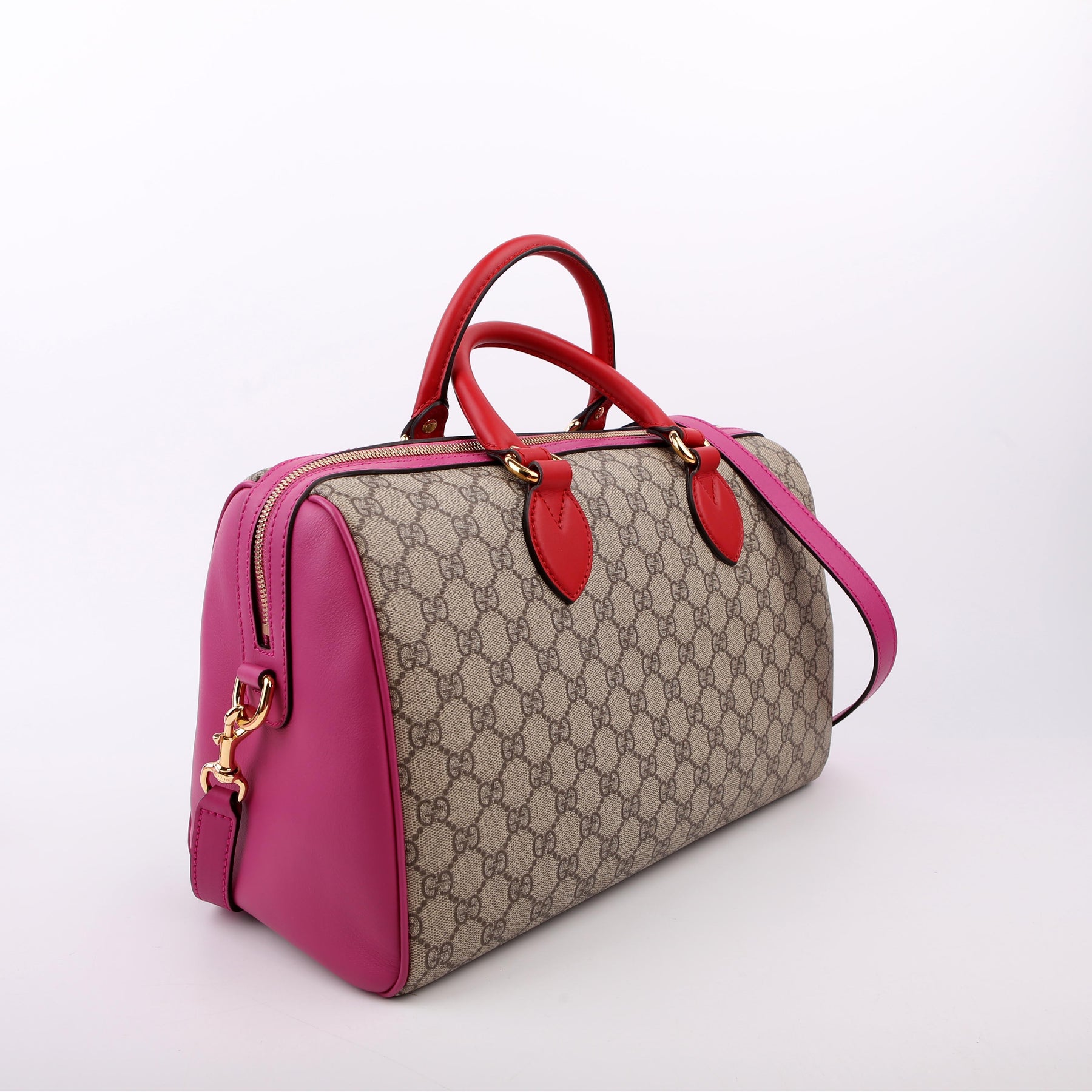 This pre-owned Gucci GG Supreme Boston Bag Large is guaranteed 100% authentic. The exterior is in the classic Gucci GG Supreme coated canvas.
