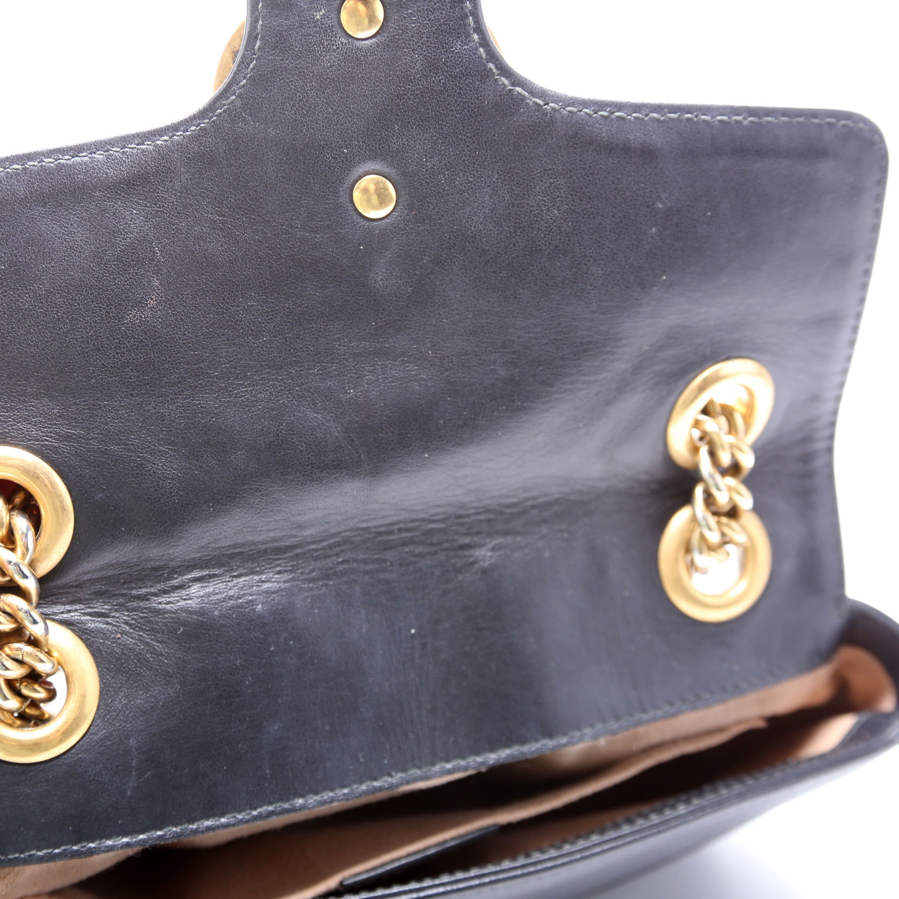 Interior: The interior has discoloration and staining throughout. The interior features one open pocket.