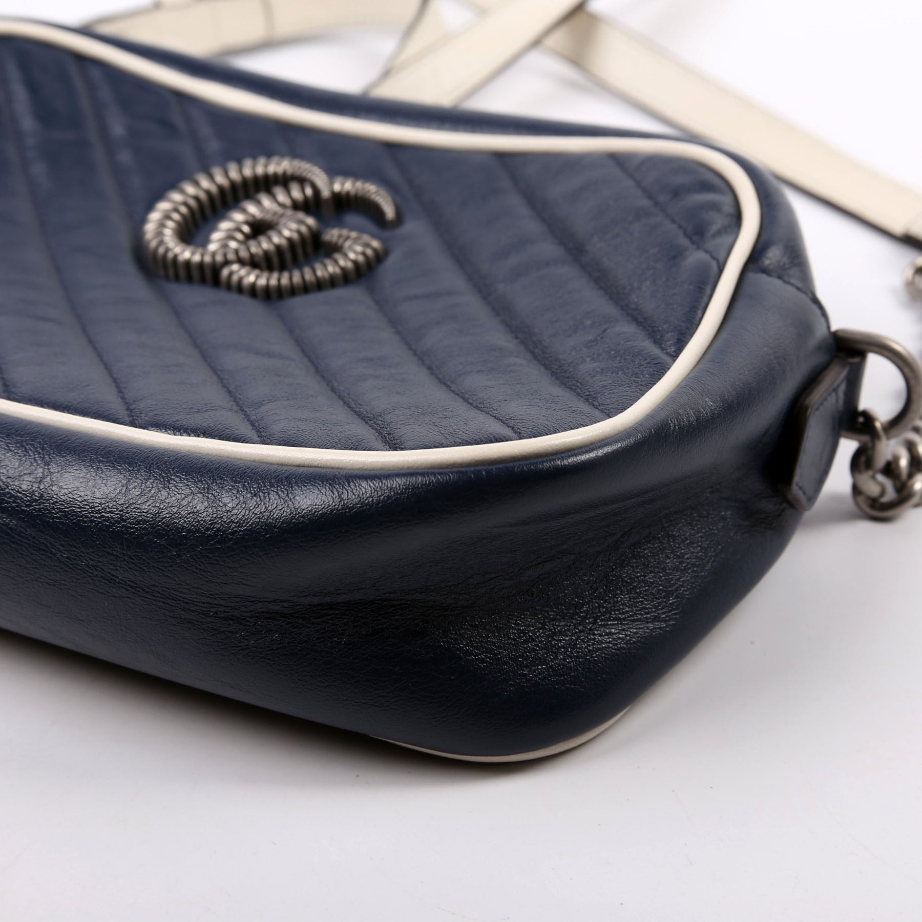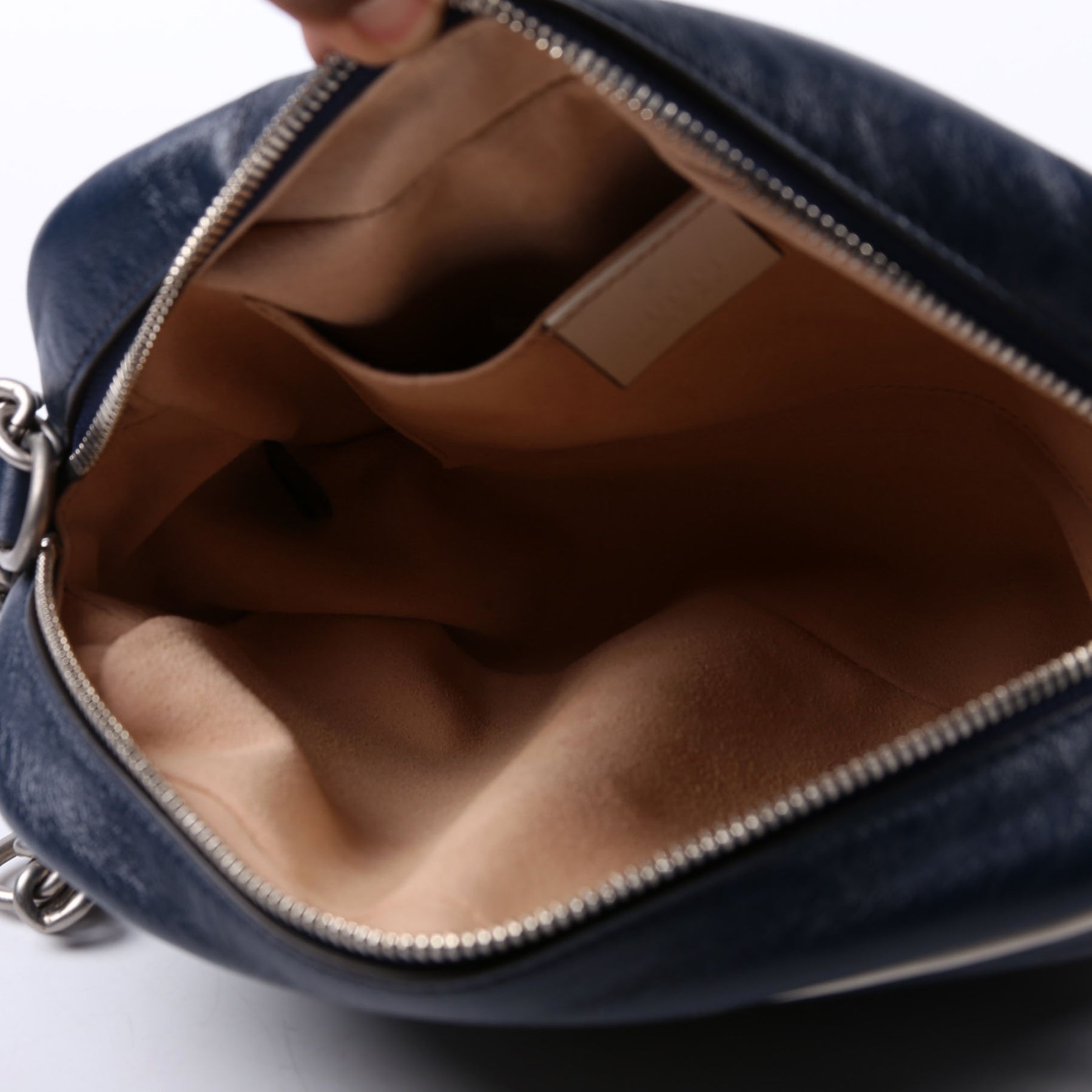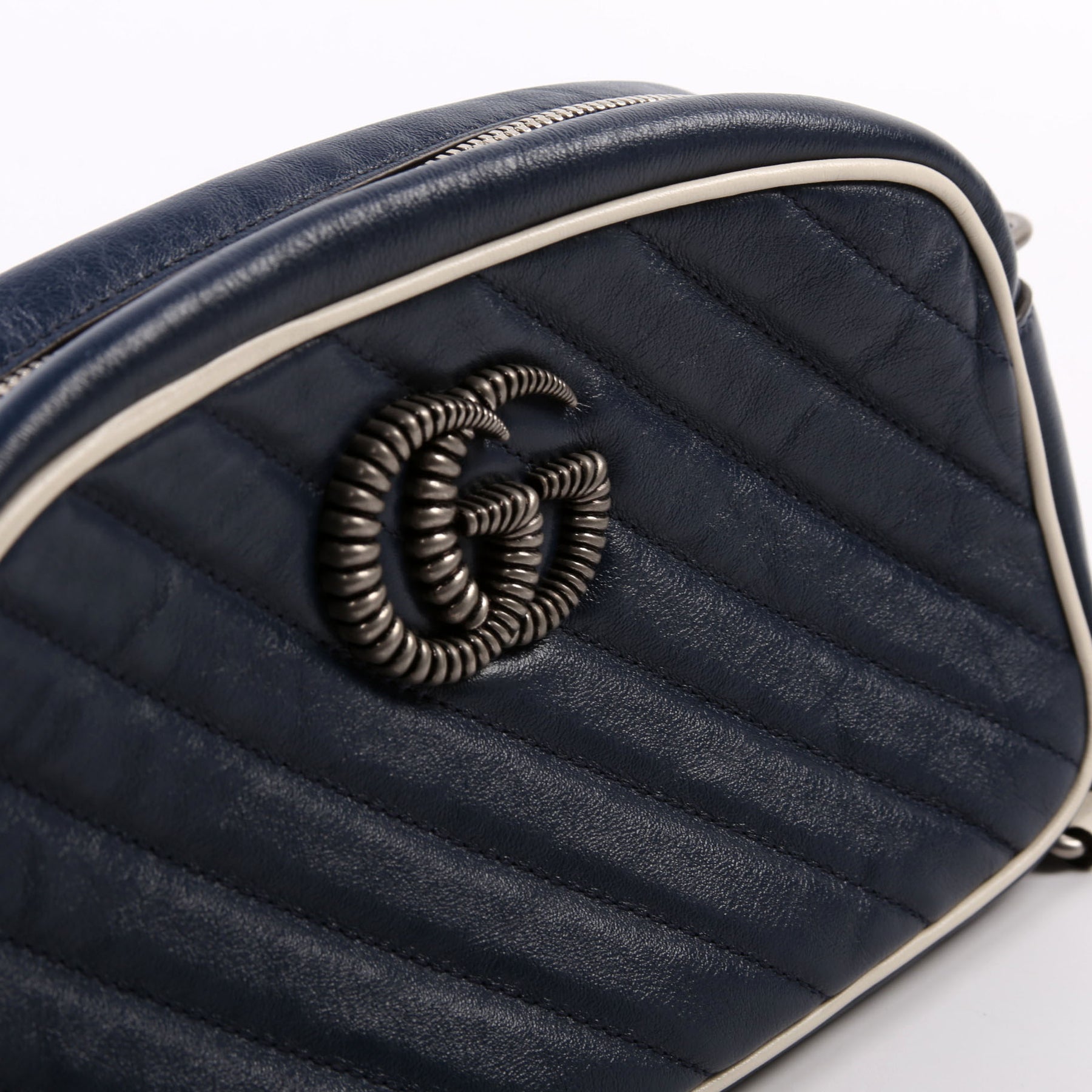 This pre-owned Gucci Marmont Camera Small is guaranteed 100% authentic.  The exterior is in the classic Gucci Marmont leather.