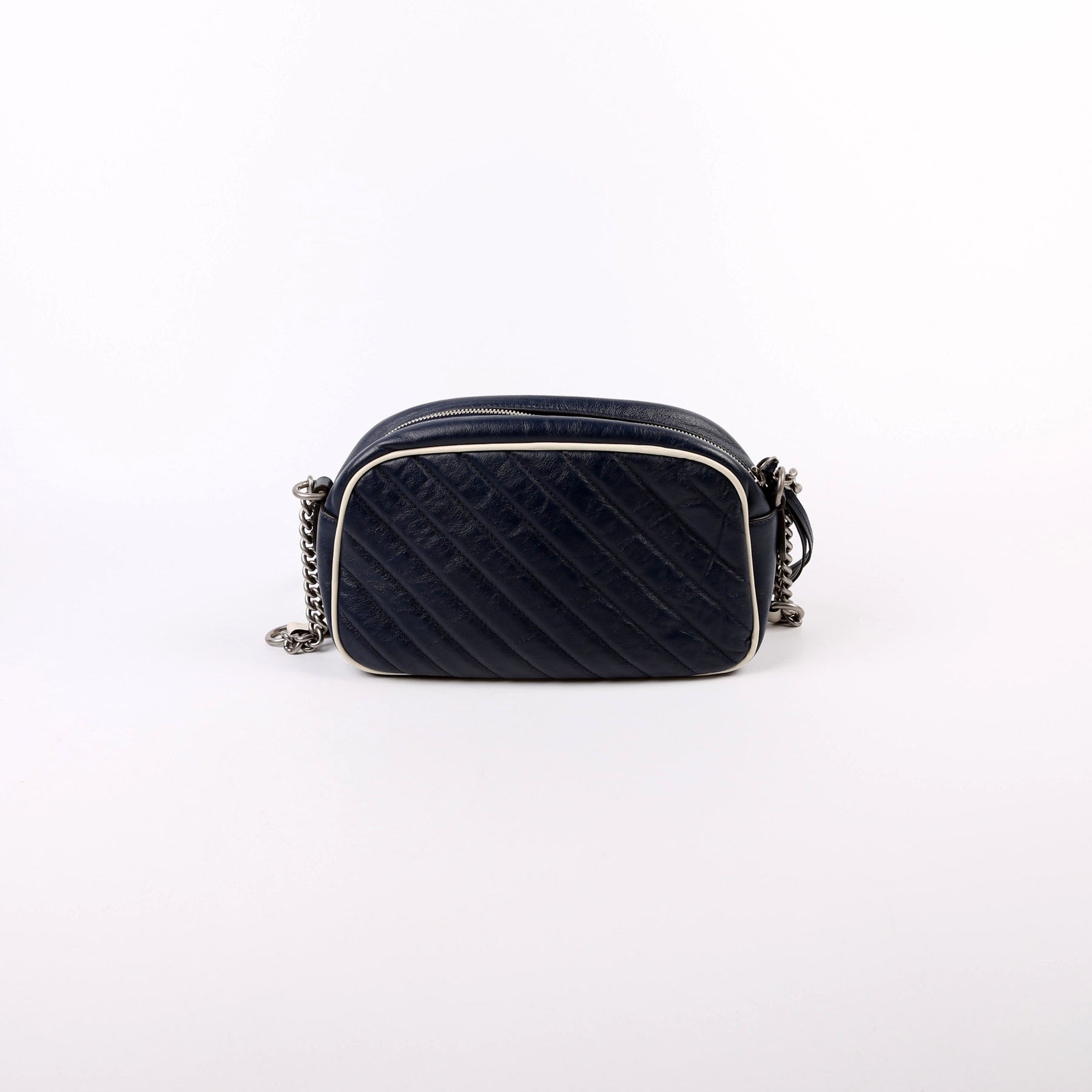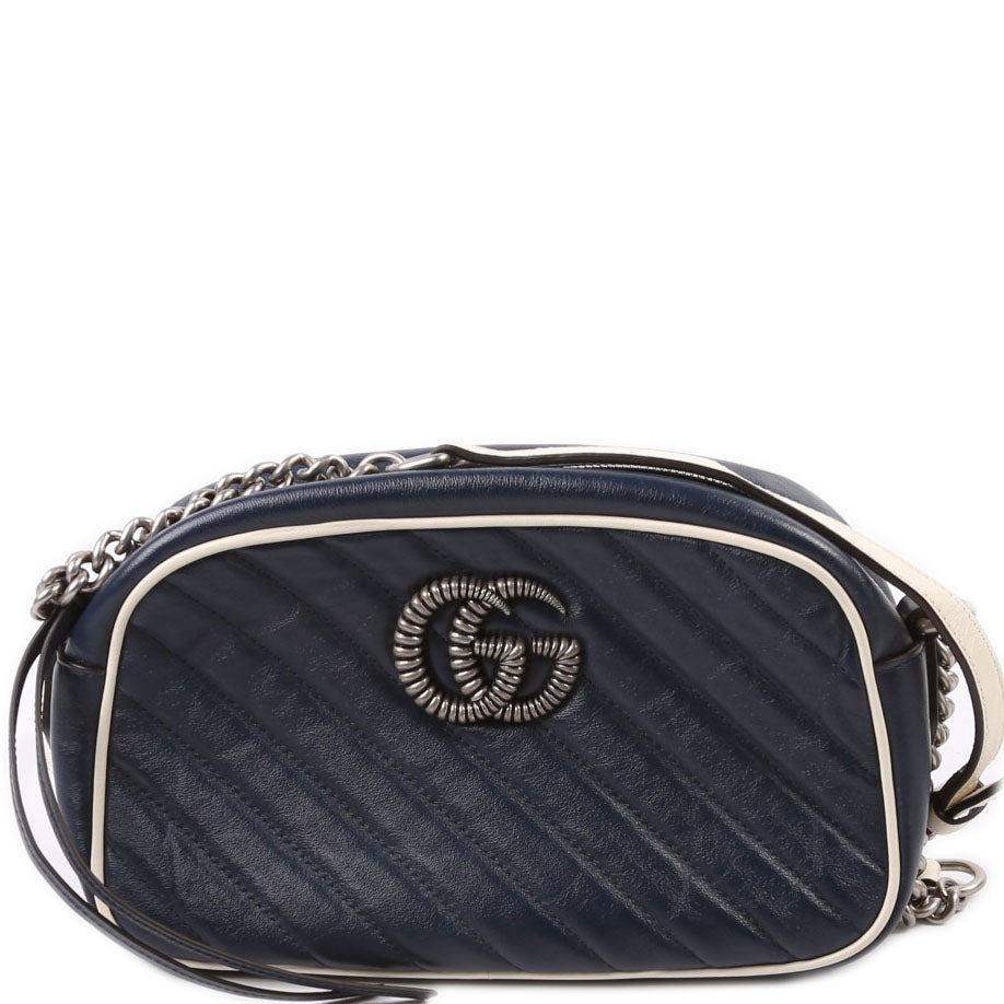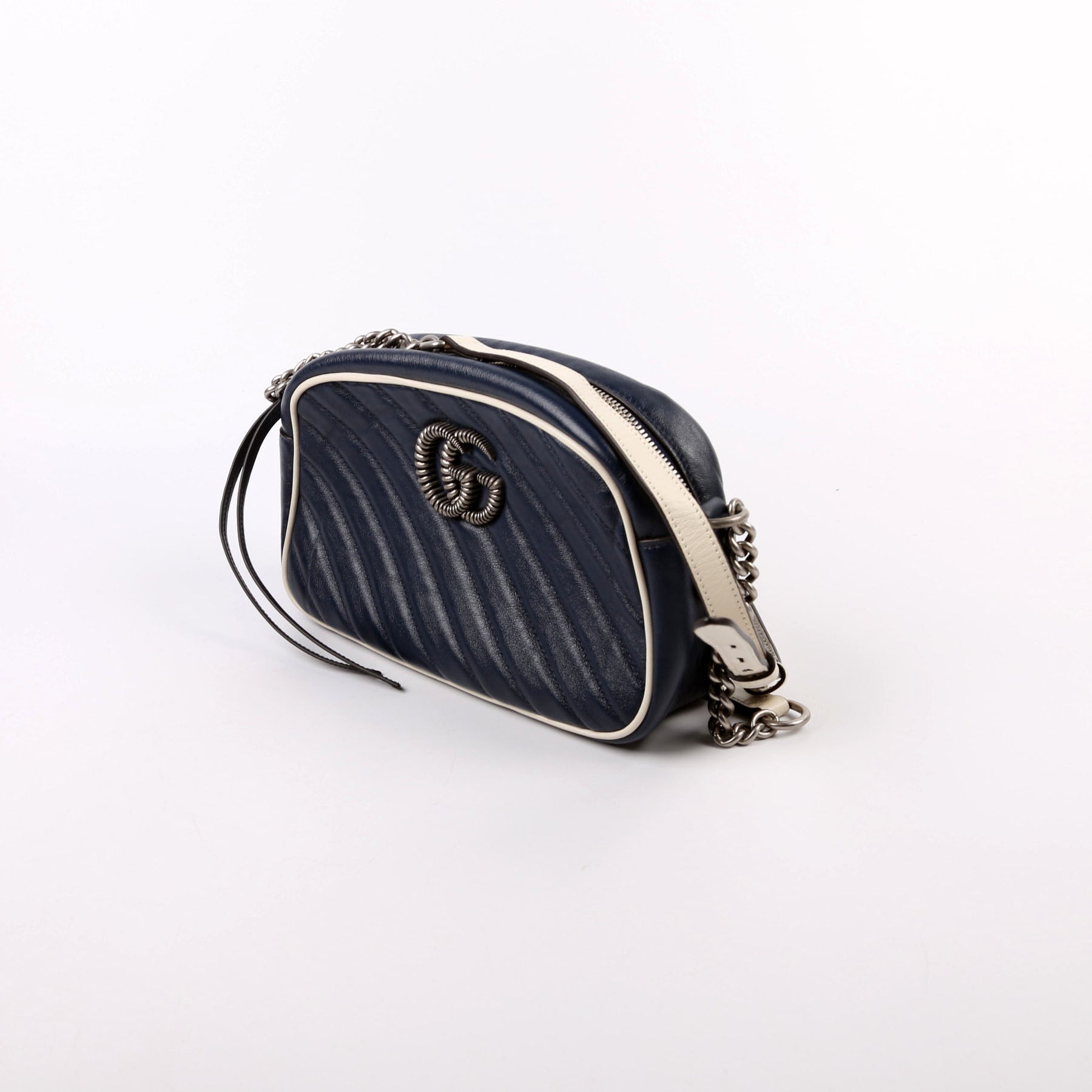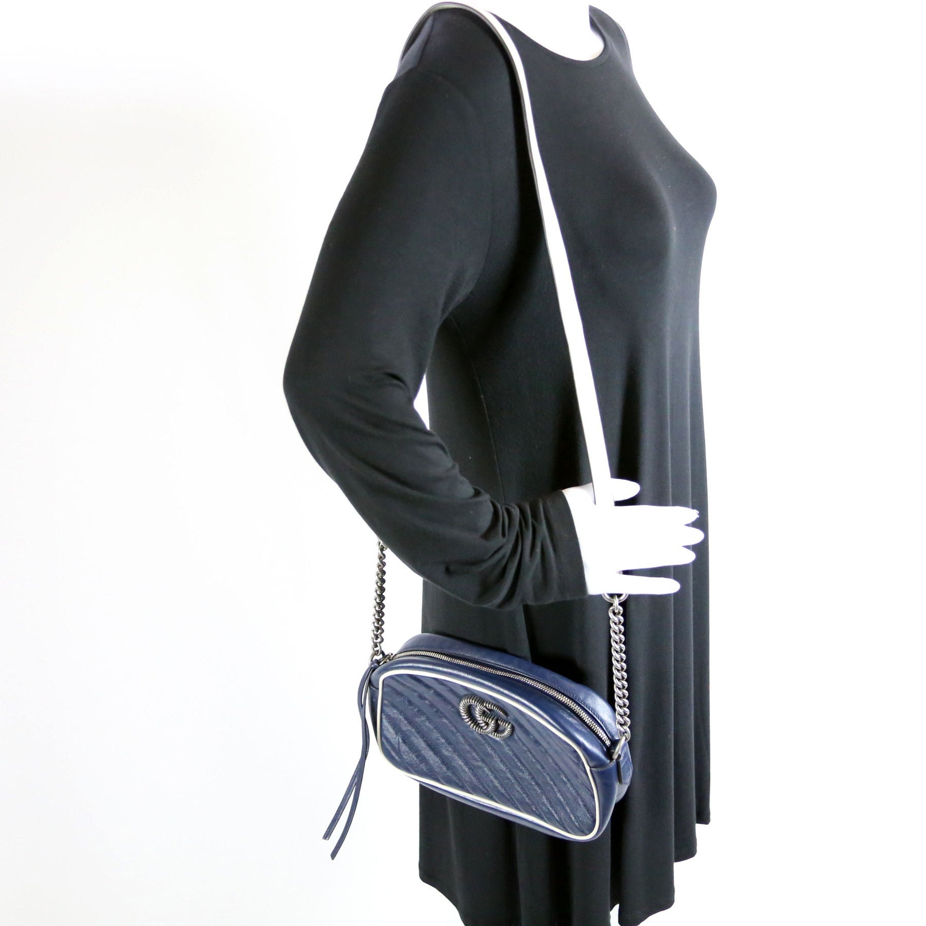 This pre-owned Gucci Marmont Camera Small is guaranteed 100% authentic.  The exterior is in the classic Gucci Marmont leather.