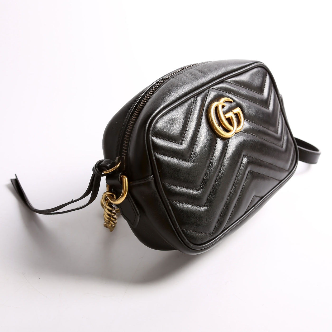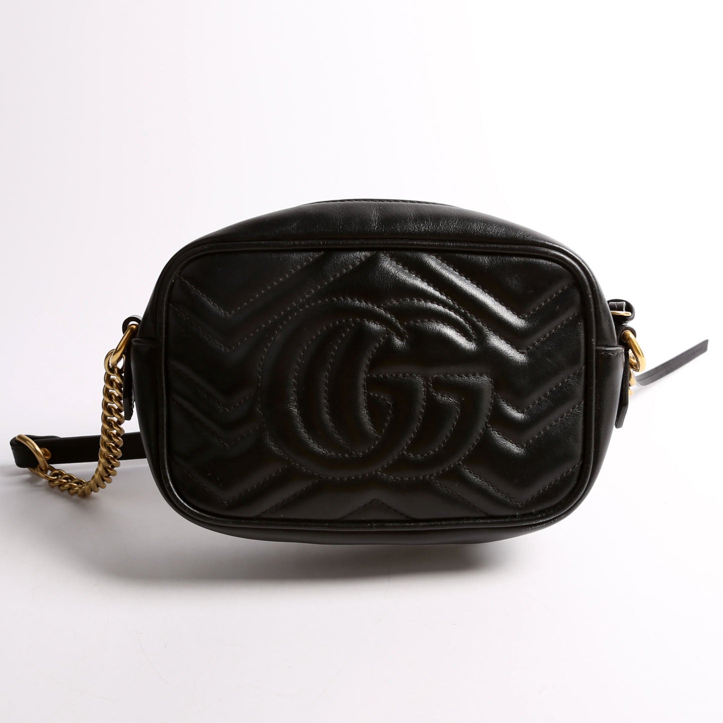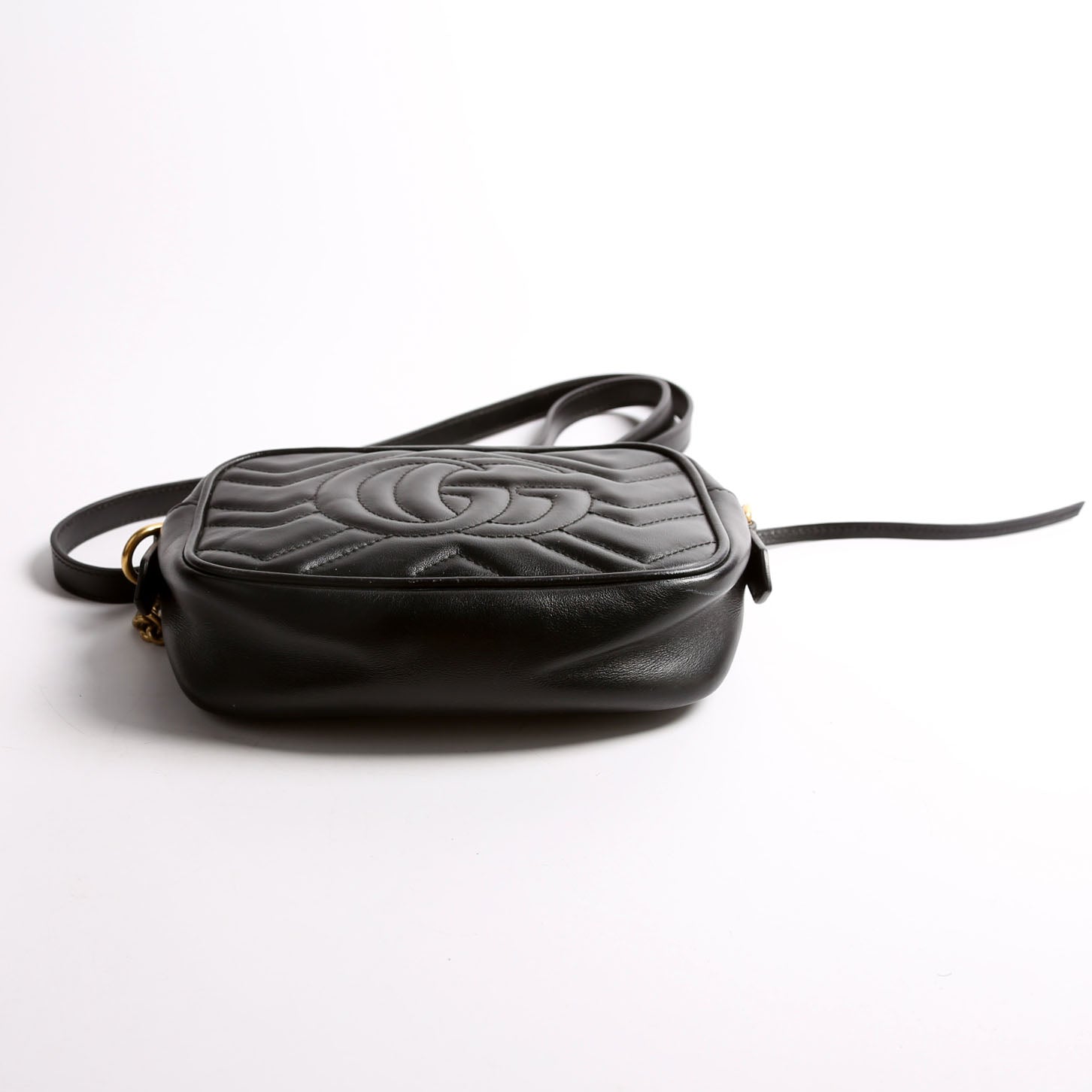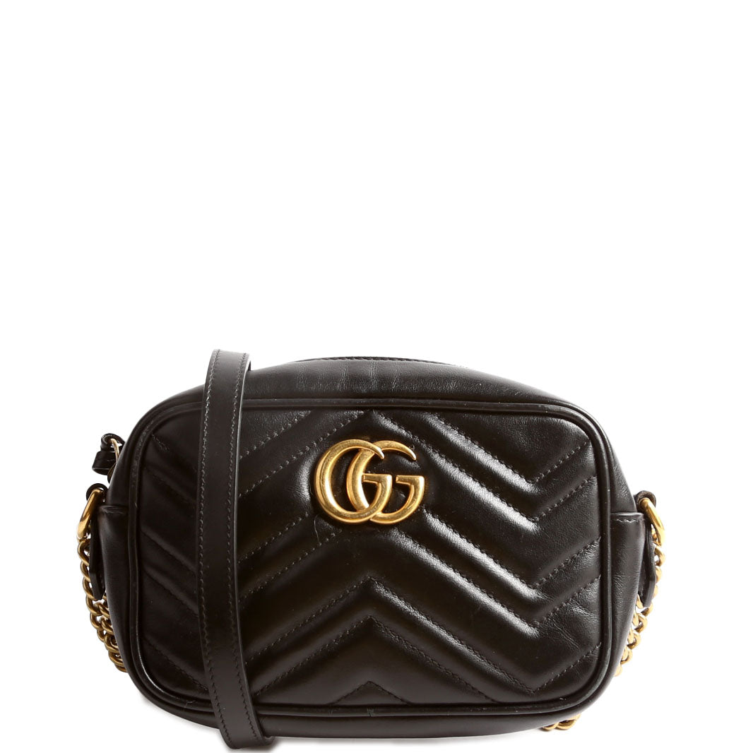 This pre-owned Marmont Mini Camera Bag is guaranteed 100% authentic. The exterior is in the classic Gucci Marmont leather.