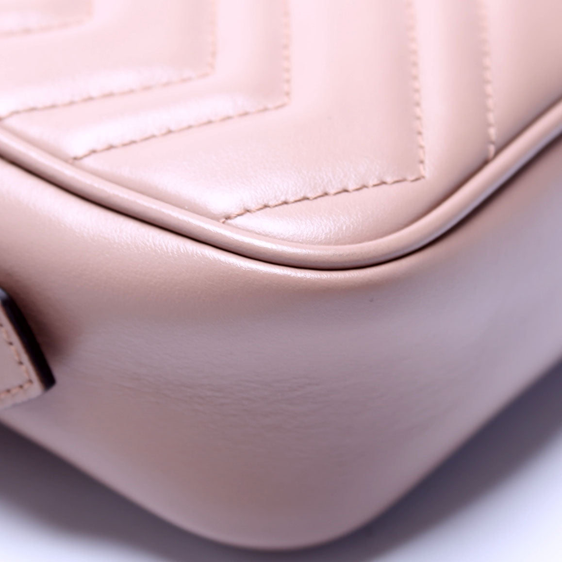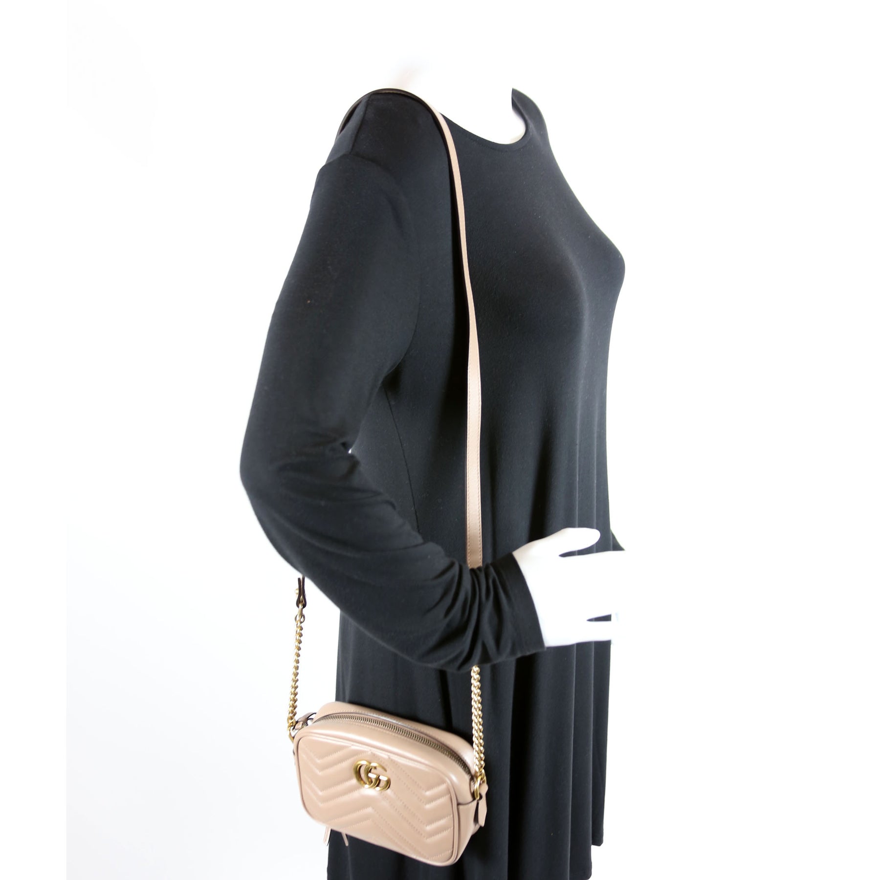 This pre-owned GG Marmont Mini Camera Bag is guaranteed 100% authentic. The exterior is in the classic Gucci Marmont leather.