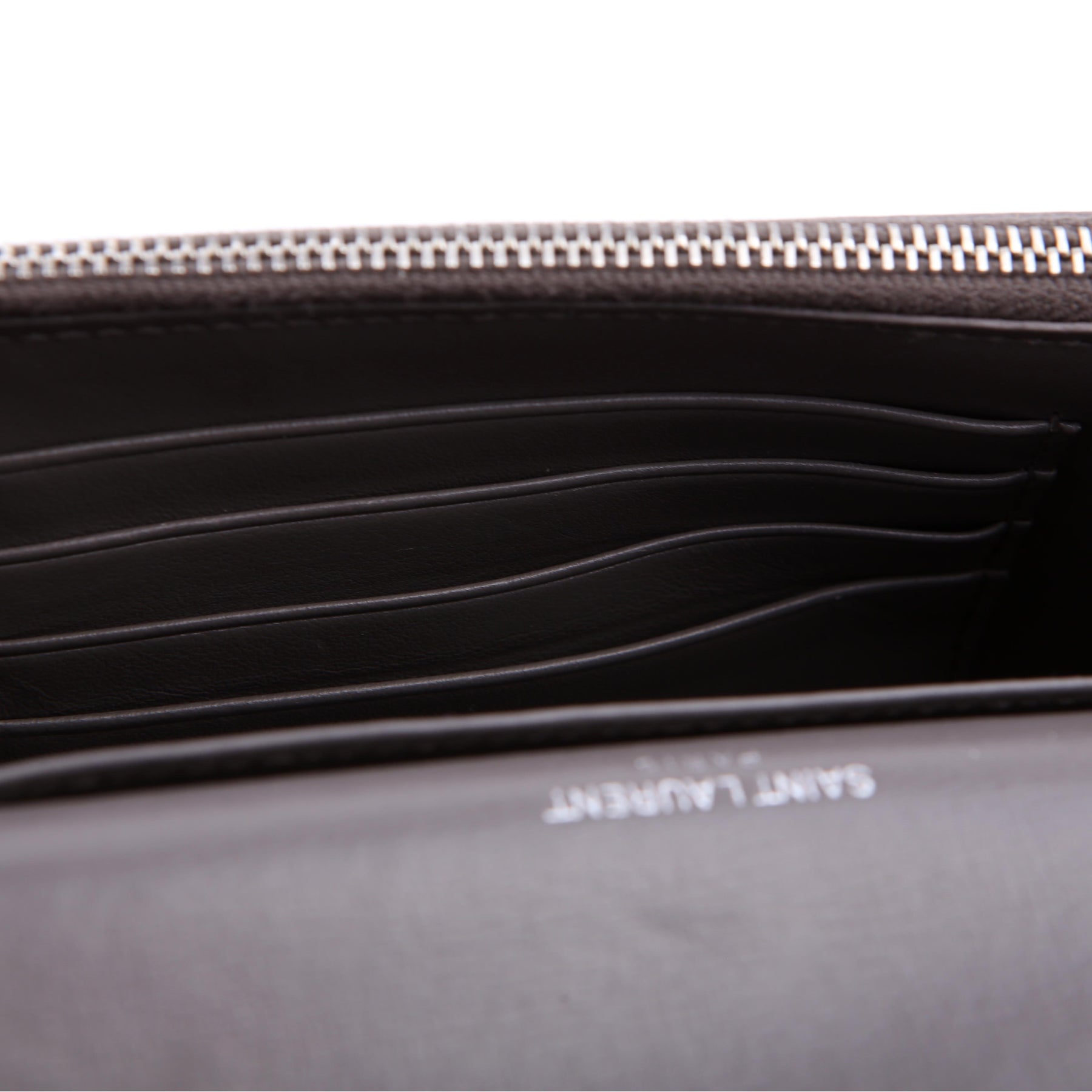 Interior: The interior has light scuffs throughout. The interior features six card slots, one open pocket, and one zip closure pocket.