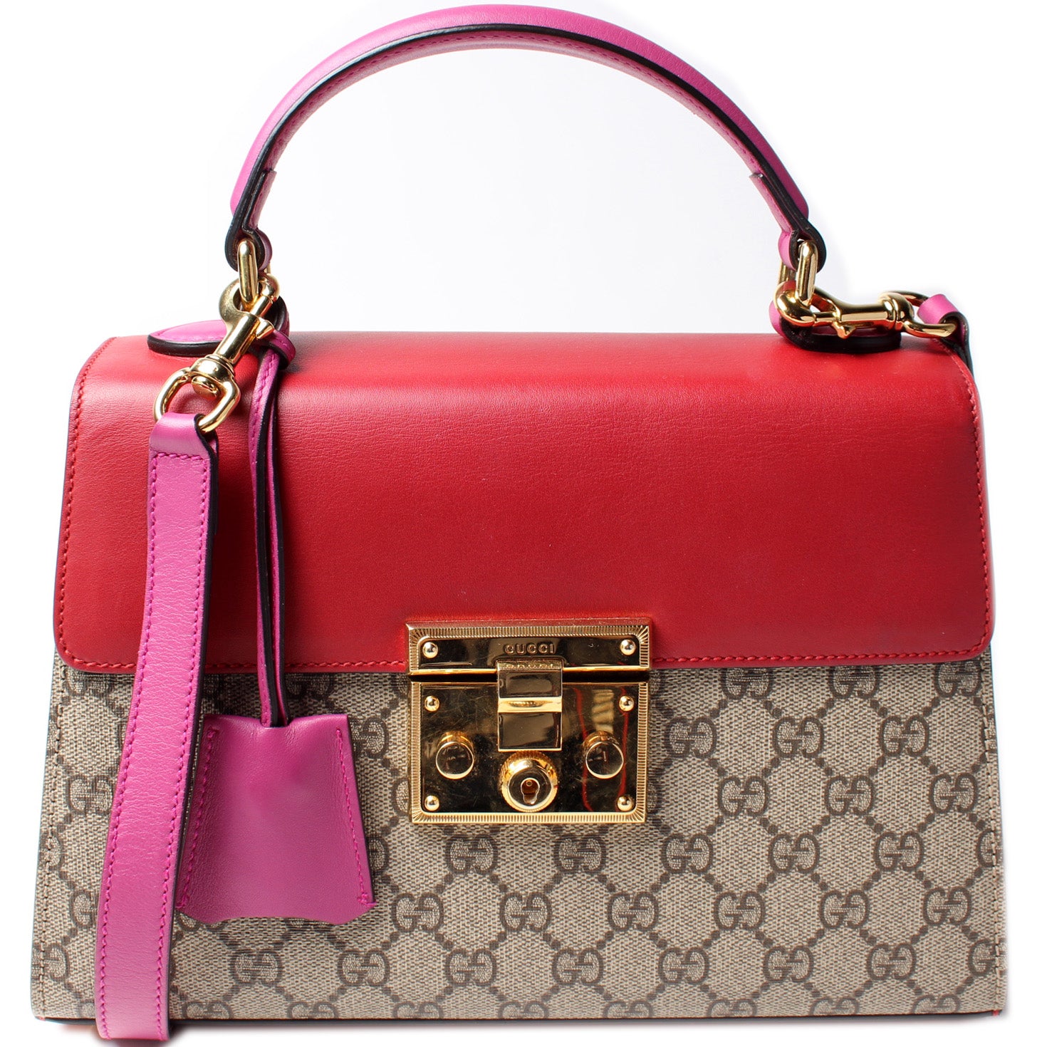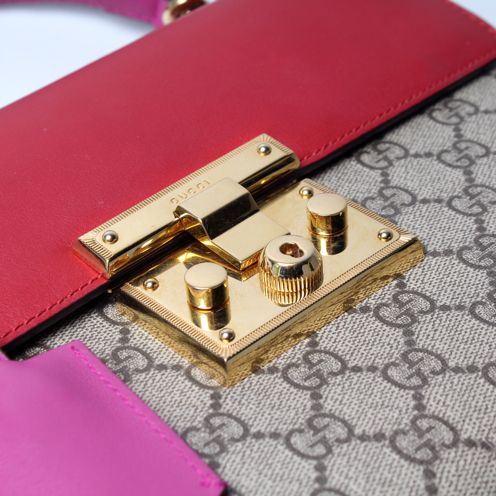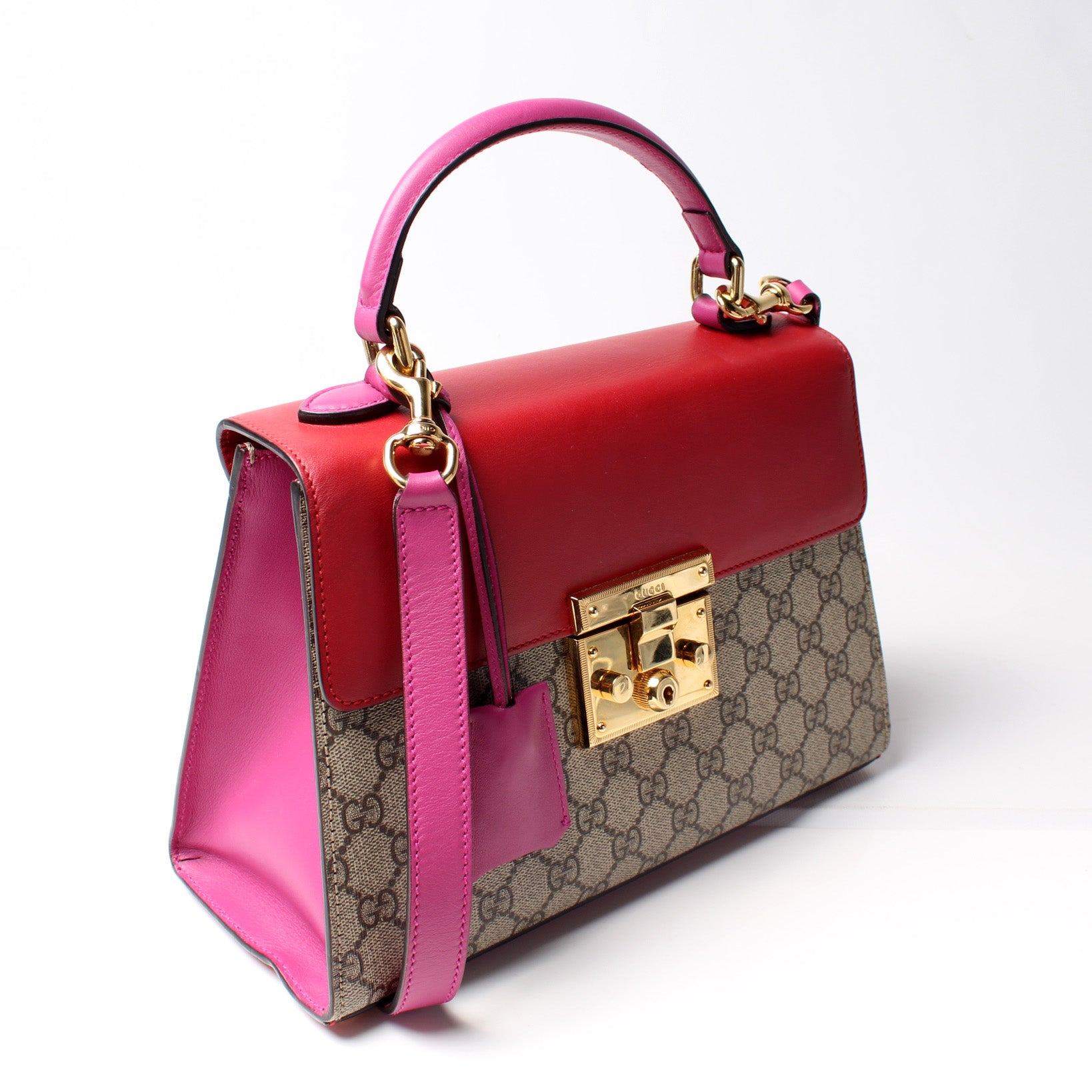 This pre-owned Gucci Padlock Leather Top Handle Small is guaranteed 100% authentic. The exterior is in the classic GG Supreme coated canvas.