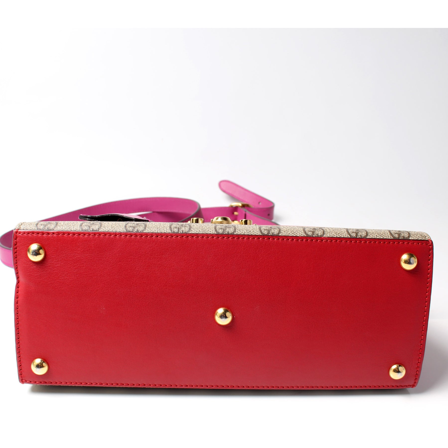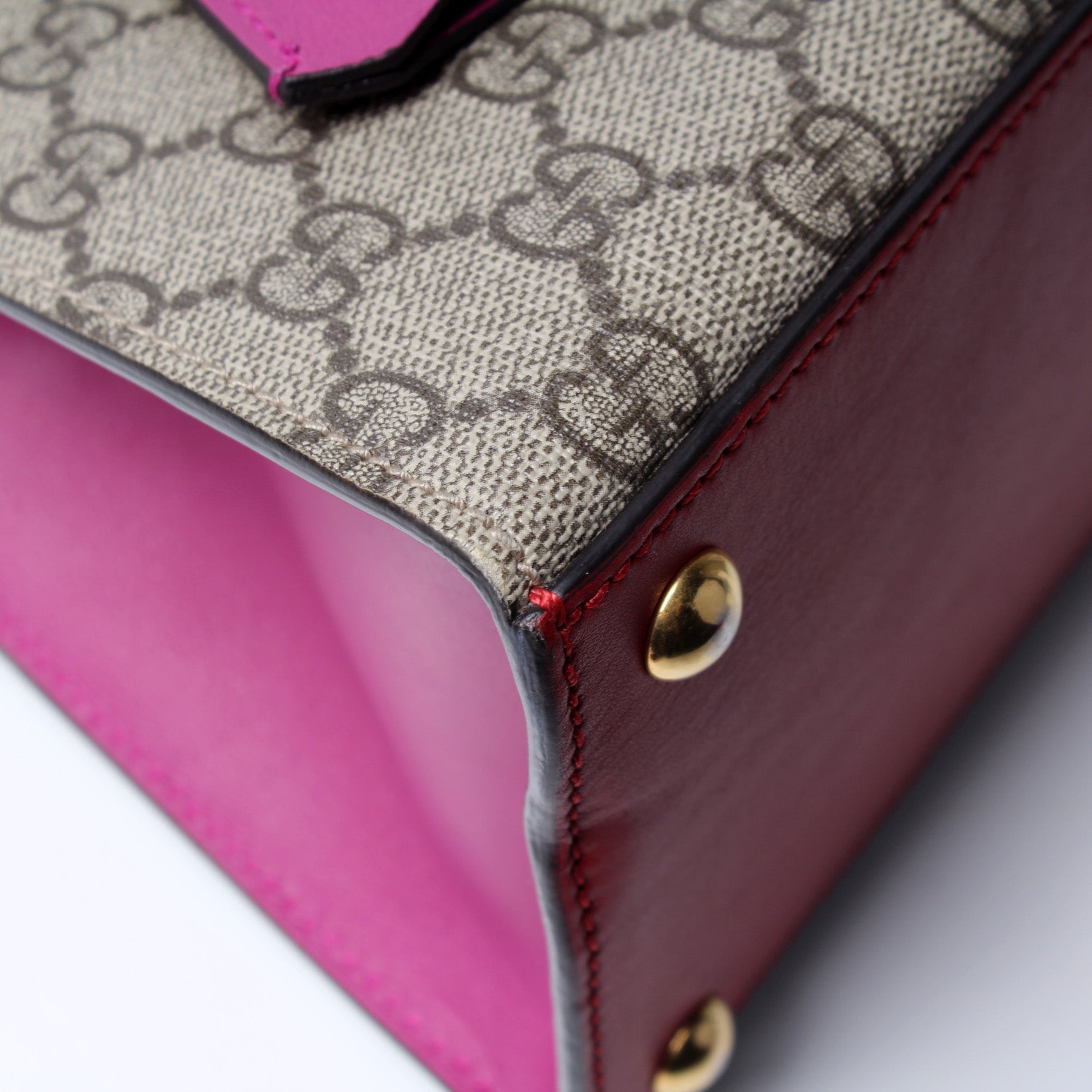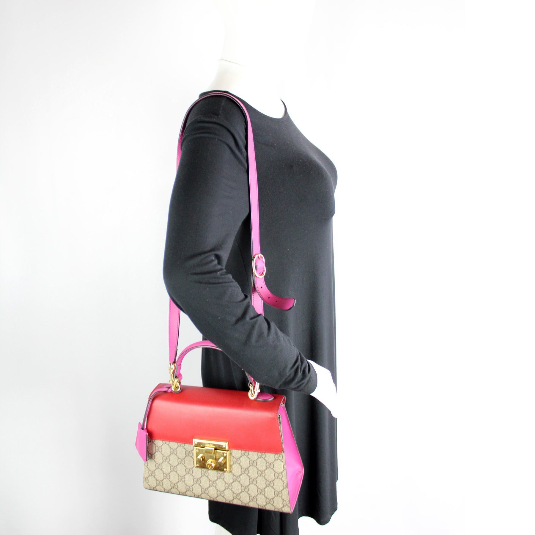 This pre-owned Gucci Padlock Leather Top Handle Small is guaranteed 100% authentic. The exterior is in the classic GG Supreme coated canvas.
