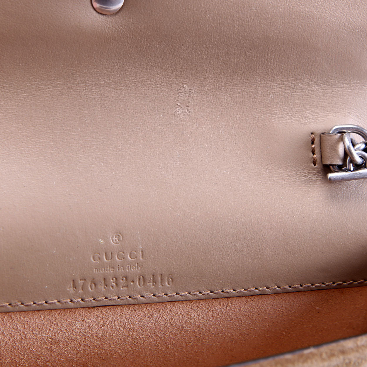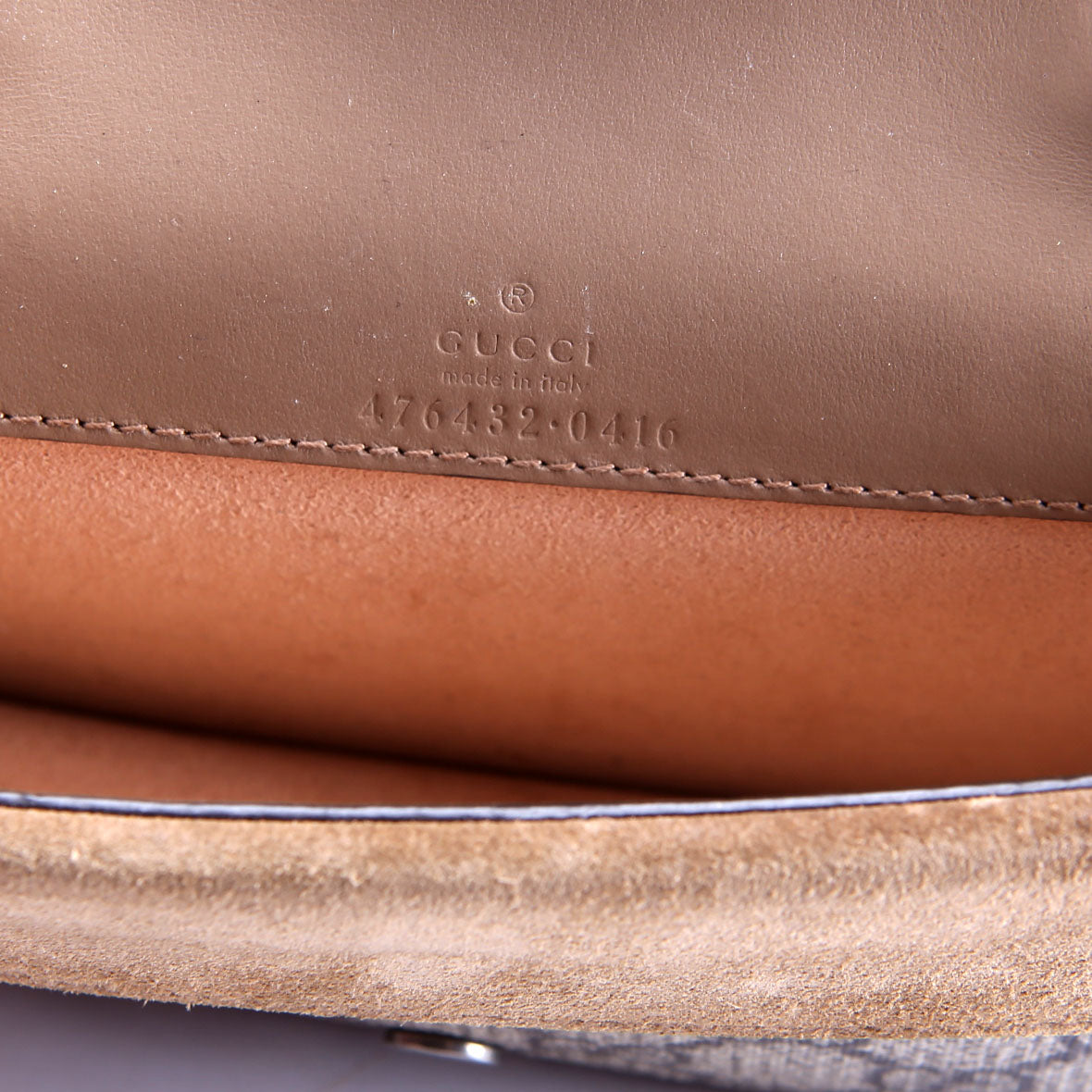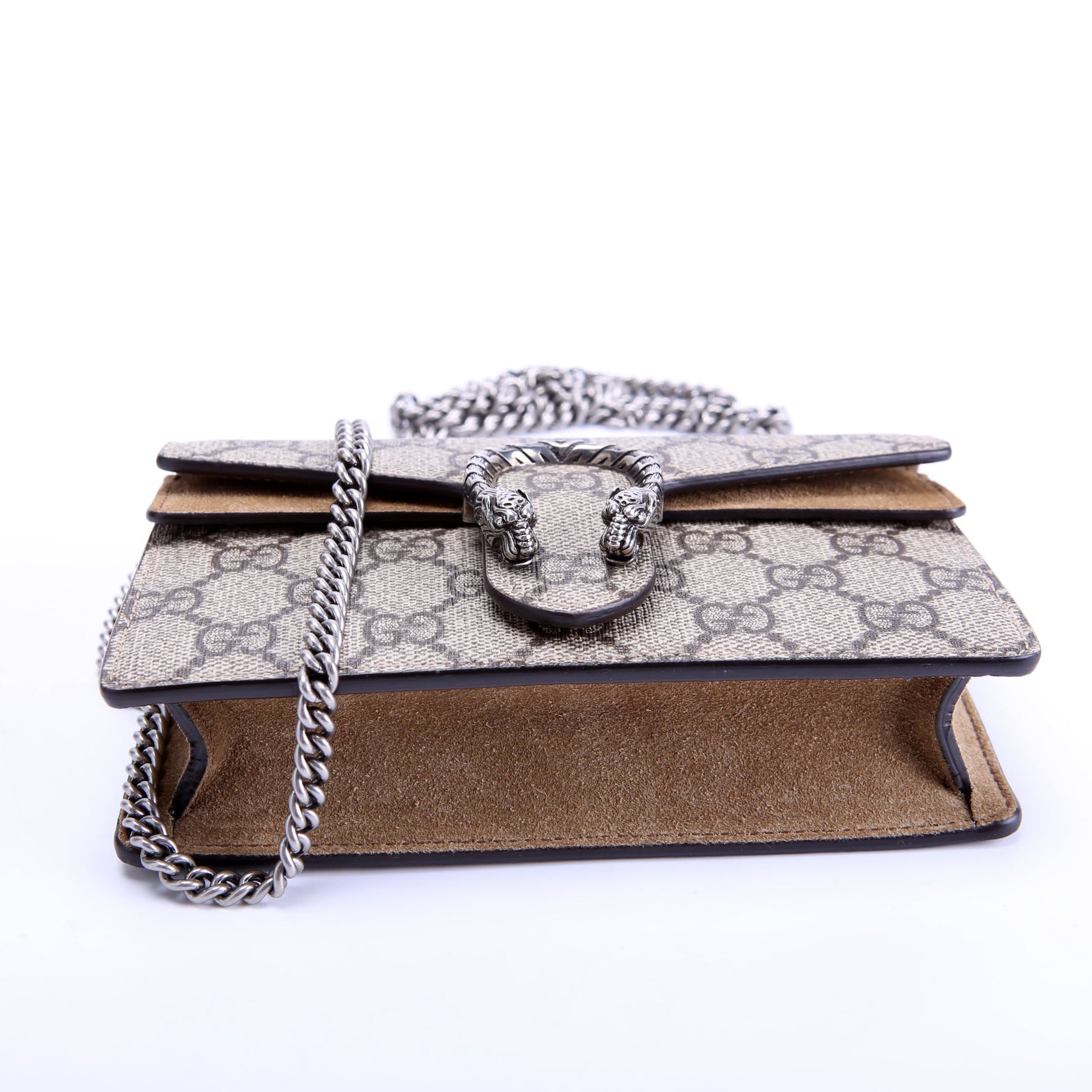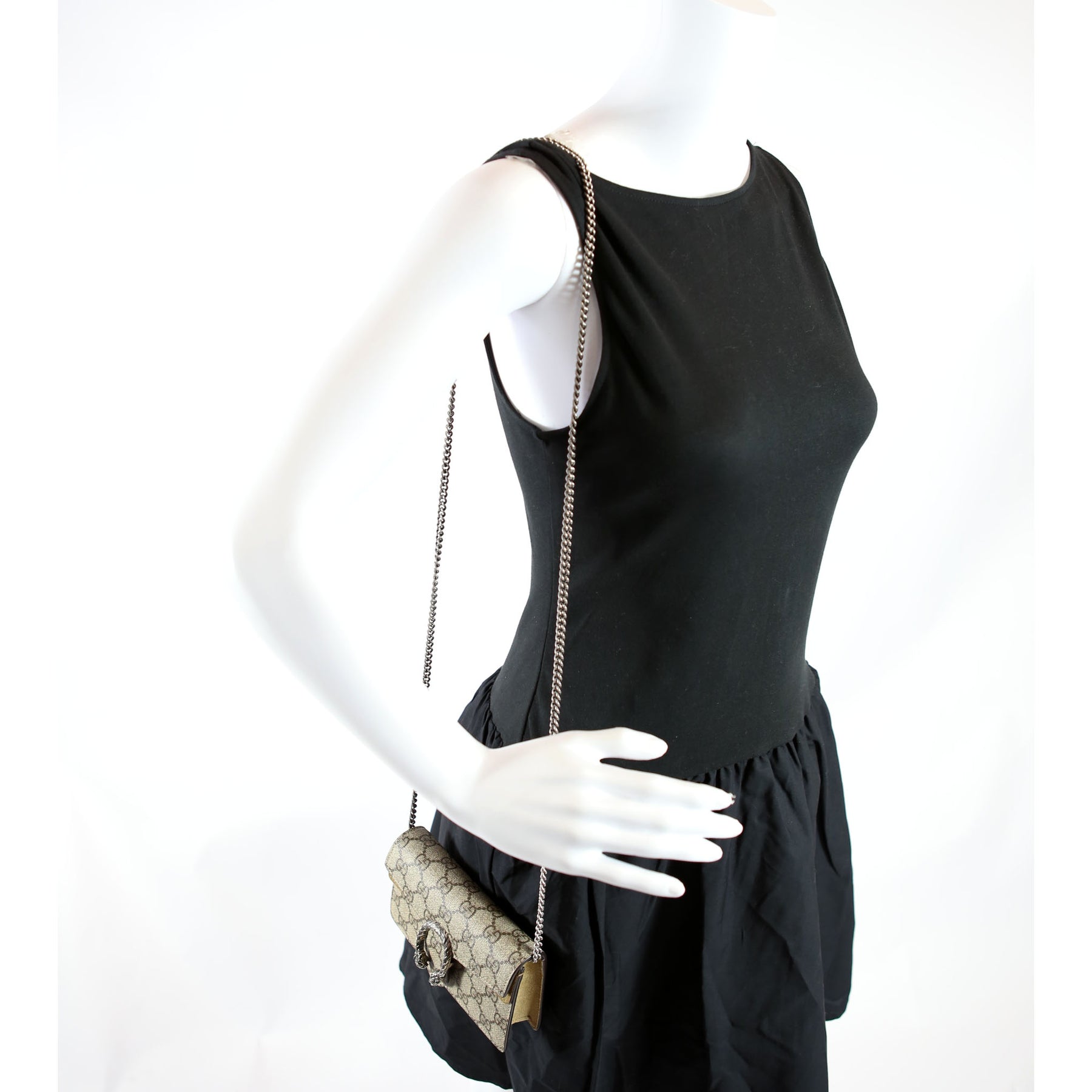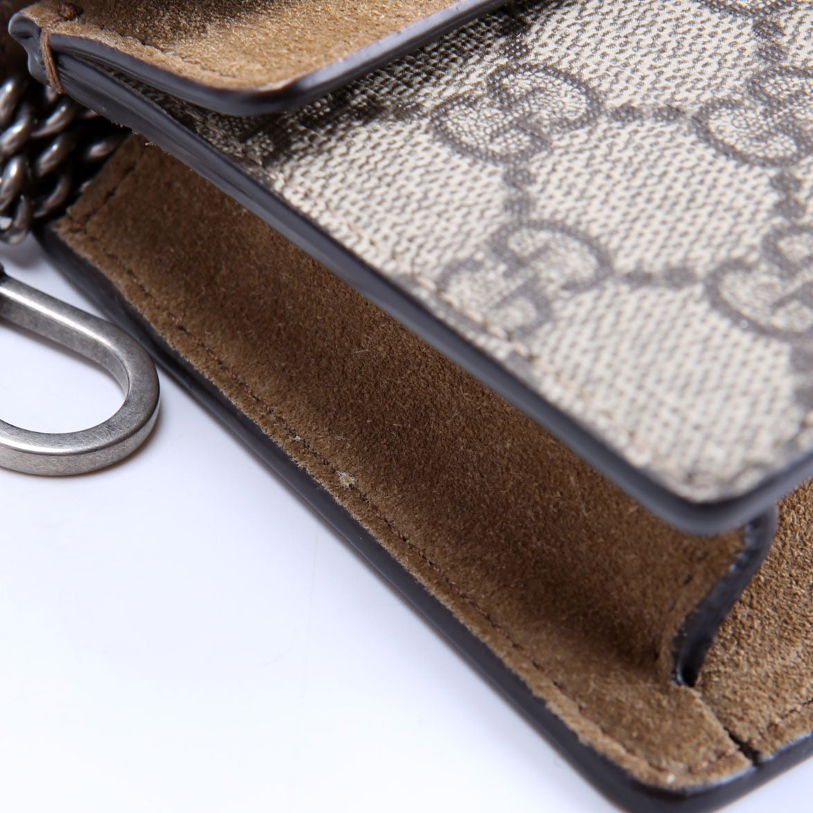 This pre-owned Gucci Dionysus GG Super Mini is guaranteed 100% authentic. The exterior is in the classic GG Supreme coated canvas.