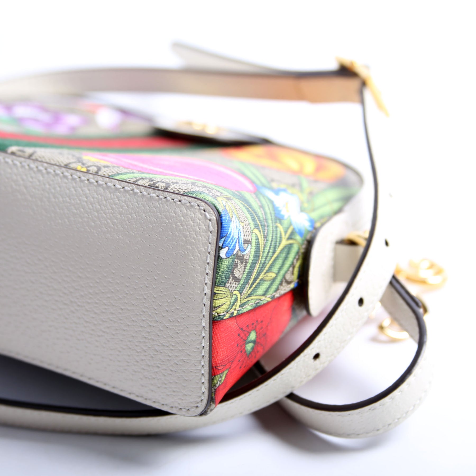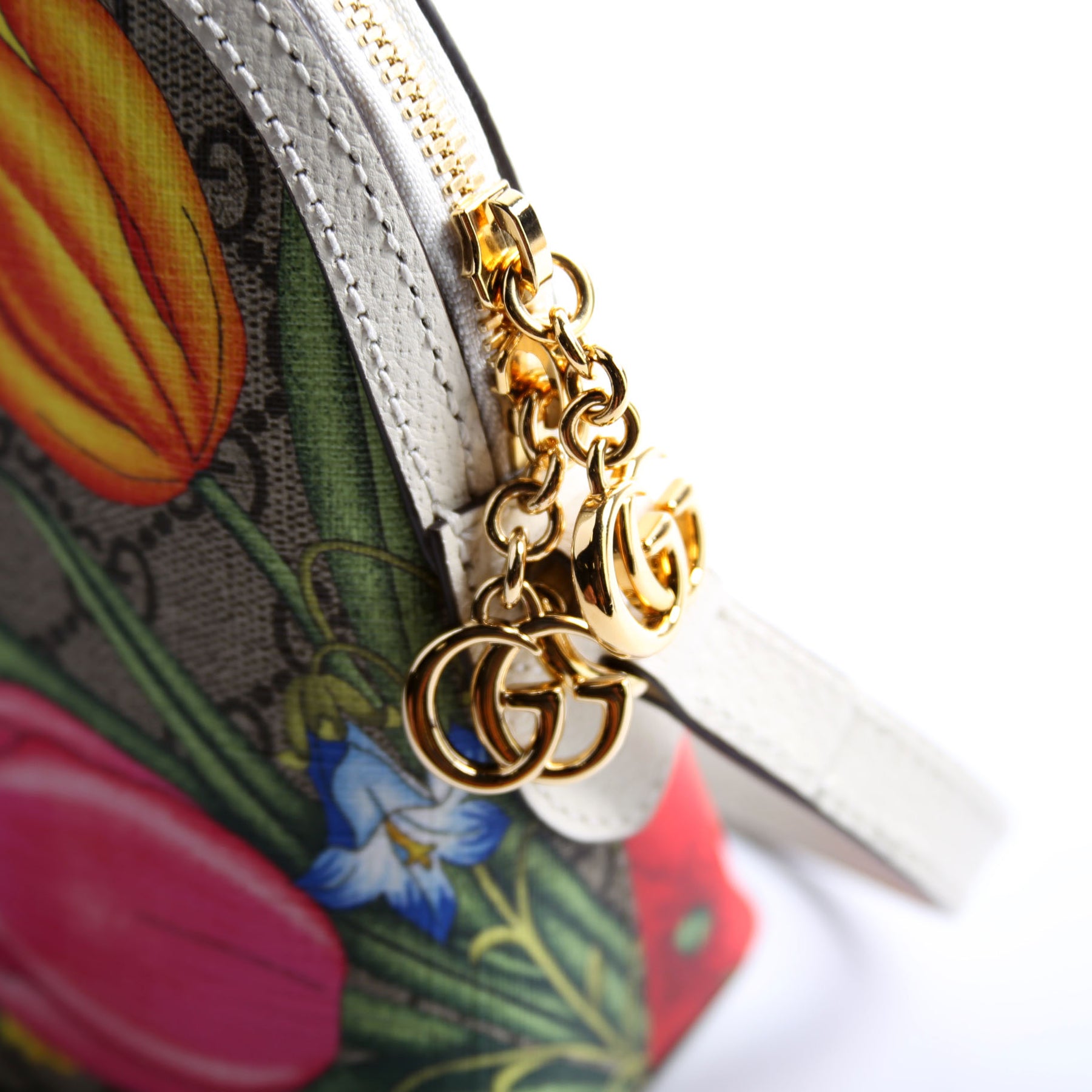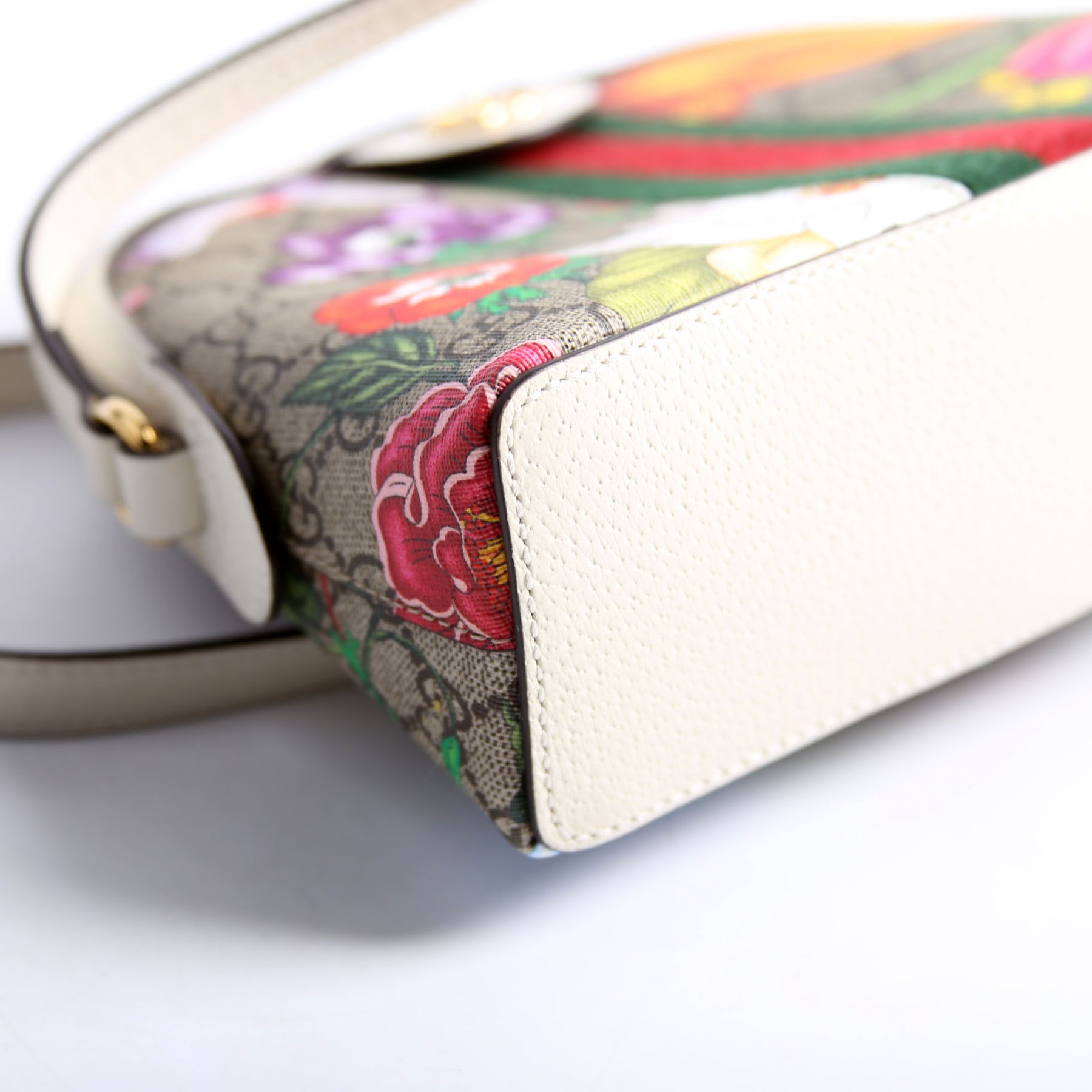This pre-owned Gucci Ophidia GG Flora Small Crossbody is guaranteed 100% authentic. The exterior is in the classic Gucci GG Flora Canvas.