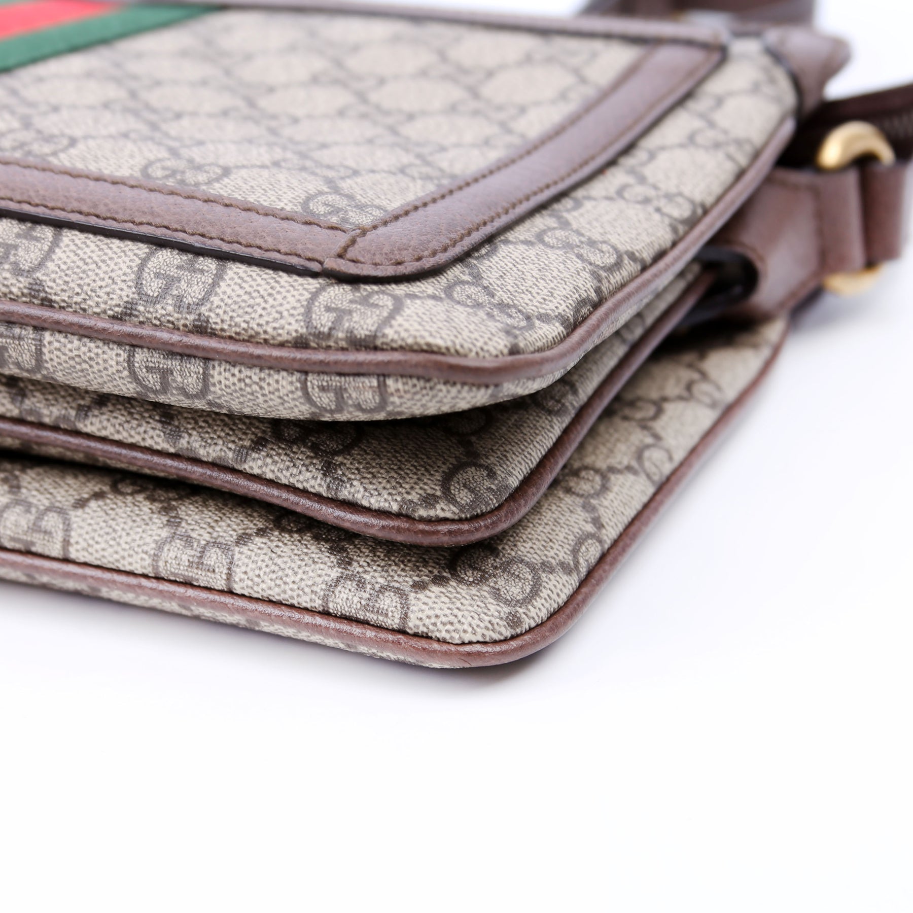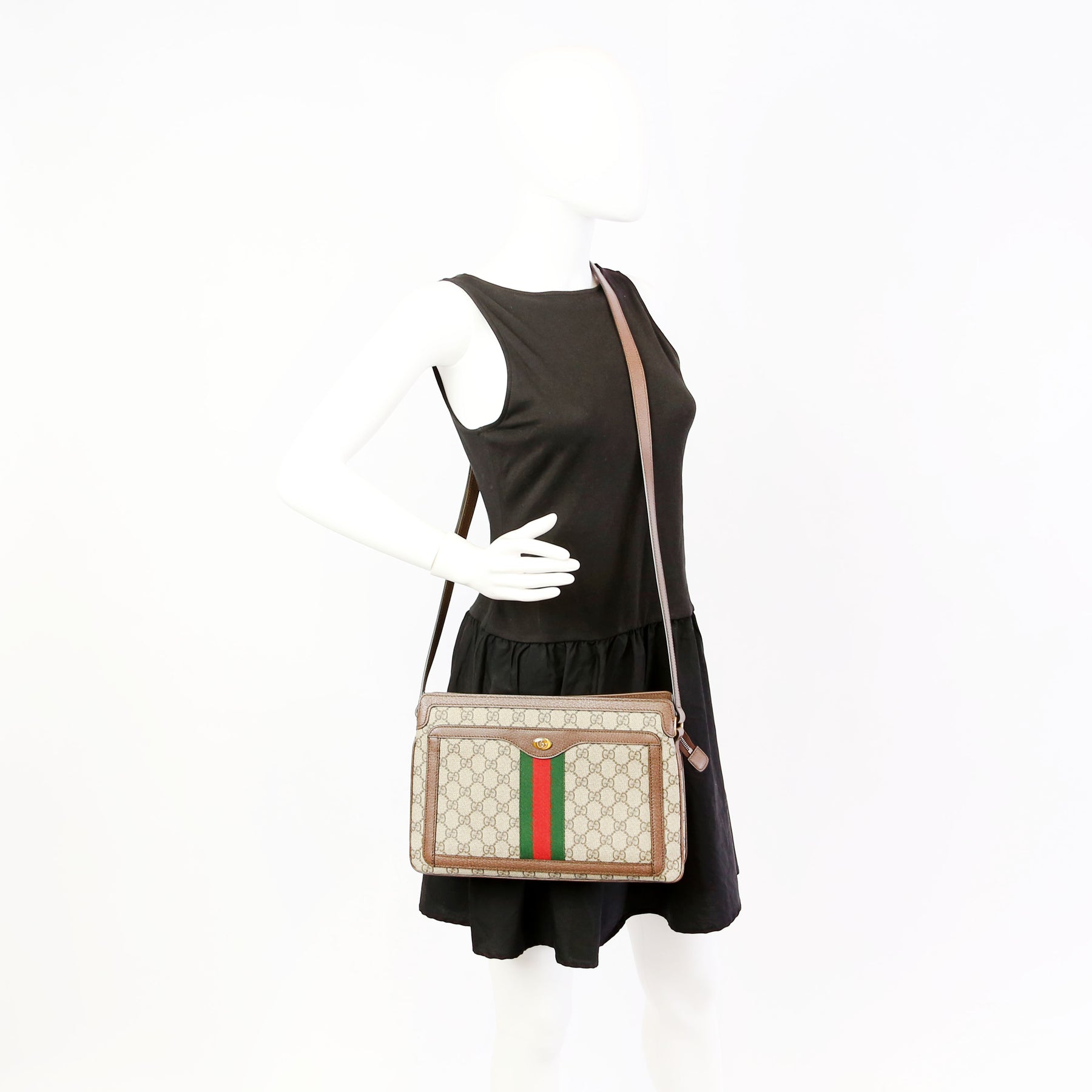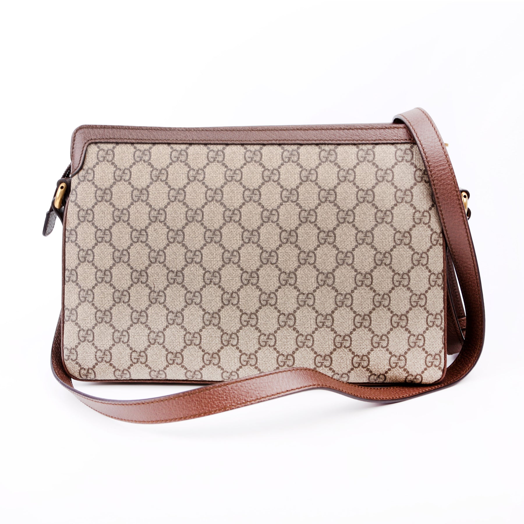 This pre-owned Gucci GG Supreme Ophidia Medium Shoulder Bag is guaranteed 100% authentic. The exterior is in the classic Gucci GG Supreme coated canvas.