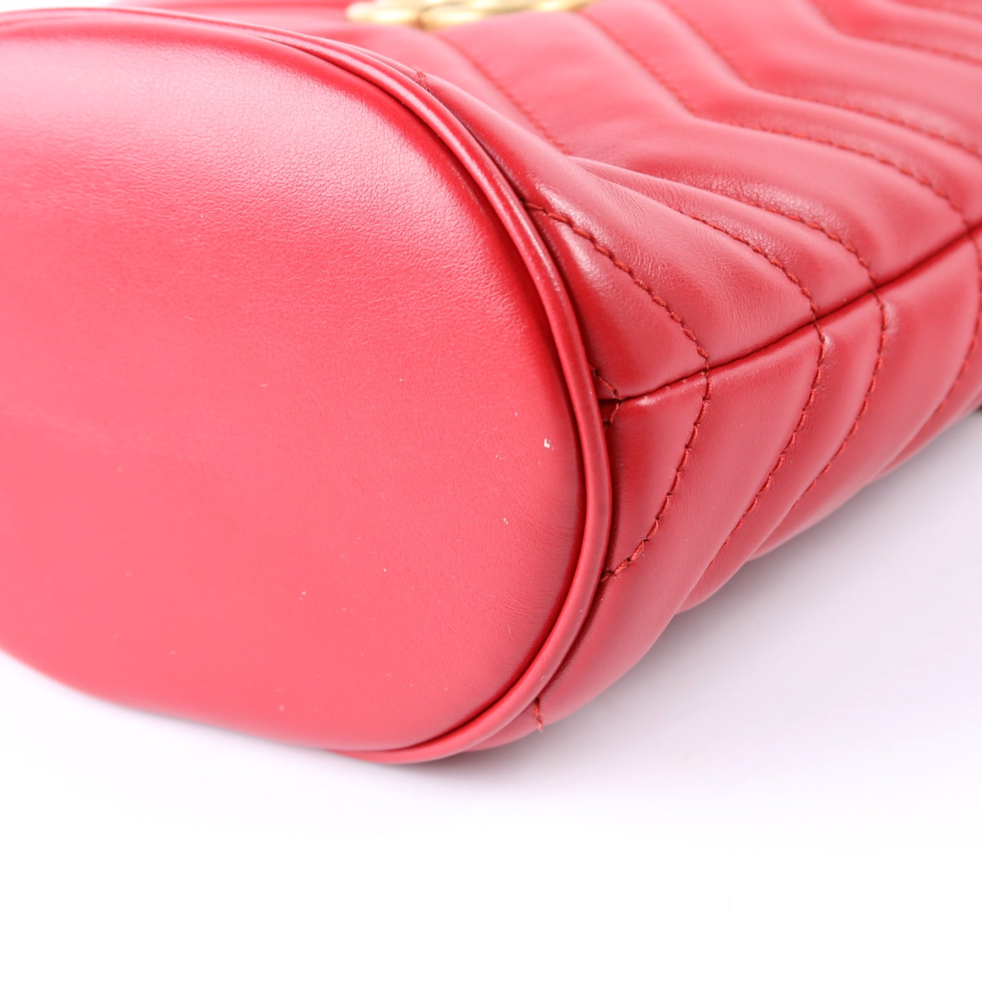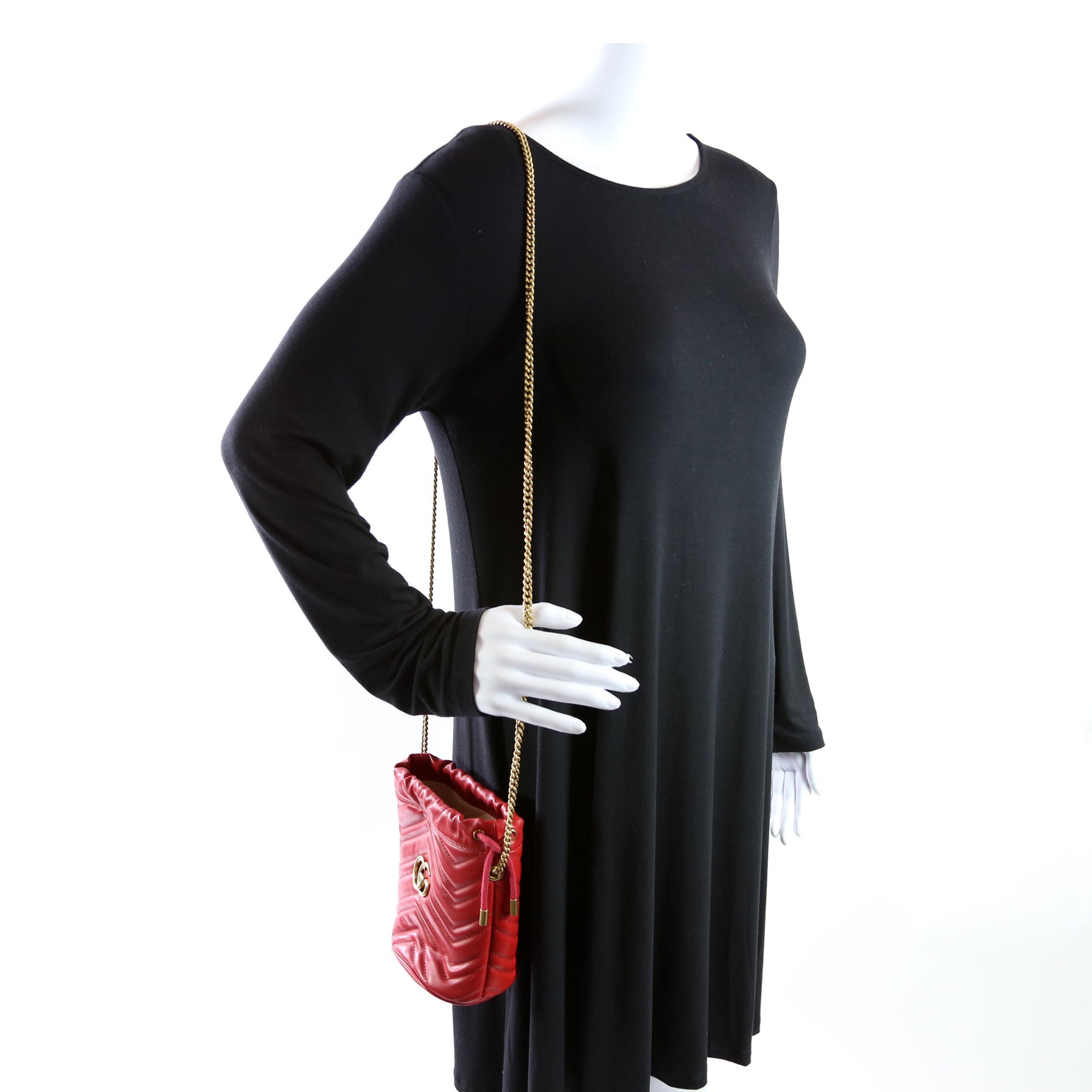 This pre-owned Gucci Marmont Mini Bucket is guaranteed 100% authentic. The exterior is in the classic Gucci Marmont leather.