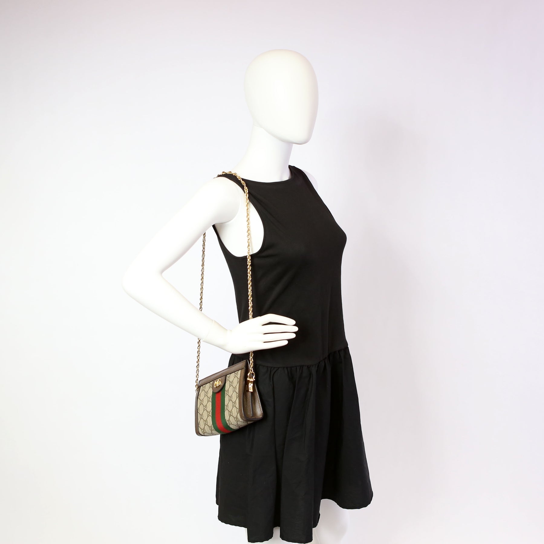 This pre-owned Gucci GG Supreme Ophidia Mini Chain is guaranteed 100% authentic. The exterior is in the classic Gucci GG Supreme coated canvas.