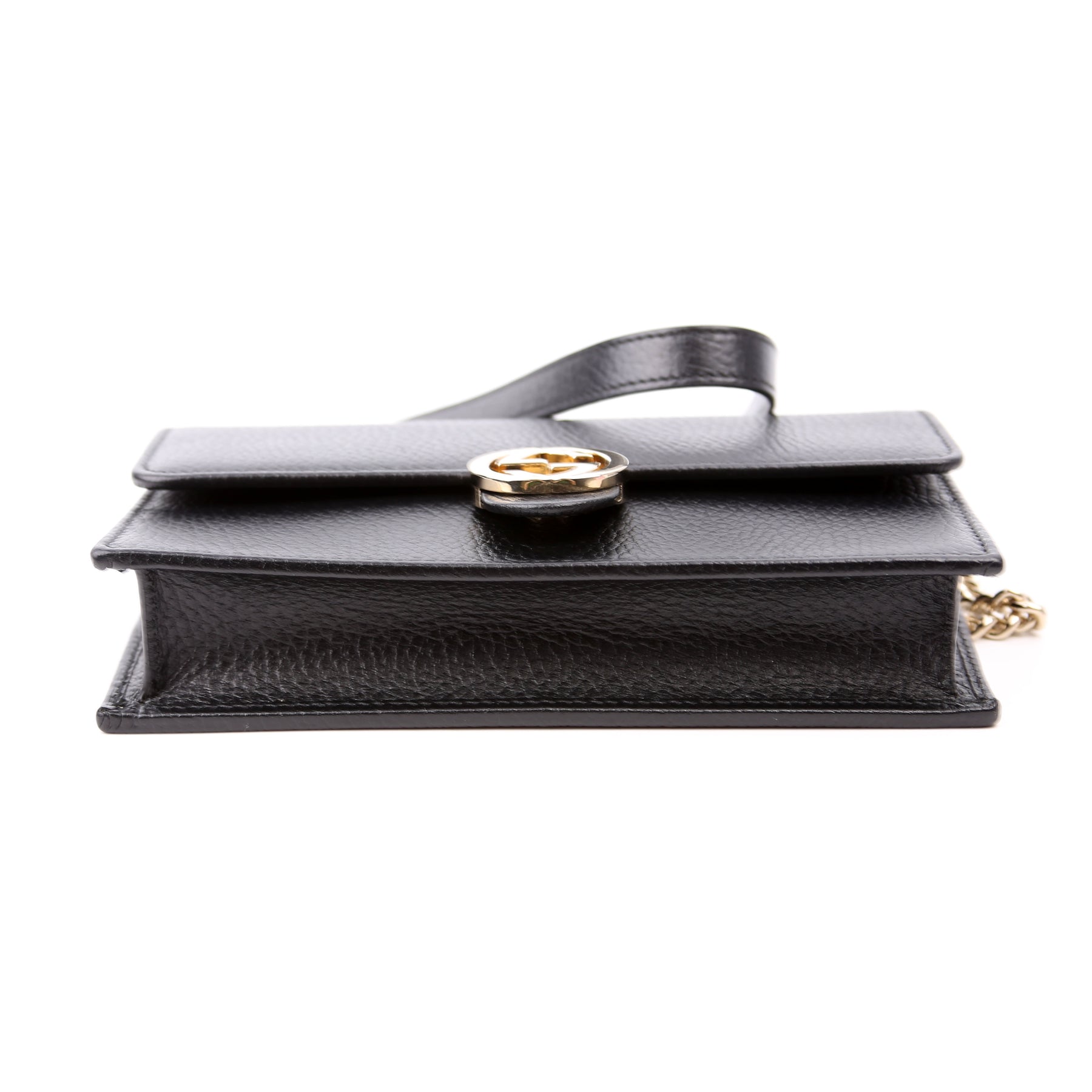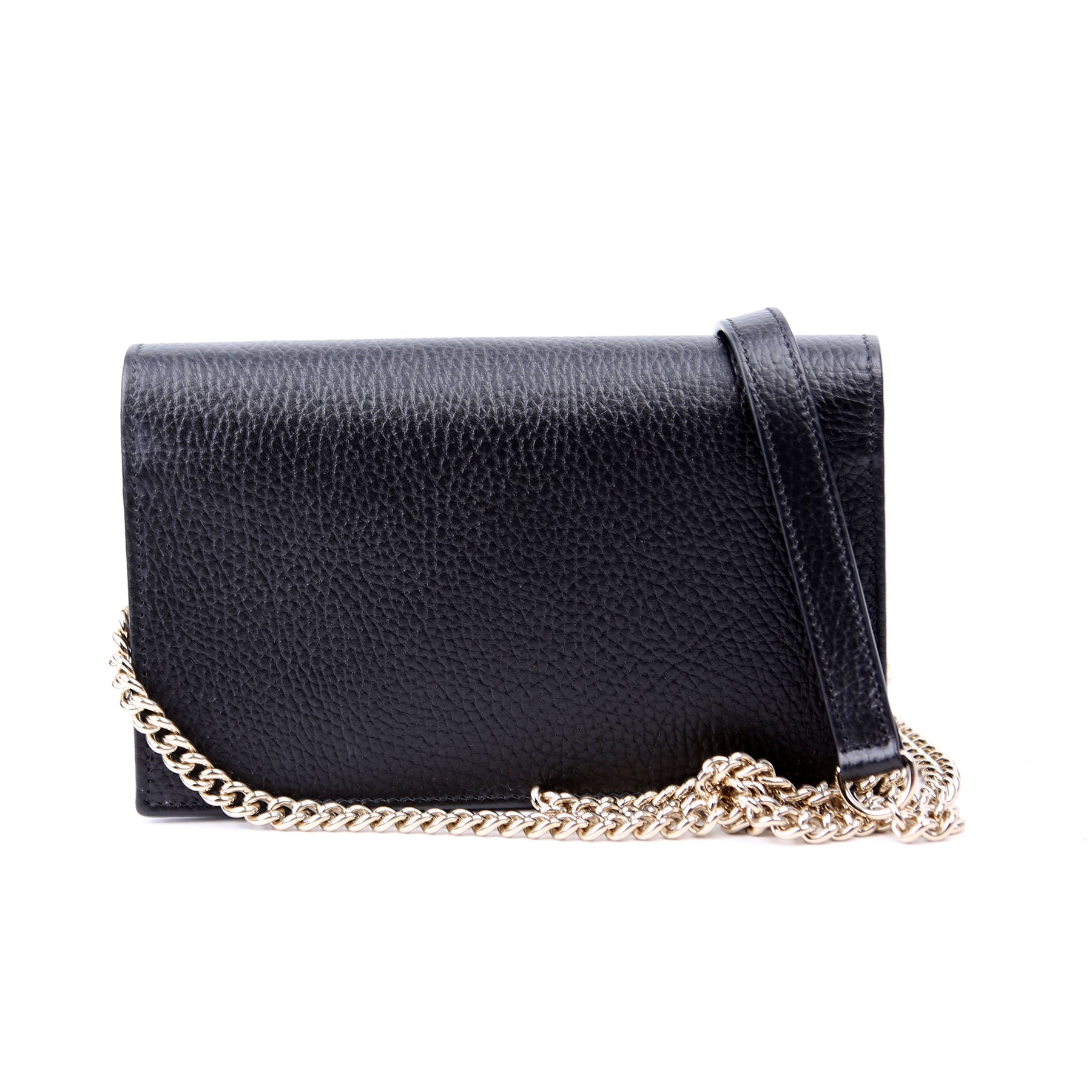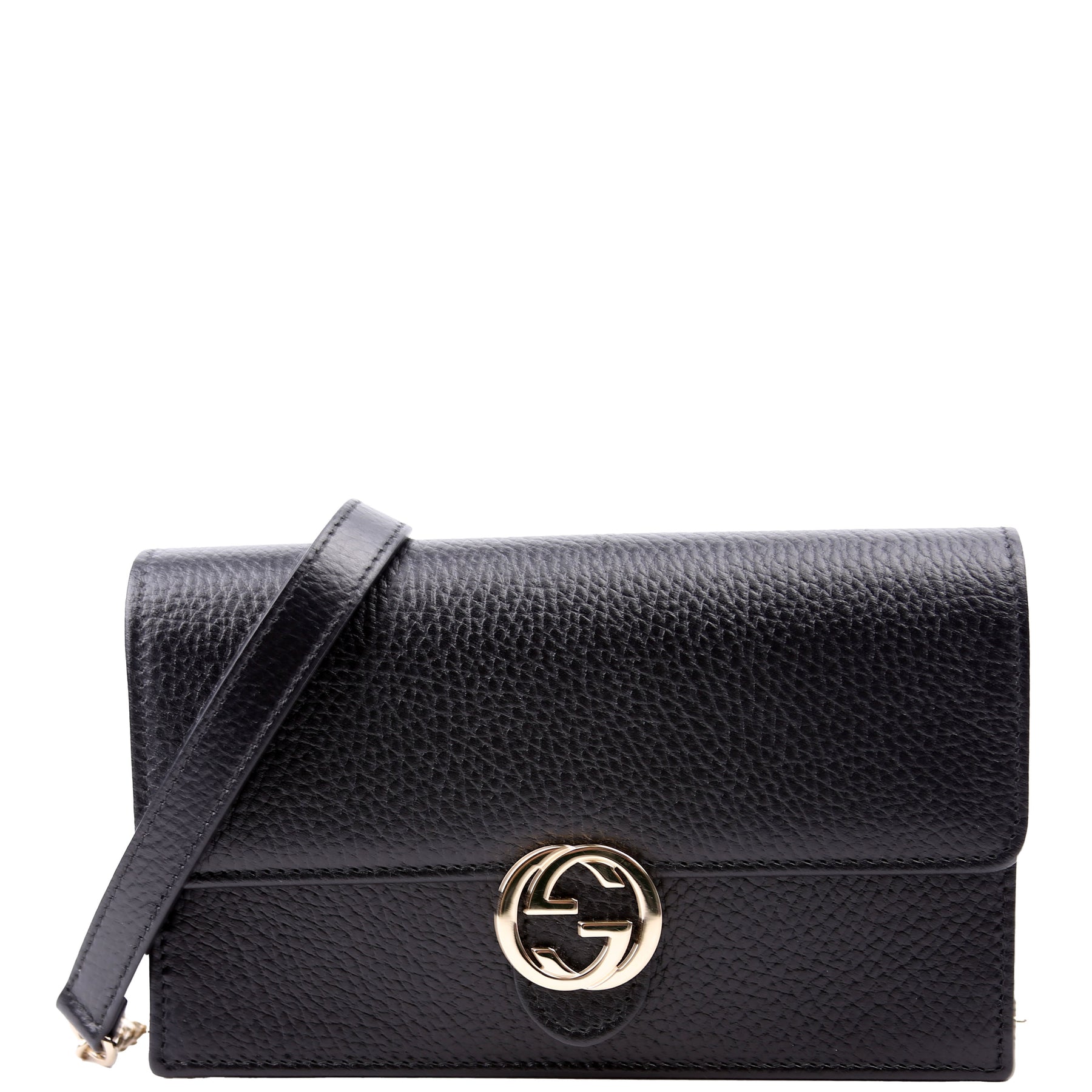 This pre-owned Gucci Interlocking GG Wallet On Chain is guaranteed to be 100% authentic. The exterior is in the classic Gucci Calfskin leather.