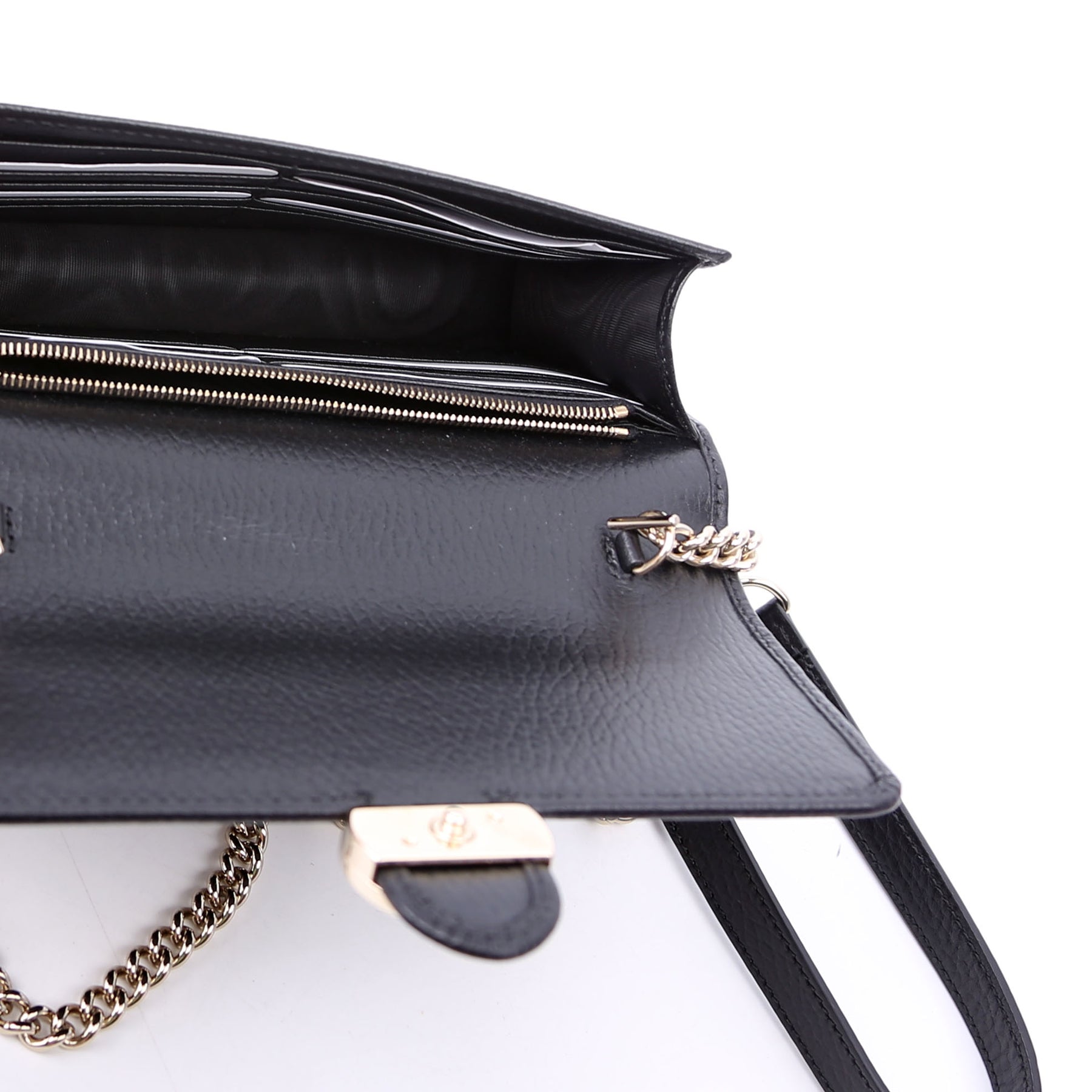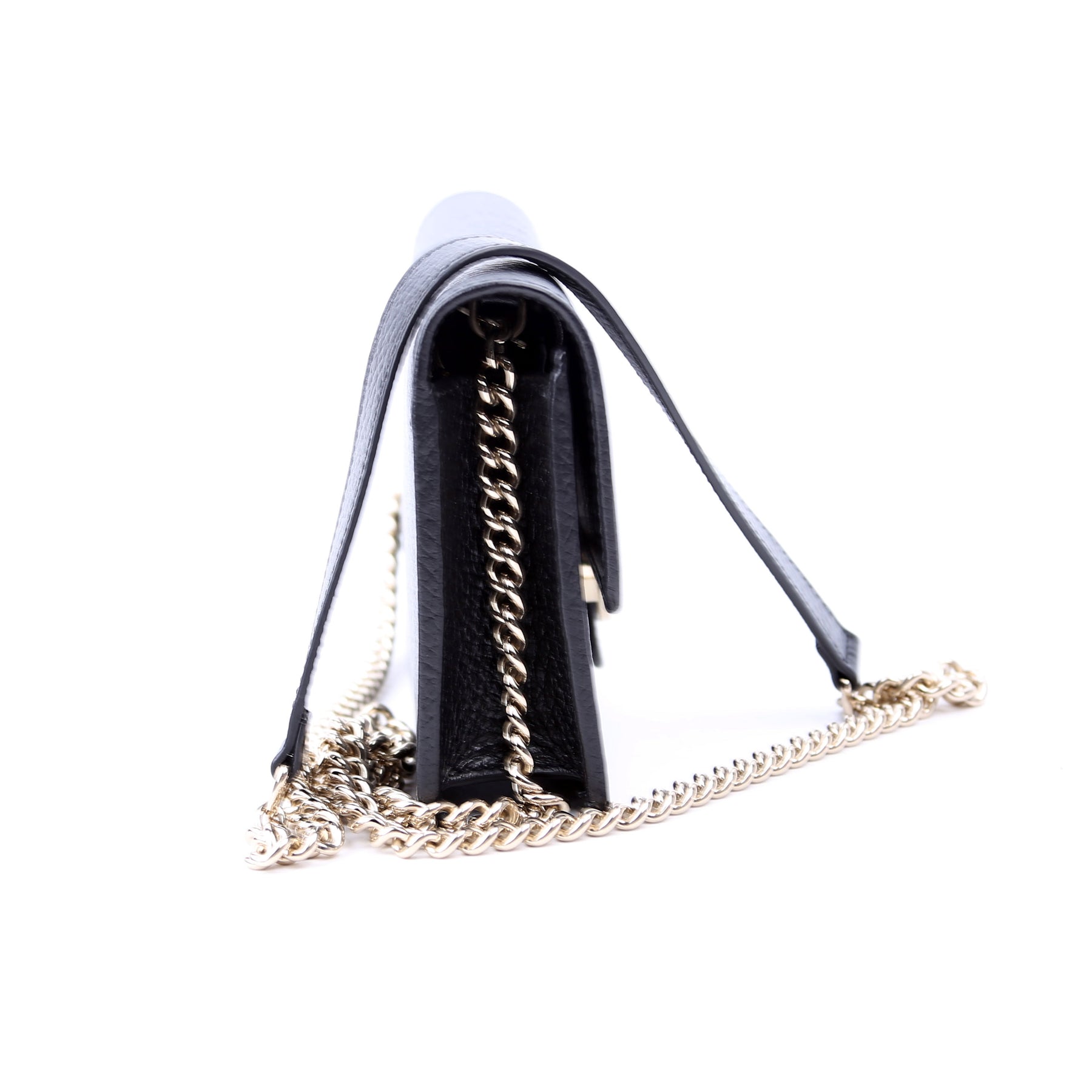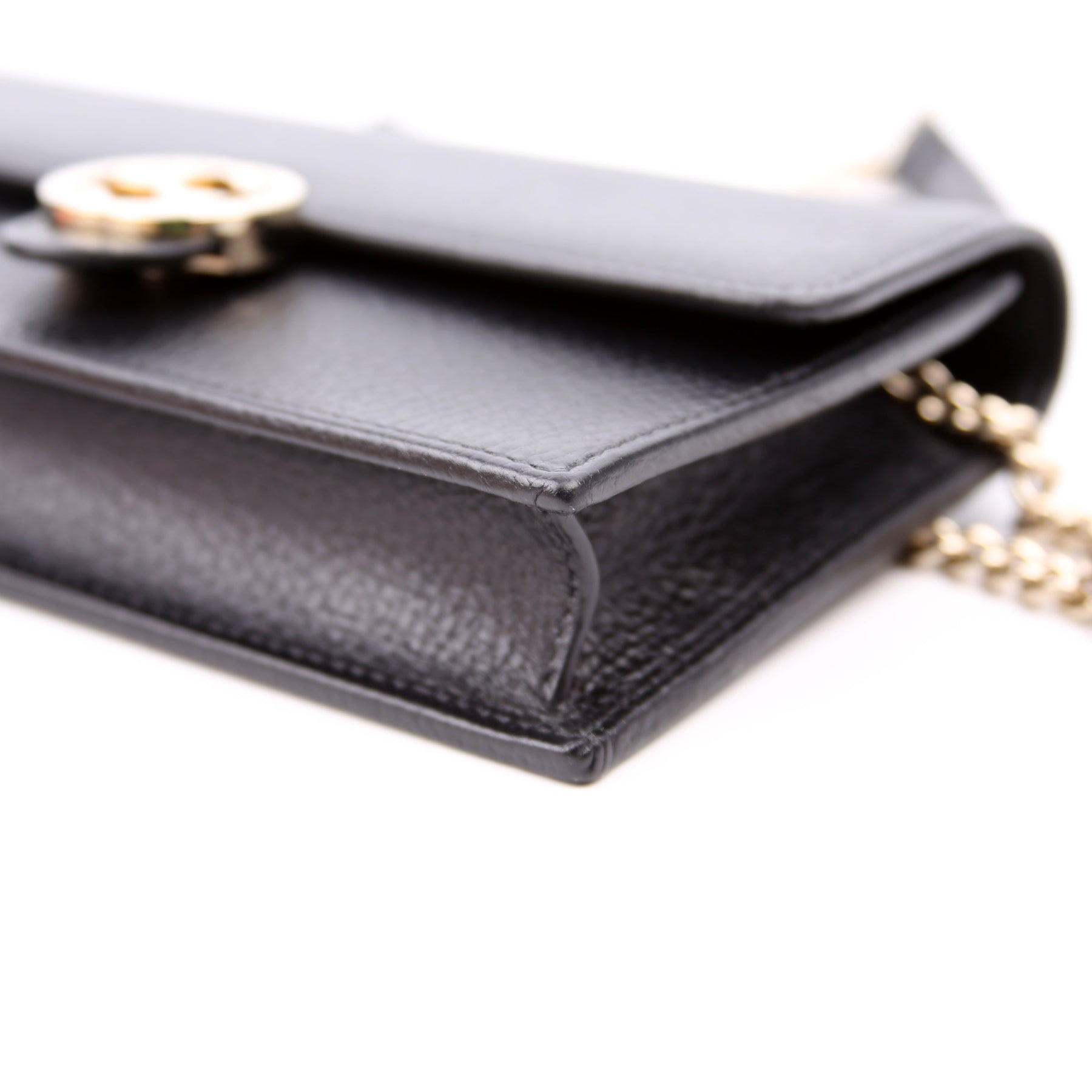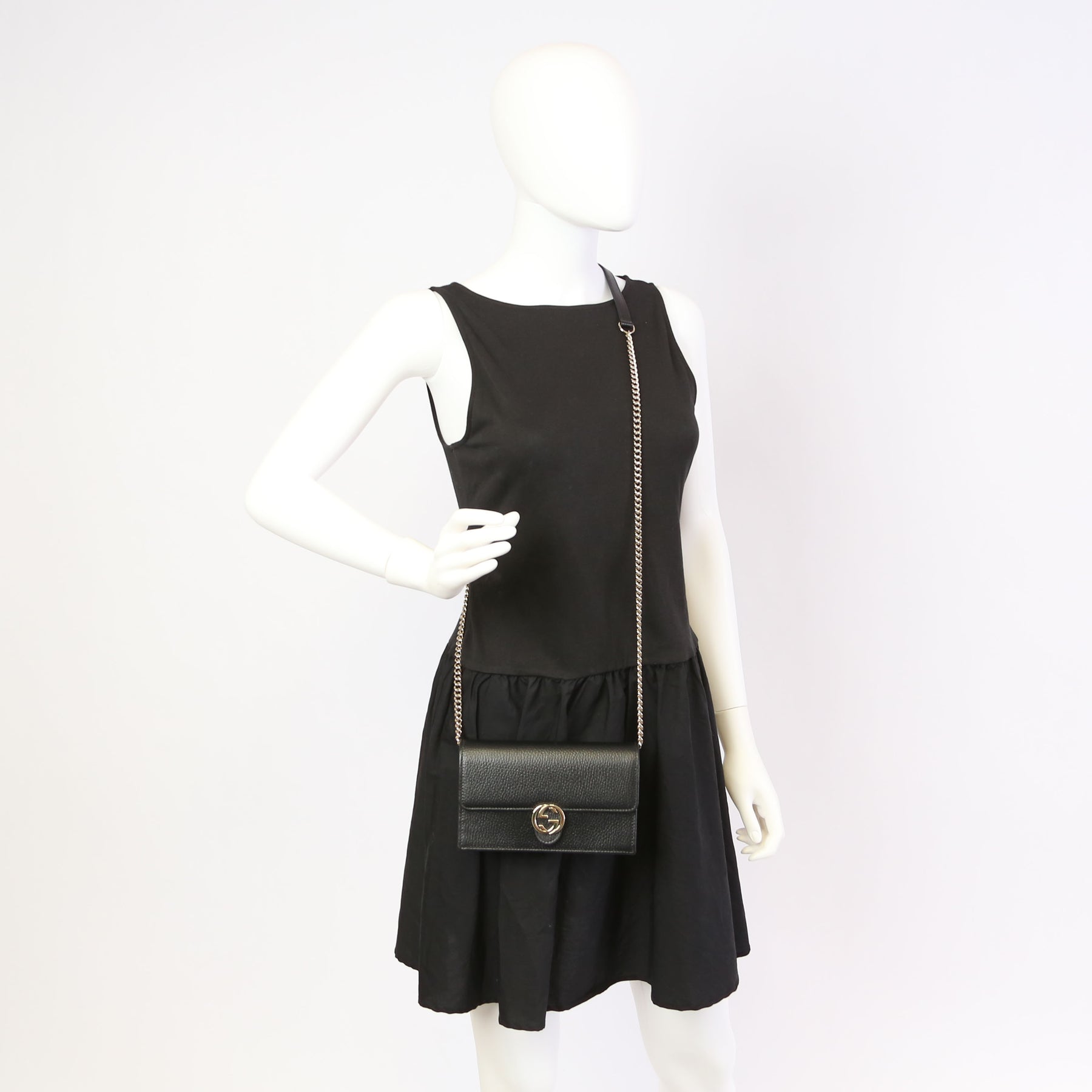 This pre-owned Gucci Interlocking GG Wallet On Chain is guaranteed to be 100% authentic. The exterior is in the classic Gucci Calfskin leather.