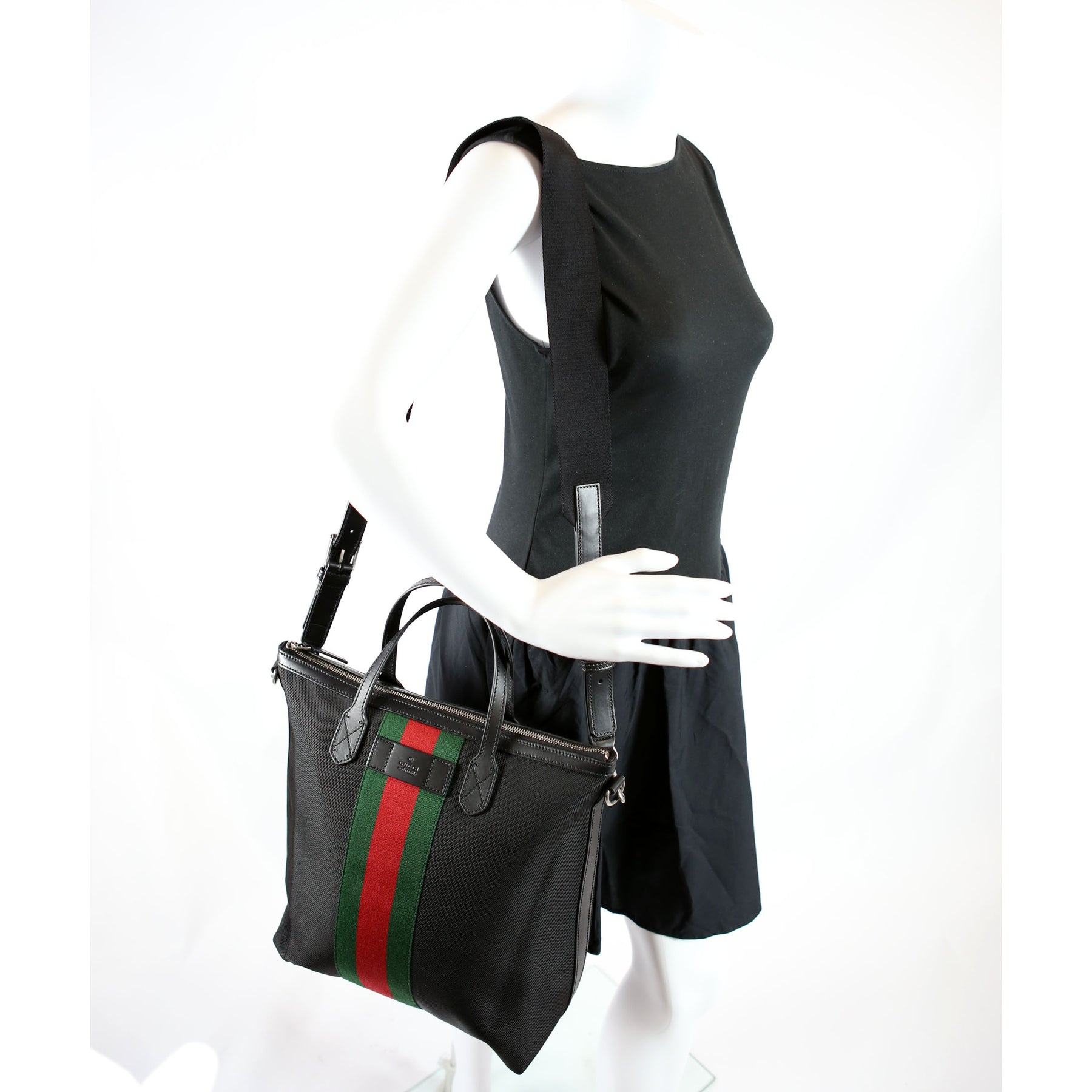 This pre-owned Gucci Techno Canvas Web Medium Tote is guaranteed 100% authentic. The exterior is in the classic Gucci canvas.