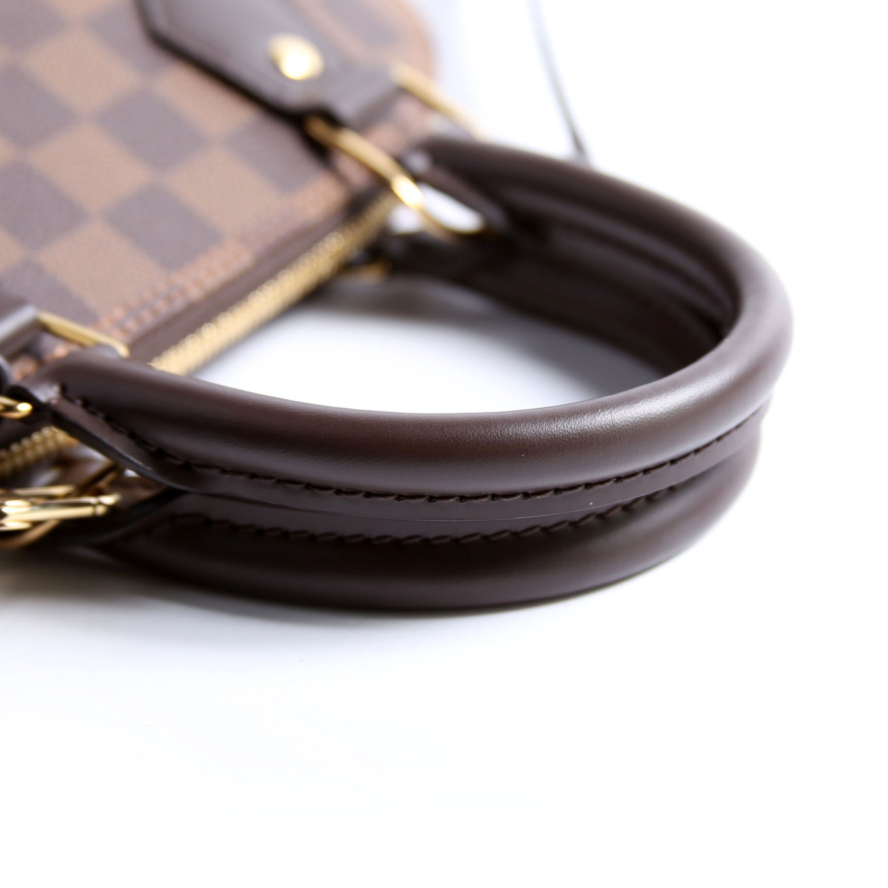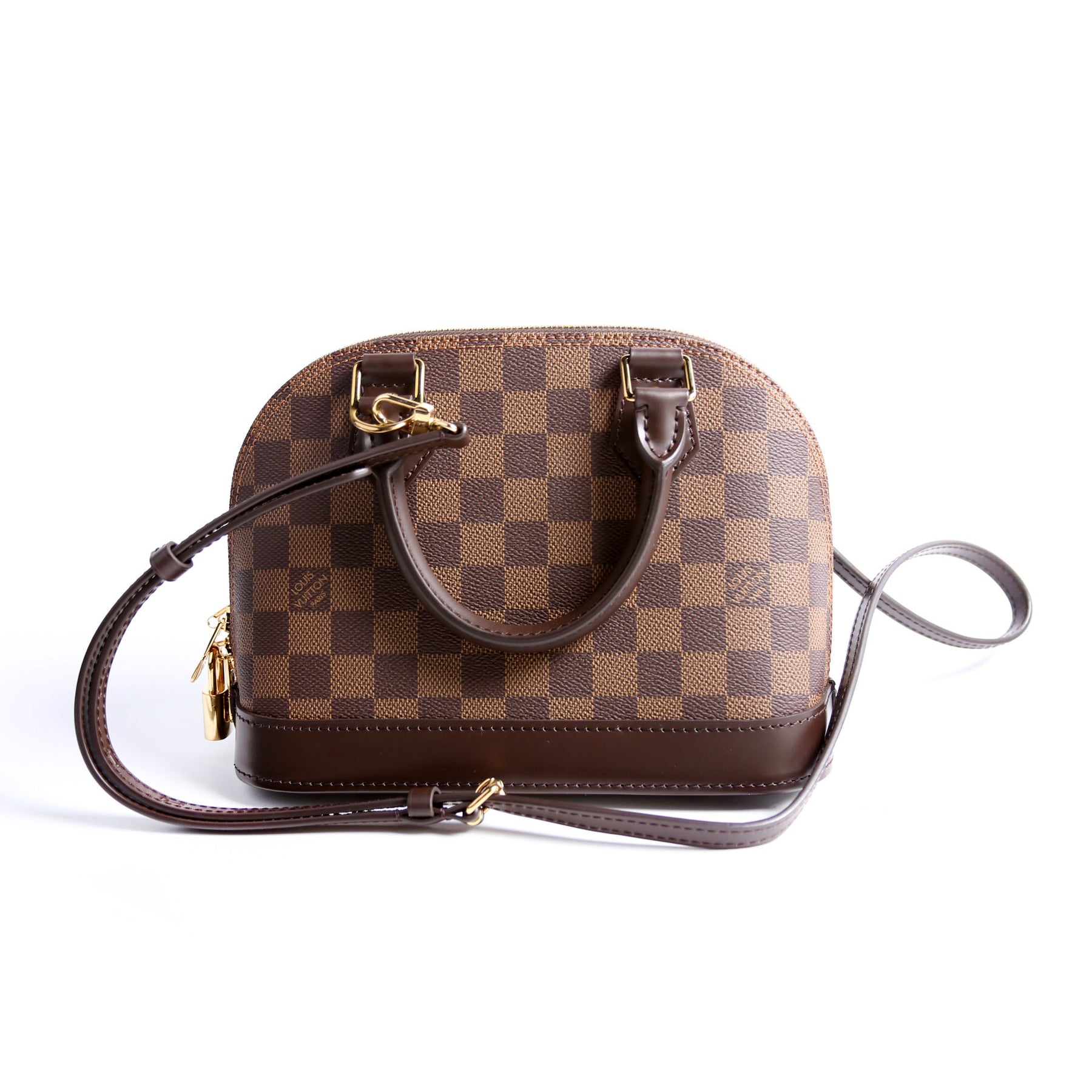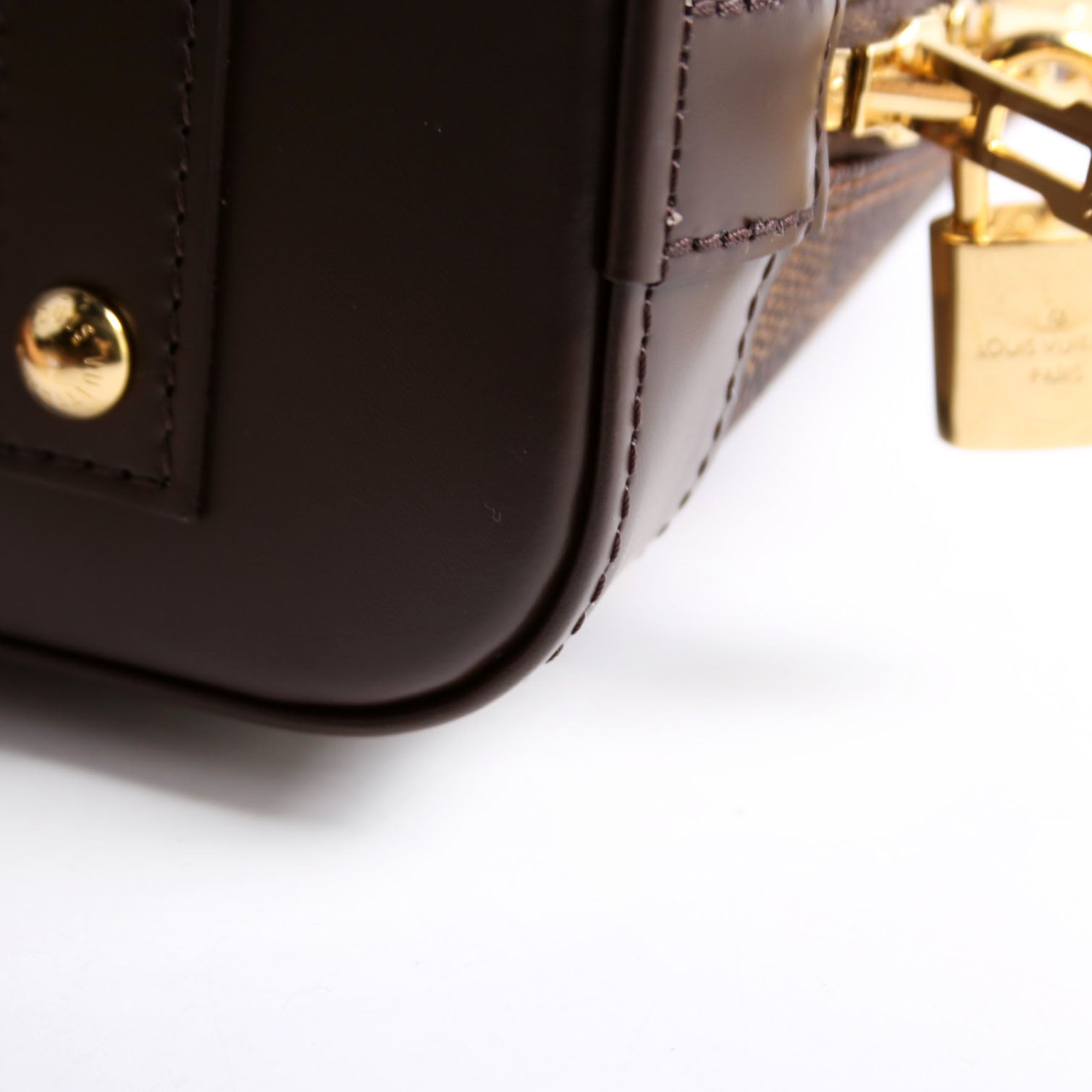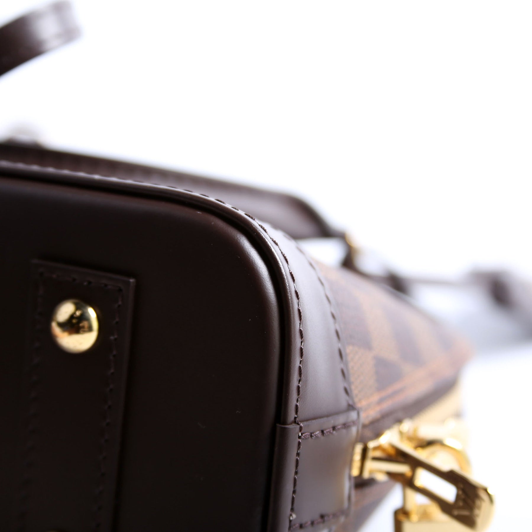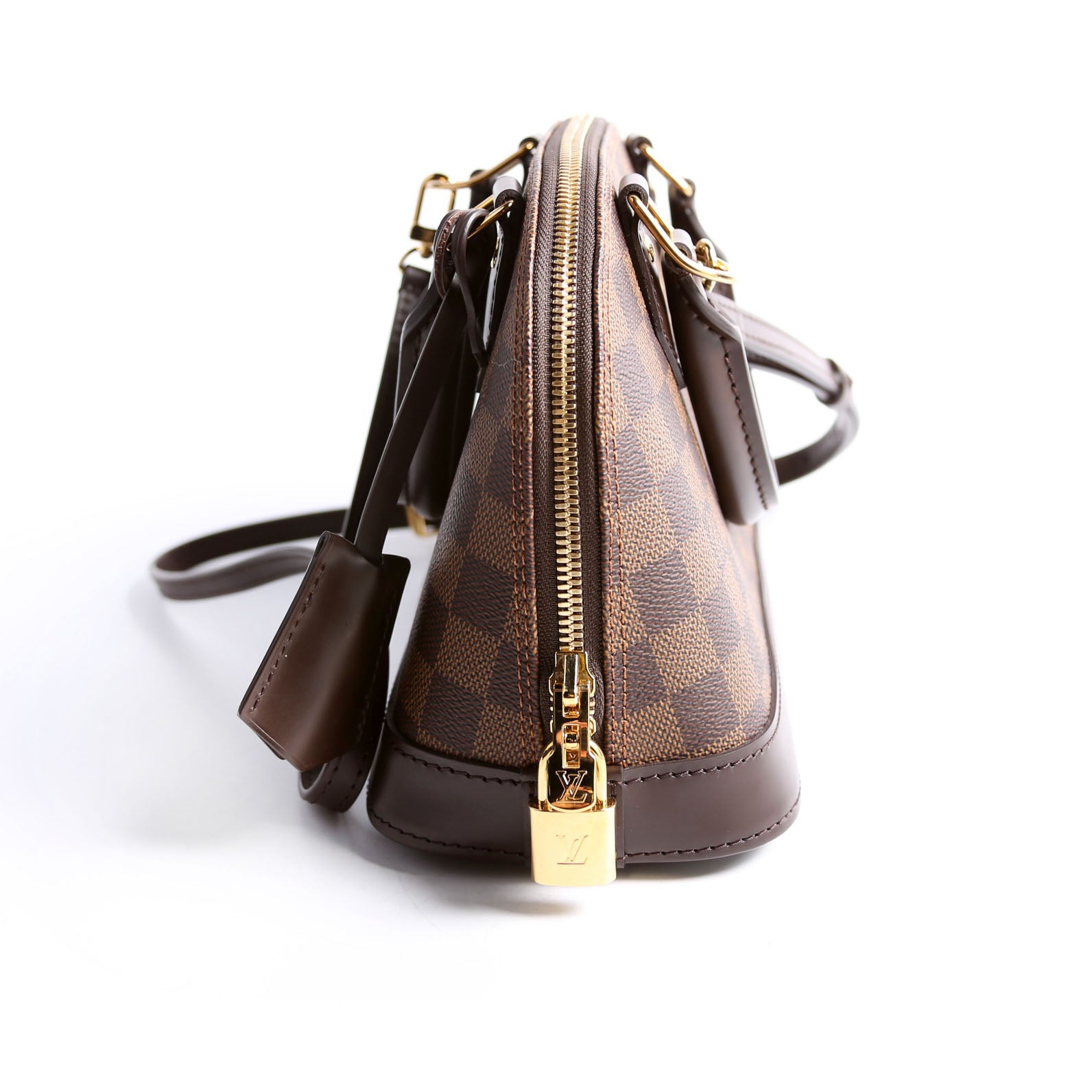 This pre-owned Louis Vuitton Alma BB Ebene is guaranteed 100% authentic. The exterior is in the classic Louis Vuitton Damier Ebene Coated Canvas.