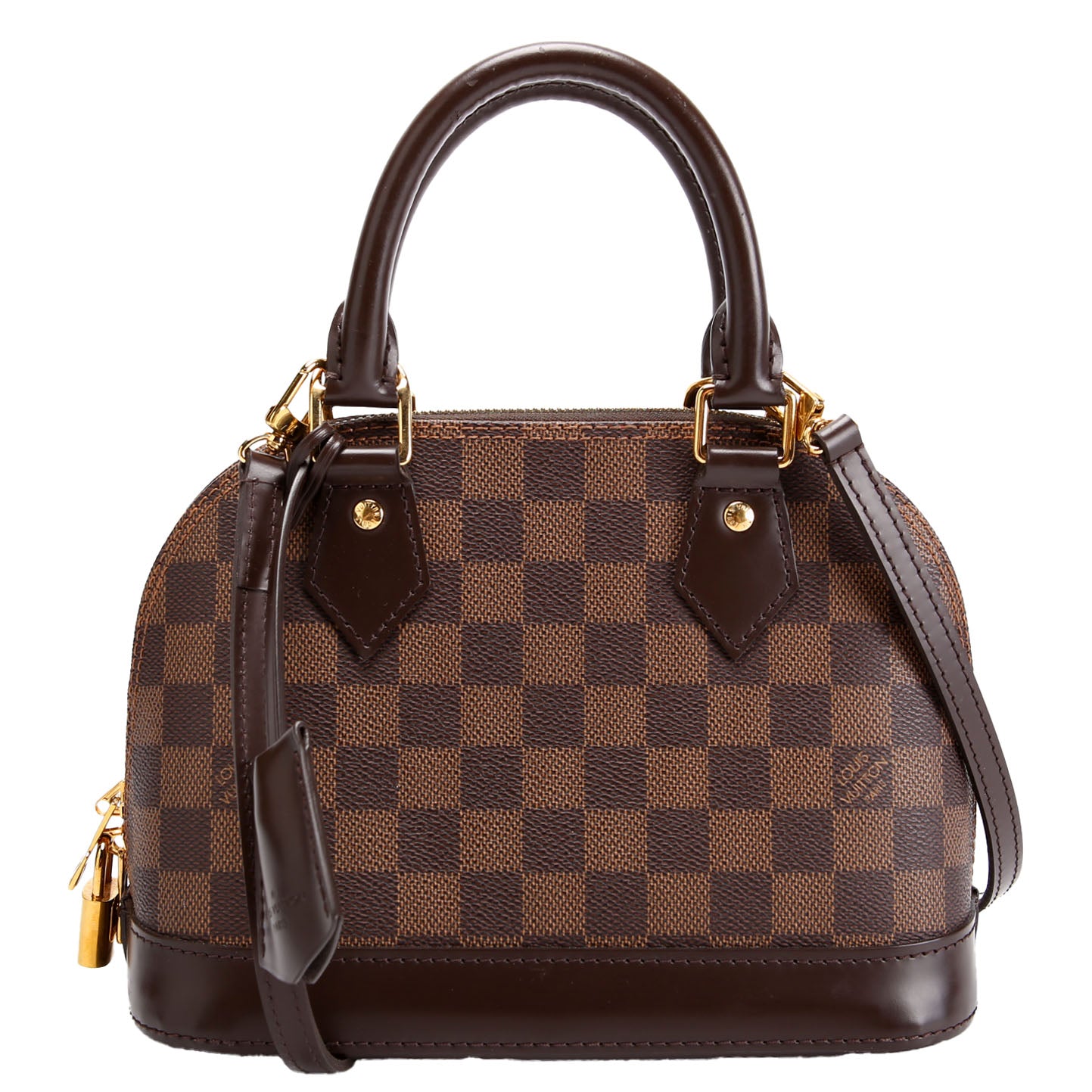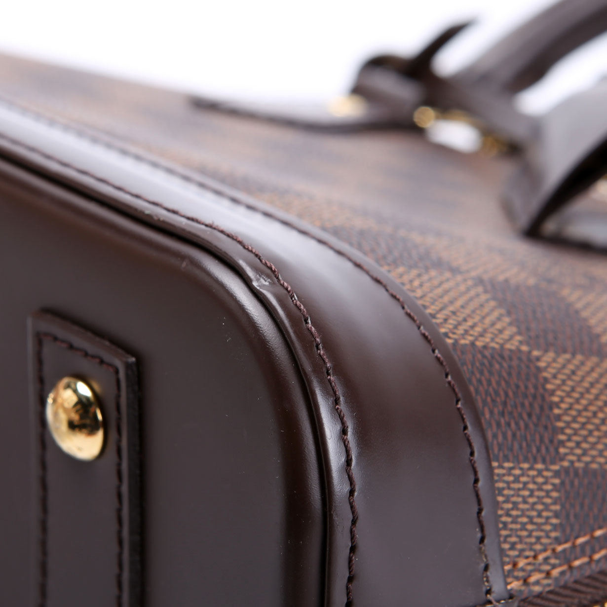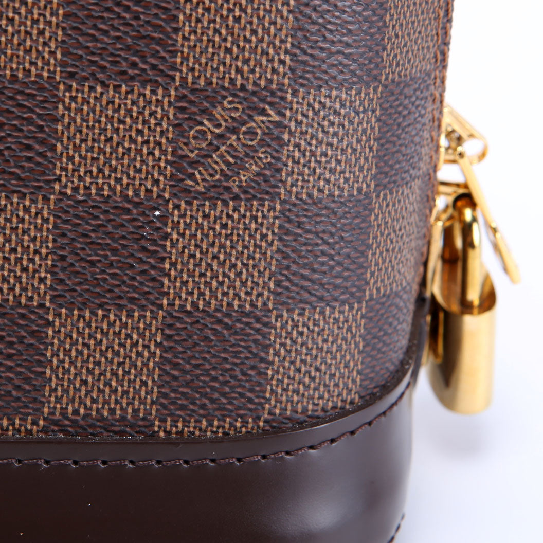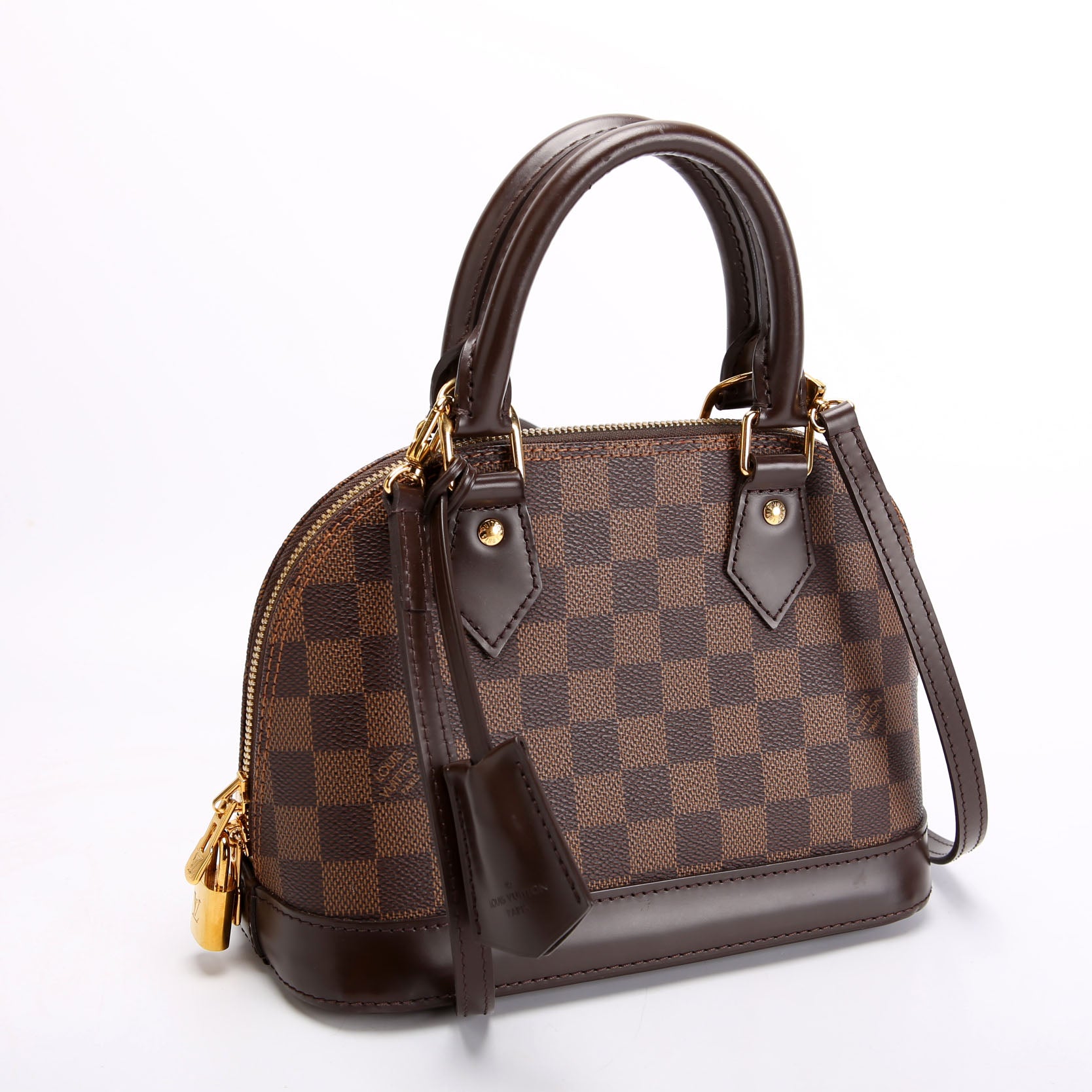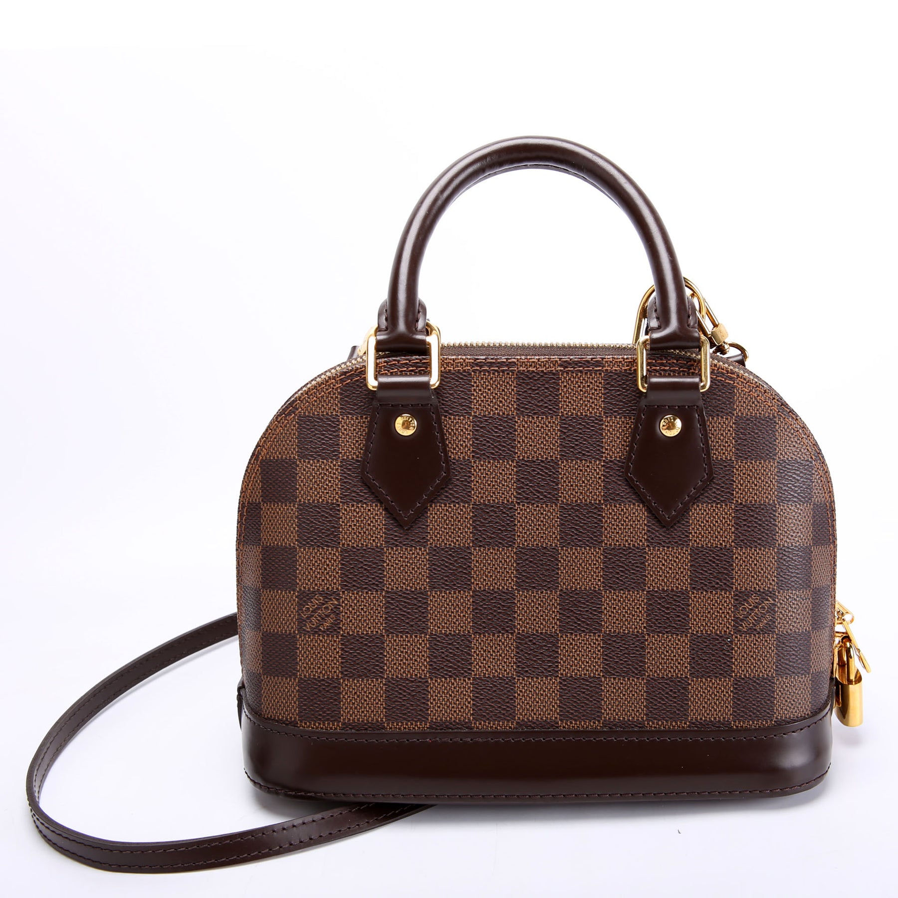 This pre-owned Louis Vuitton Alma BB Ebene is guaranteed 100% authentic. The exterior is in the classic Louis Vuitton Ebene coated canvas.