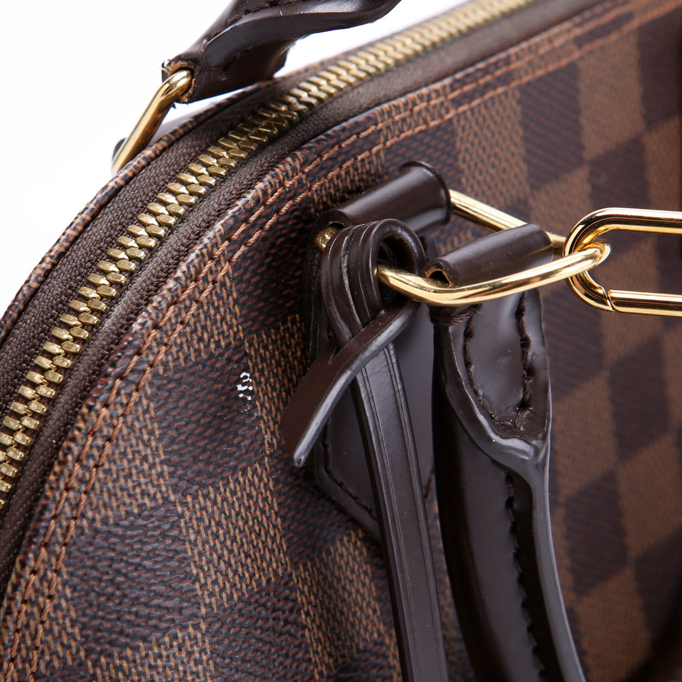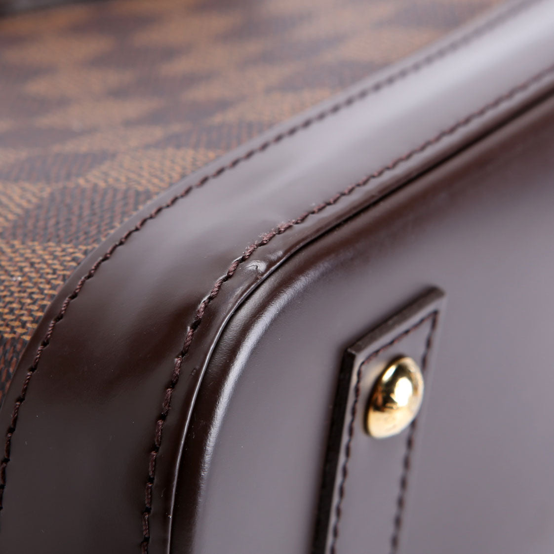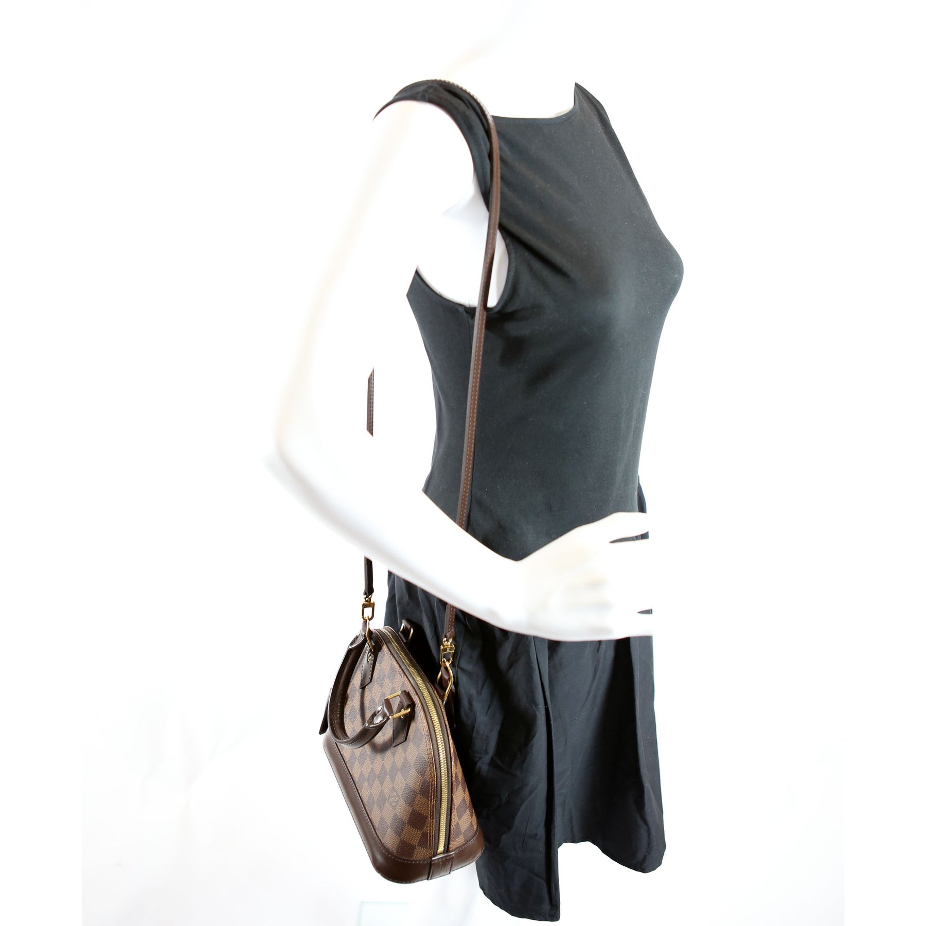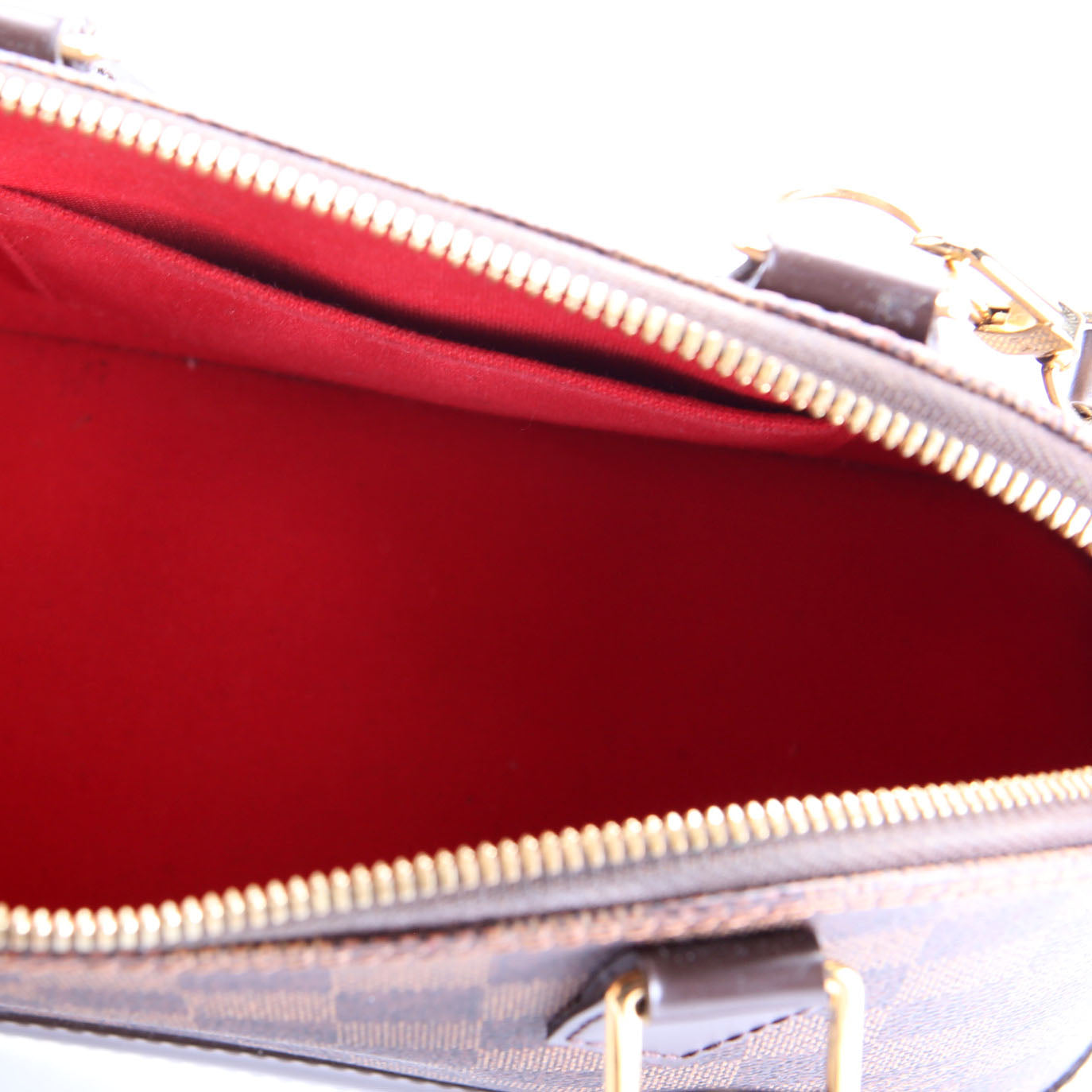 This pre-owned Louis Vuitton Alma BB Ebene is guaranteed 100% authentic. The exterior is in the classic Louis Vuitton Ebene coated canvas.