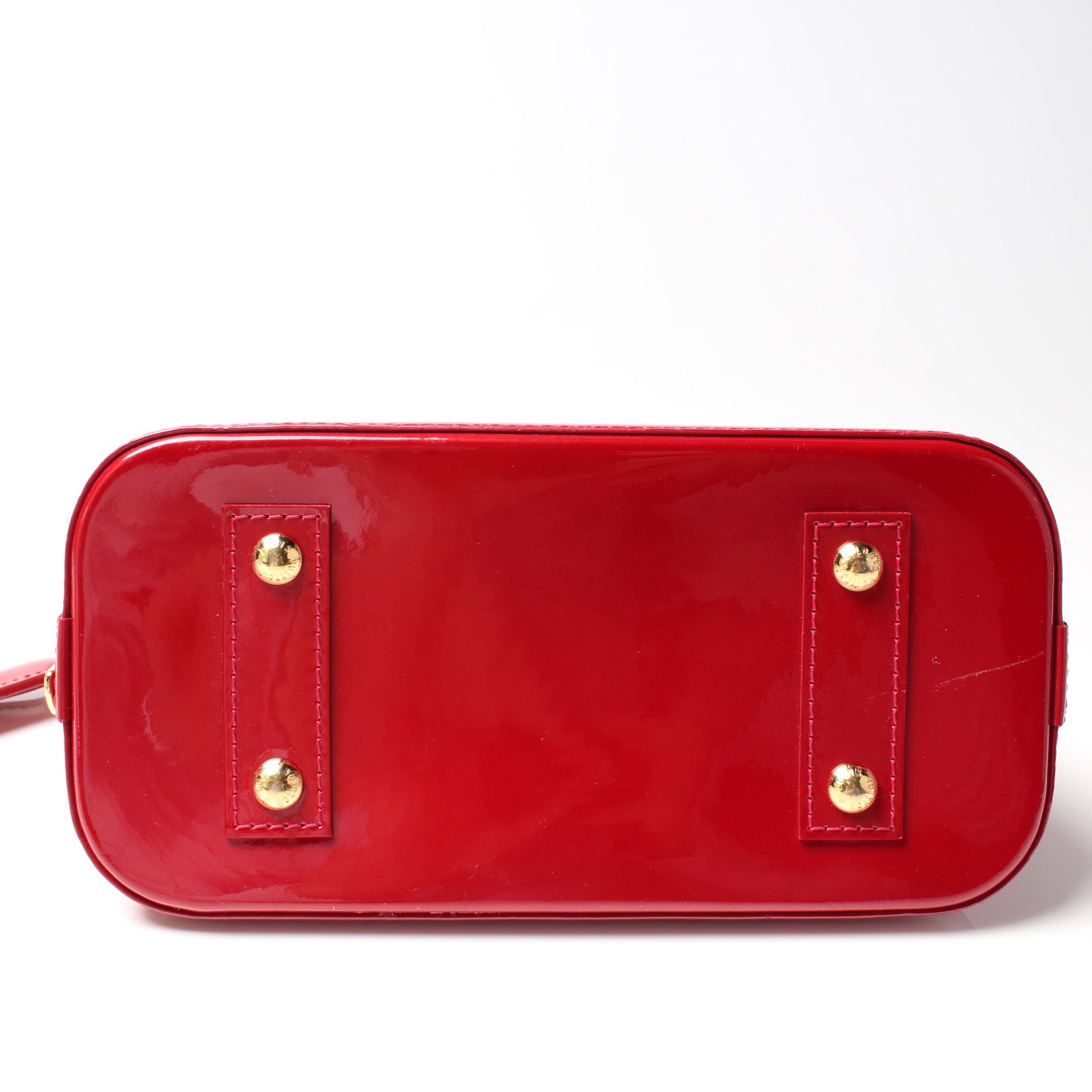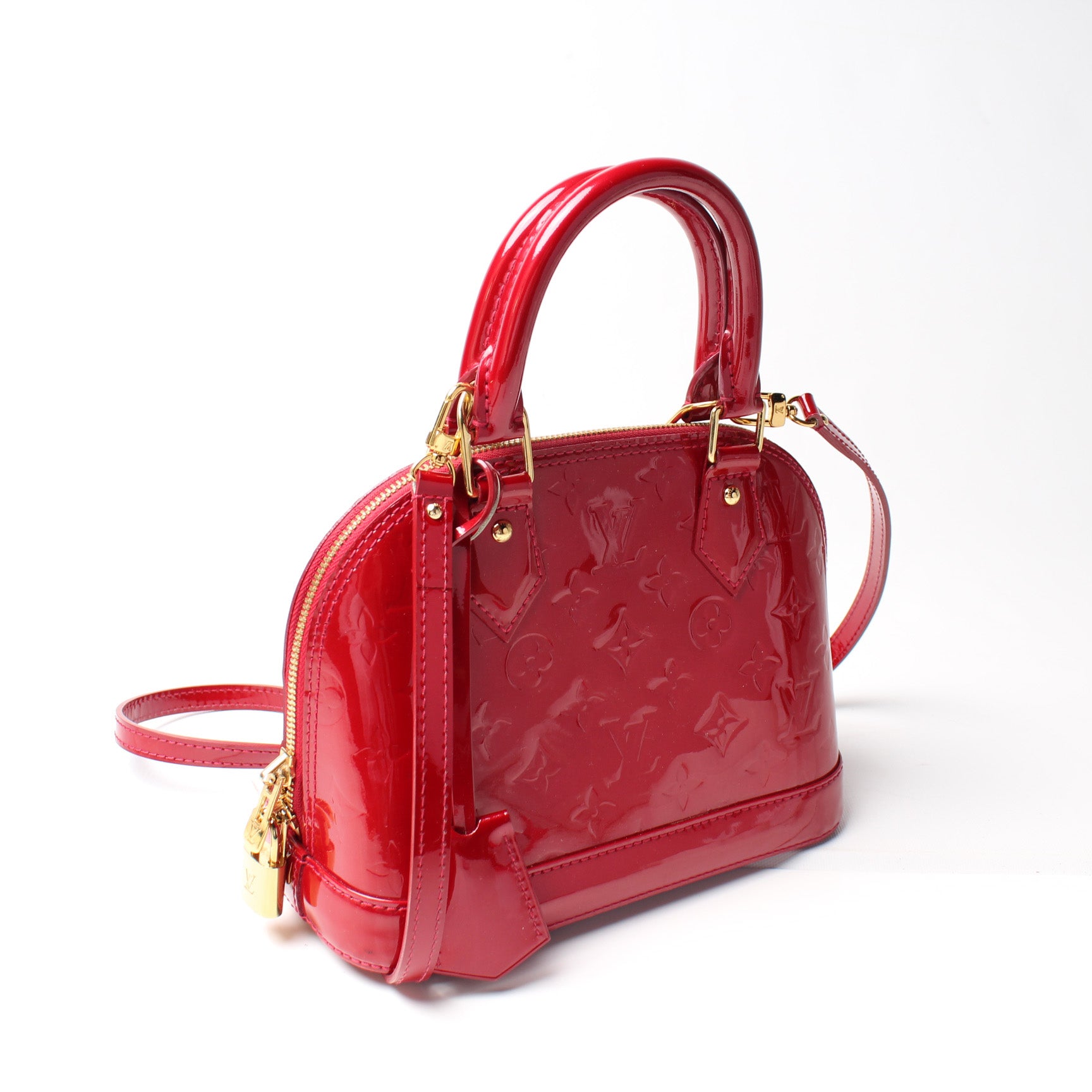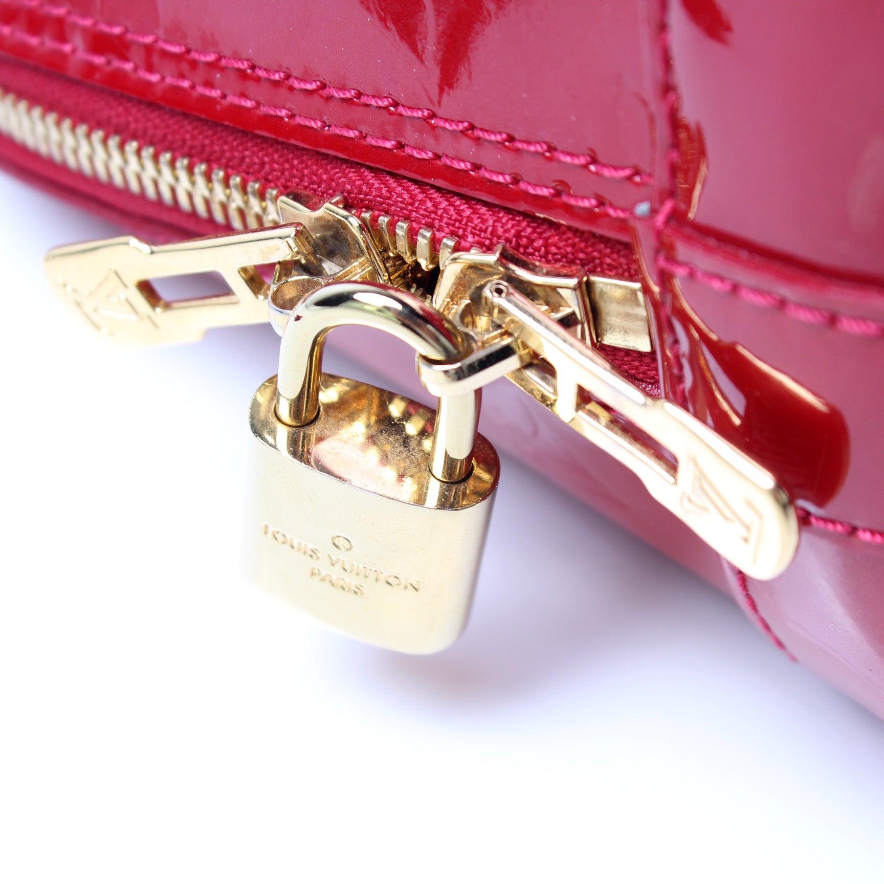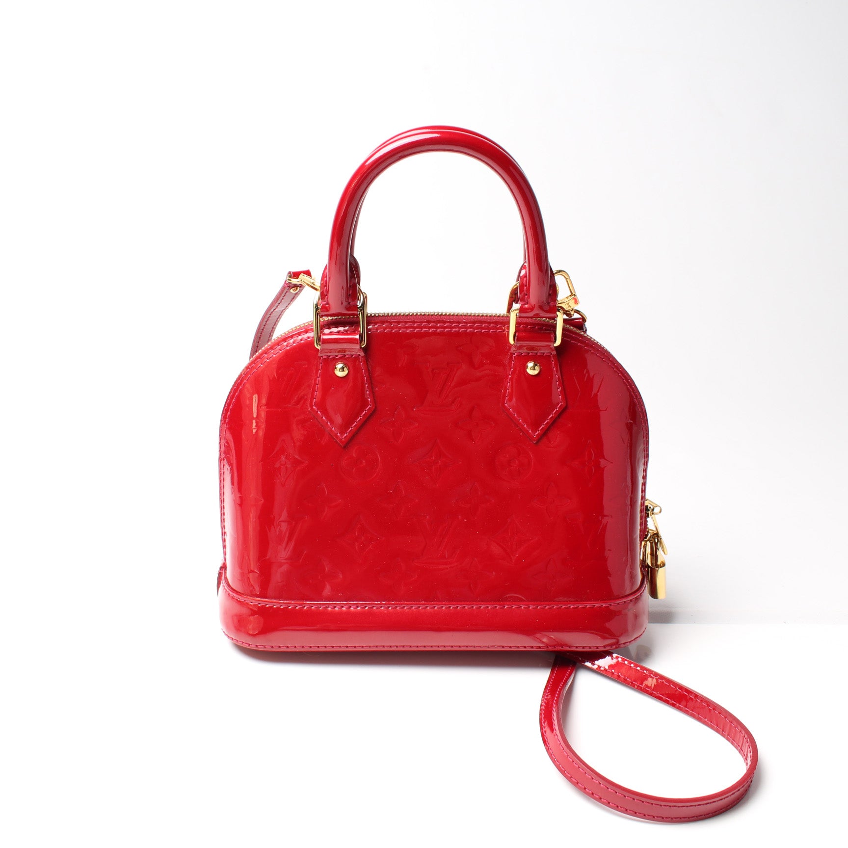 This pre-owned Louis Vuitton Alma BB is guaranteed 100% authentic. The exterior is in the classic Vernis patent leather.