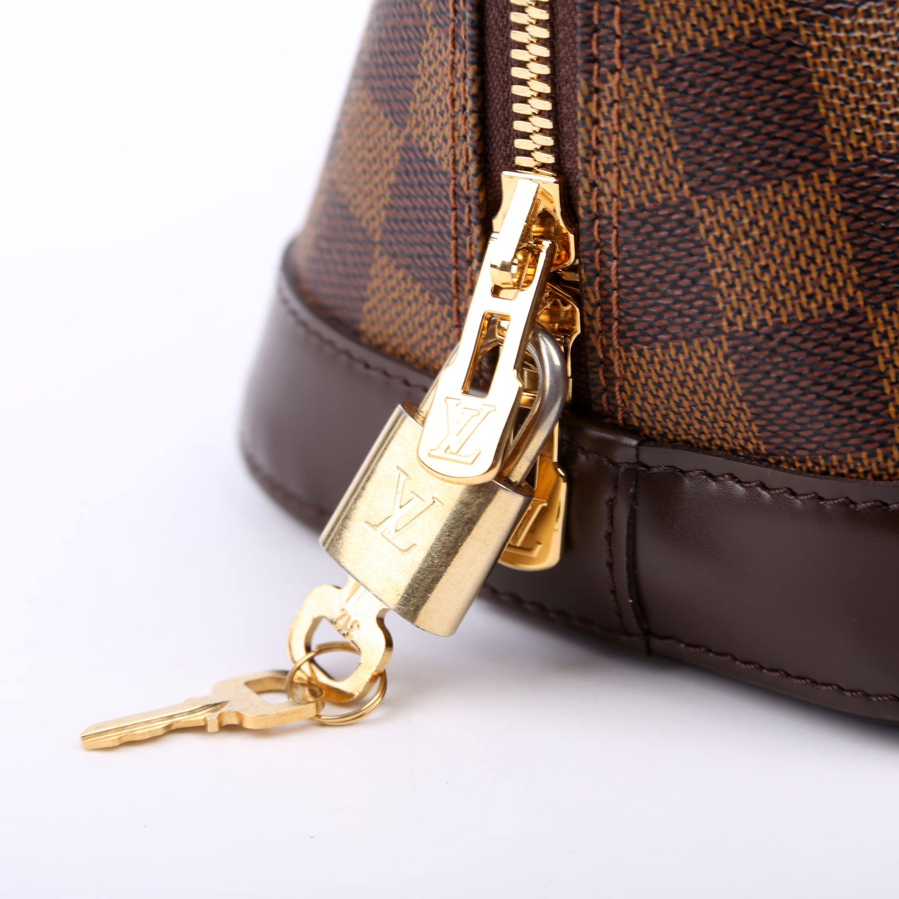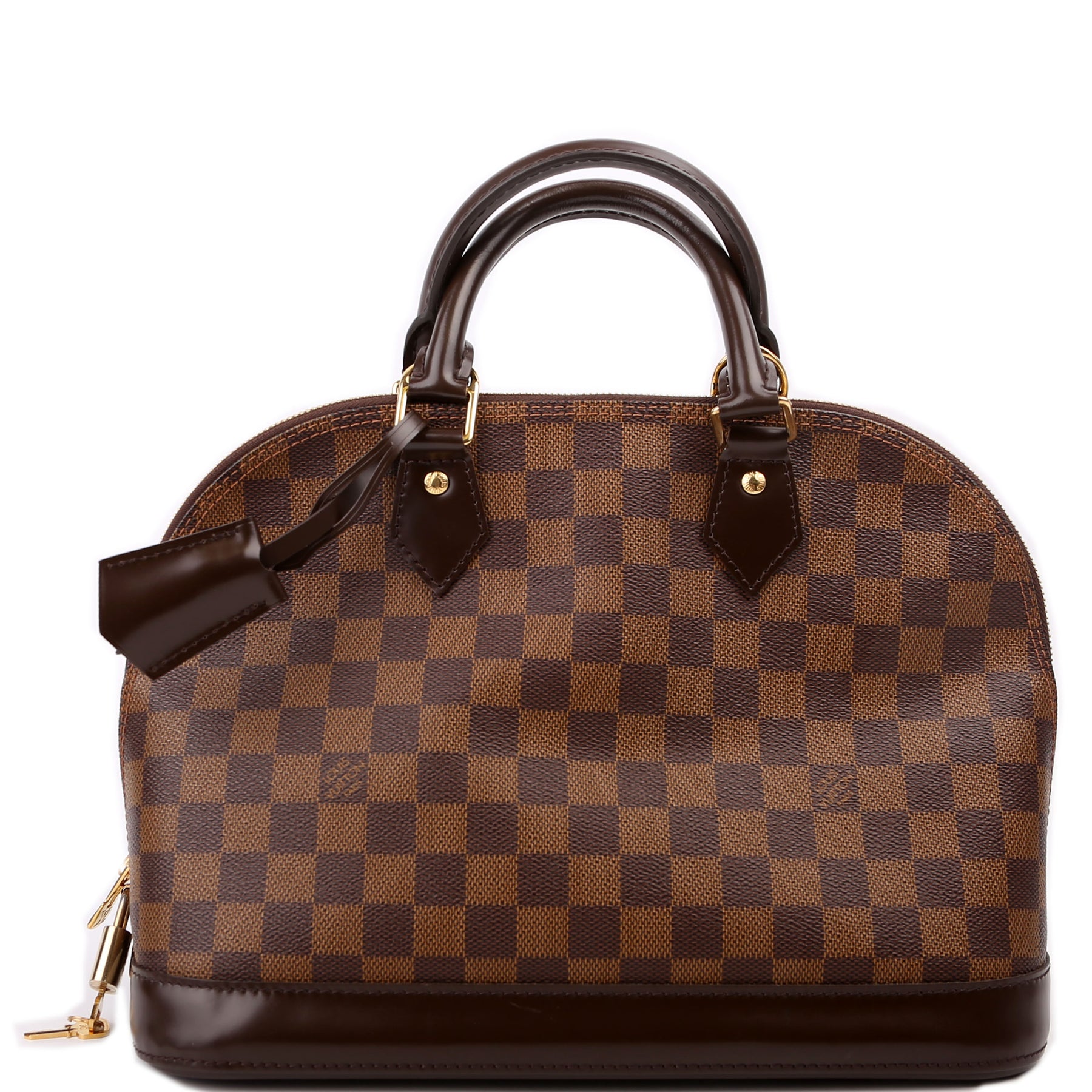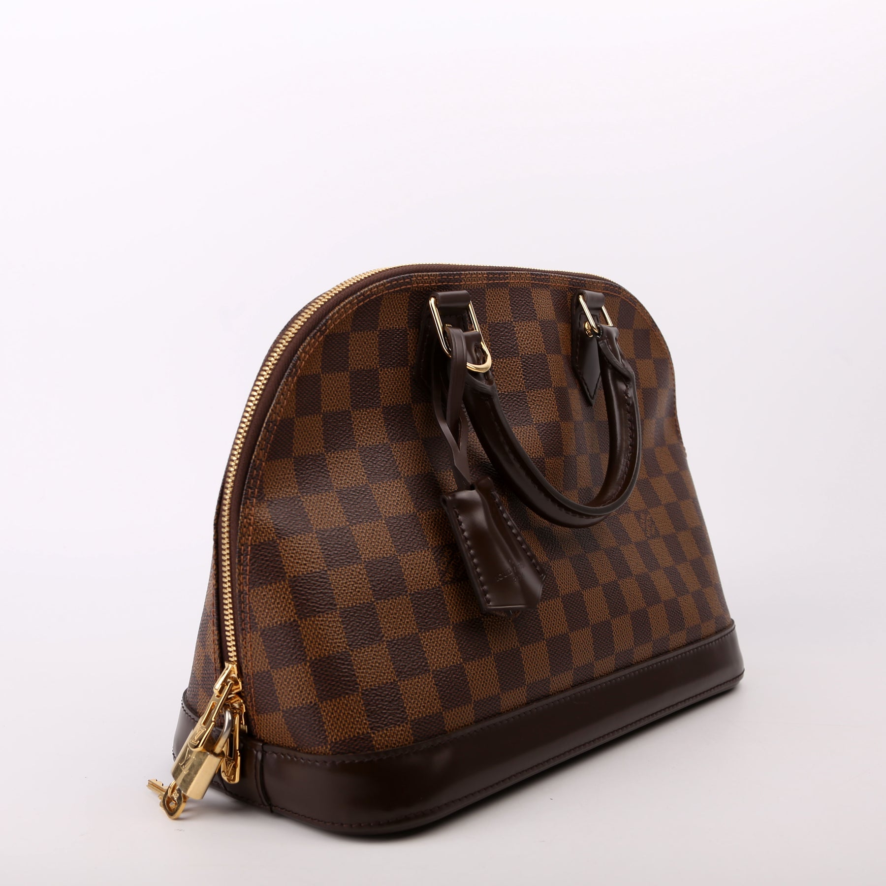 This pre-owned Louis Vuitton Alma PM Newer is guaranteed 100% authentic. The exterior is in the classic Louis Vuitton Damier Ebene coated canvas.