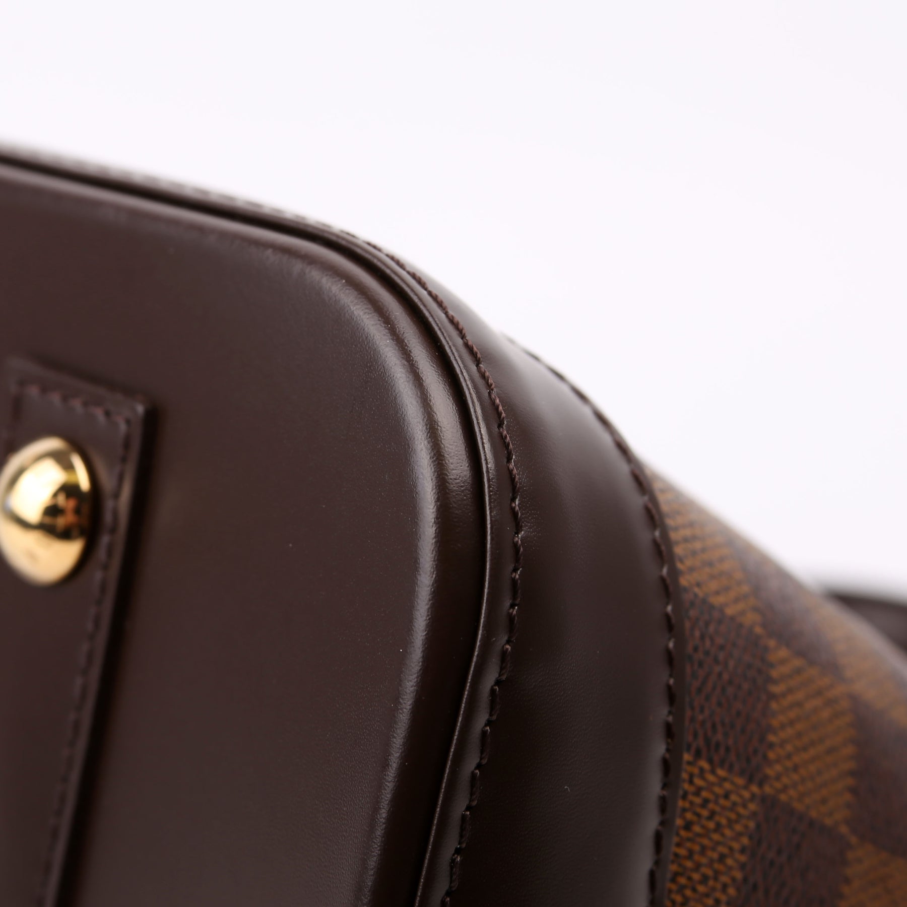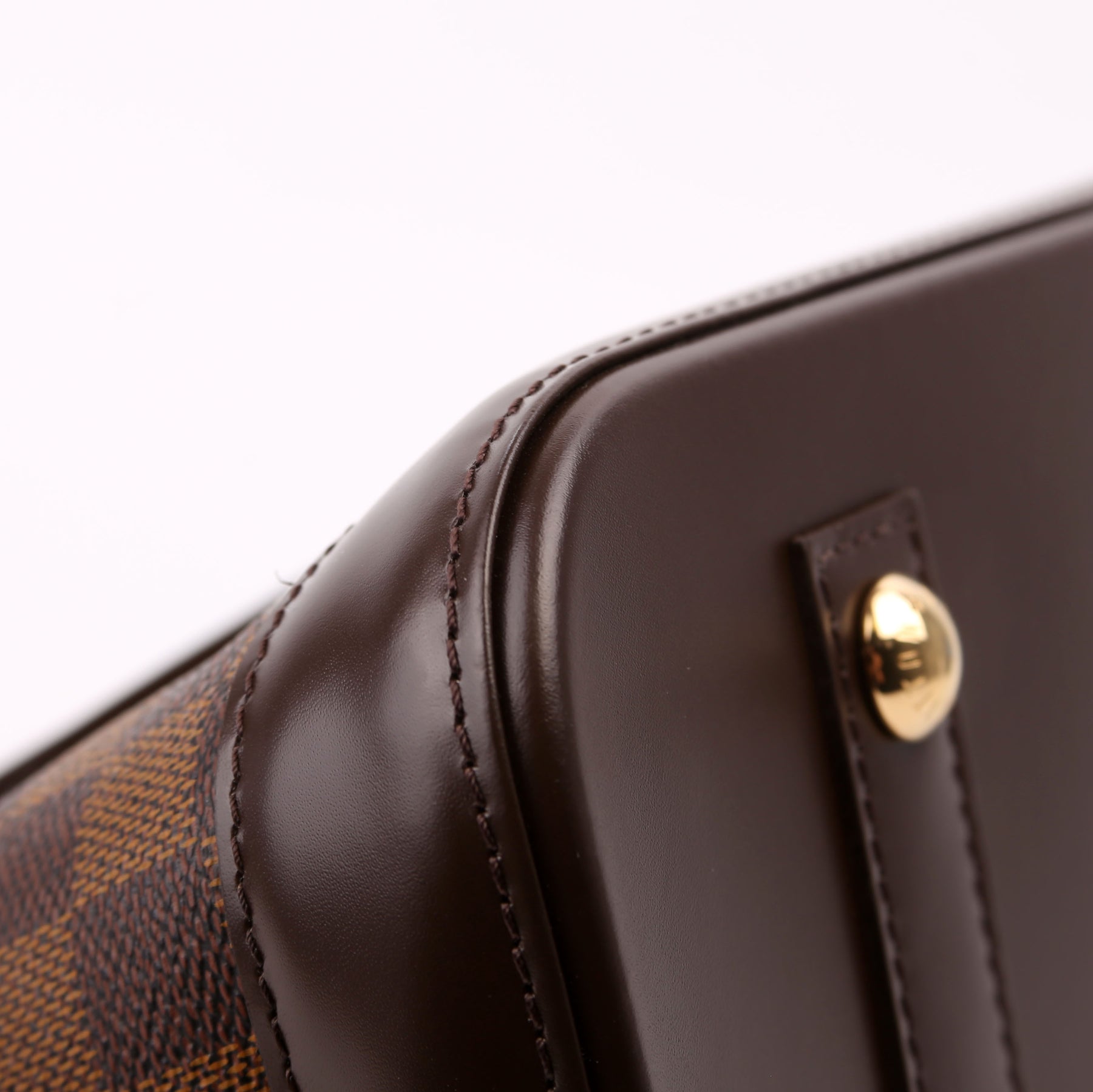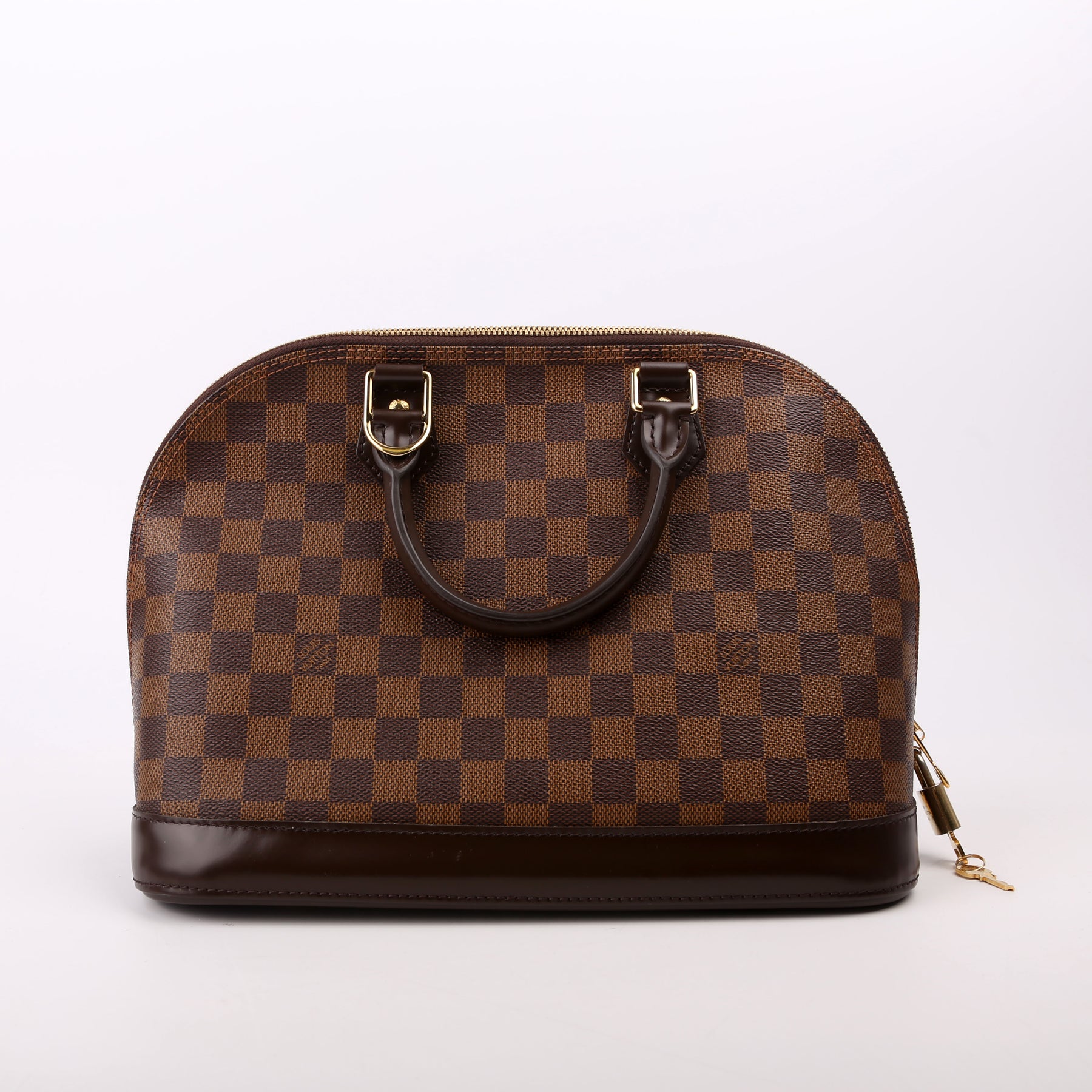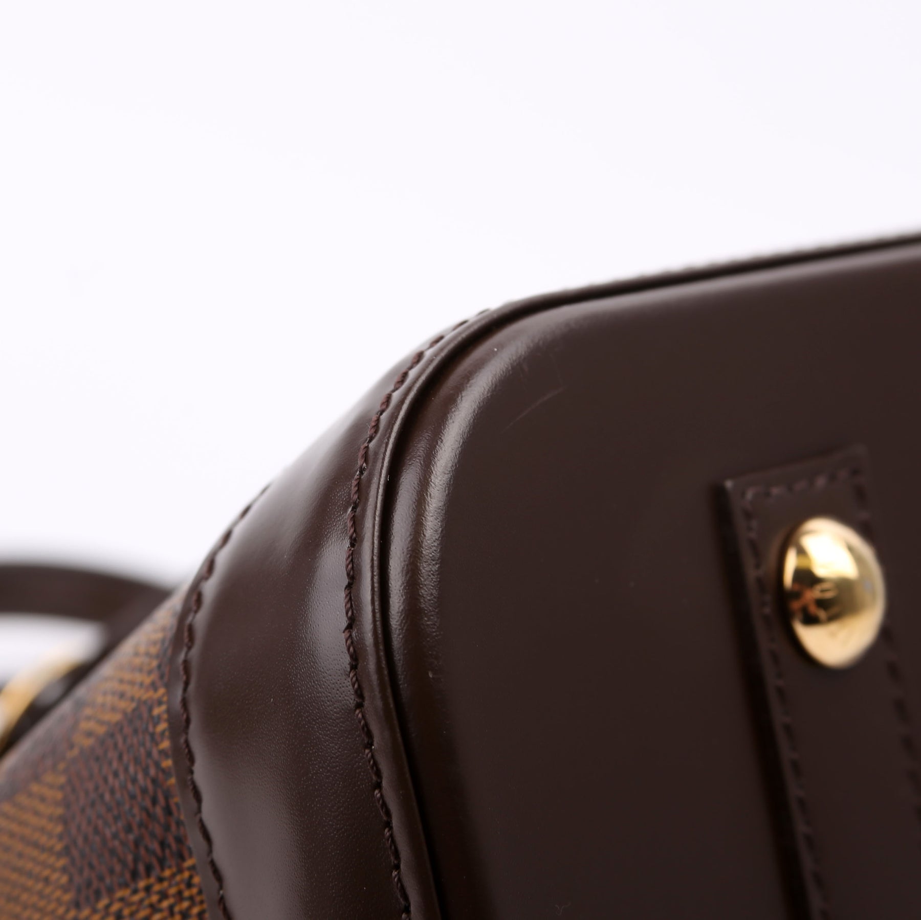 This pre-owned Louis Vuitton Alma PM Newer is guaranteed 100% authentic. The exterior is in the classic Louis Vuitton Damier Ebene coated canvas.