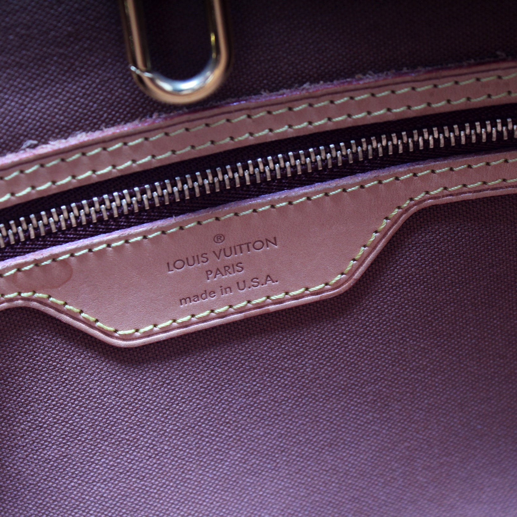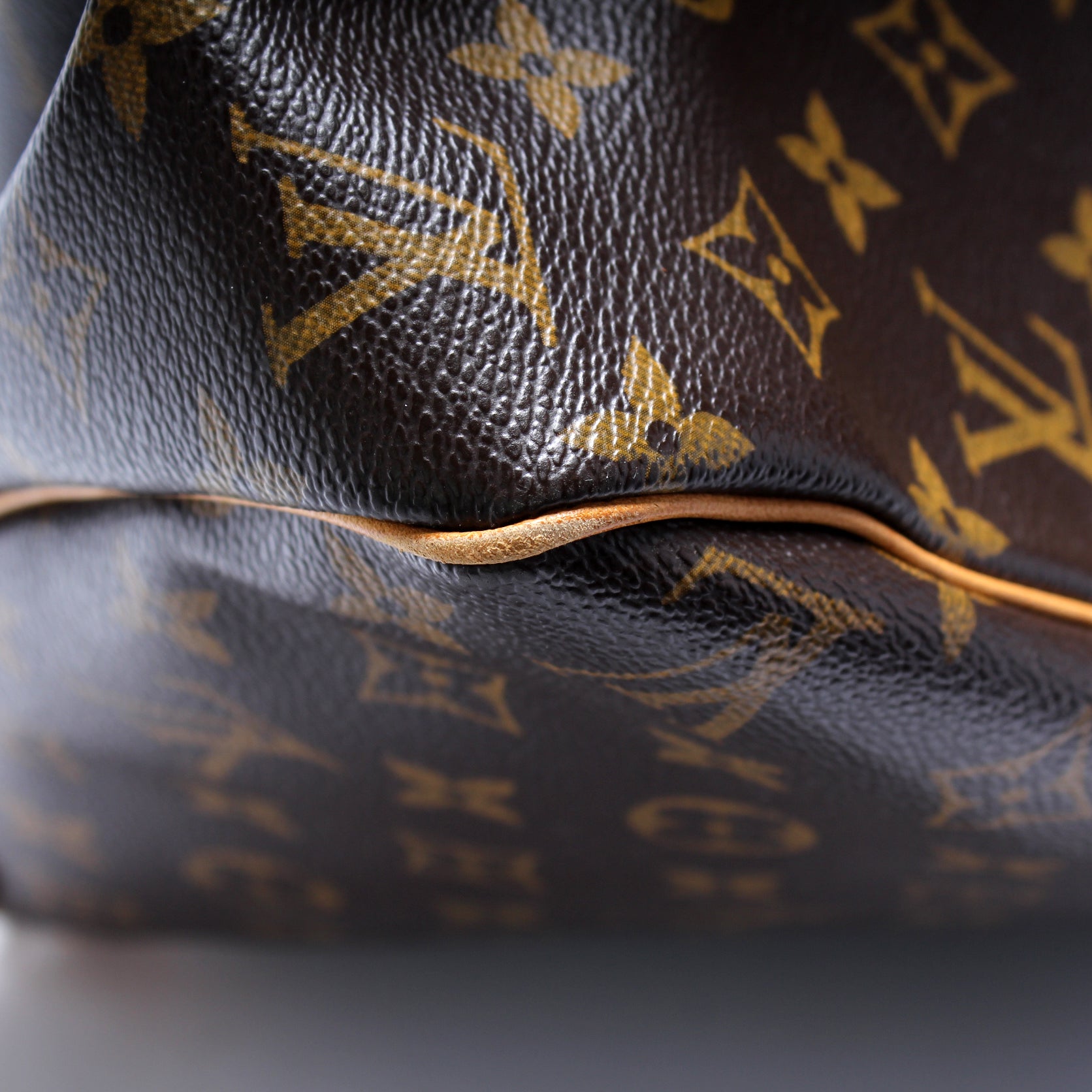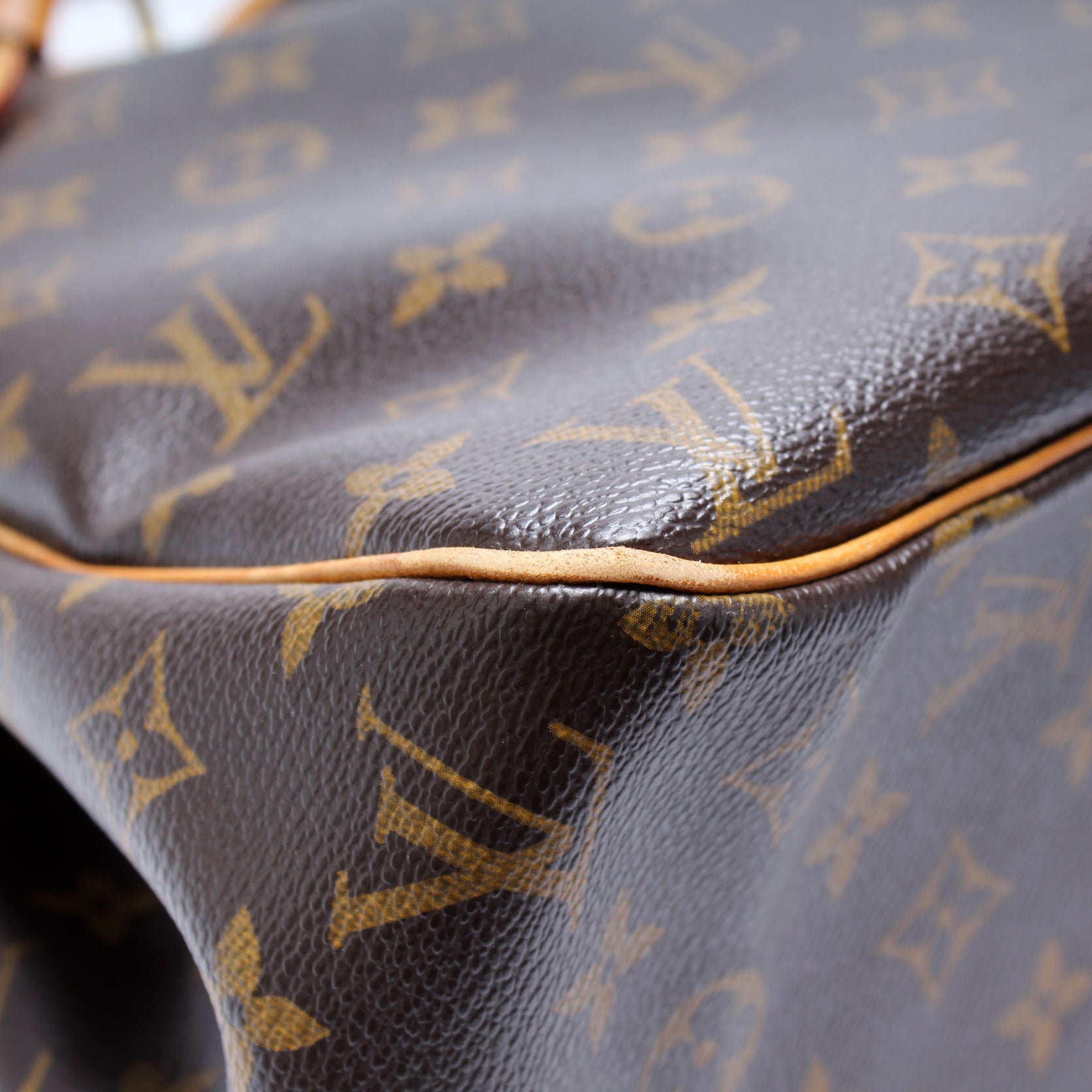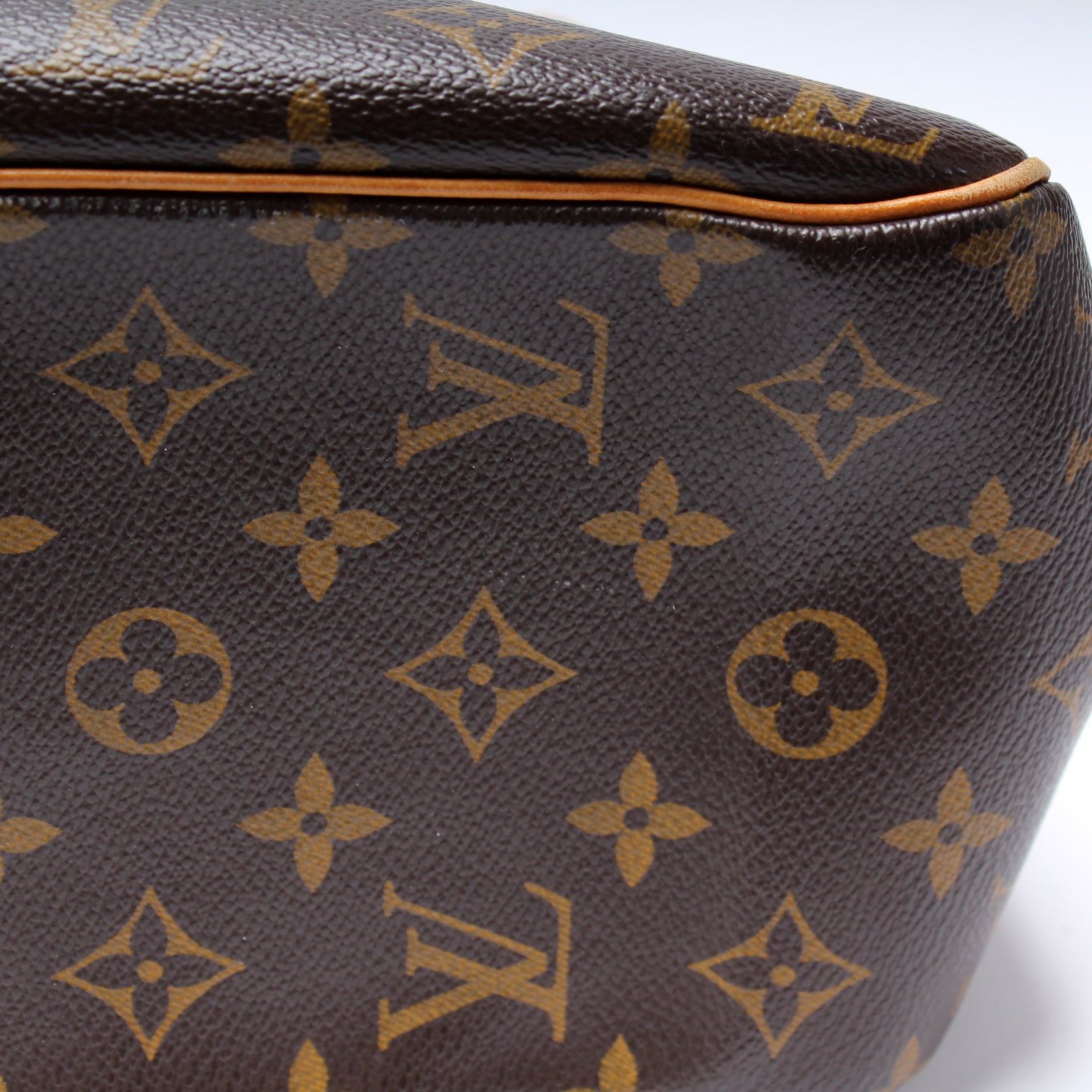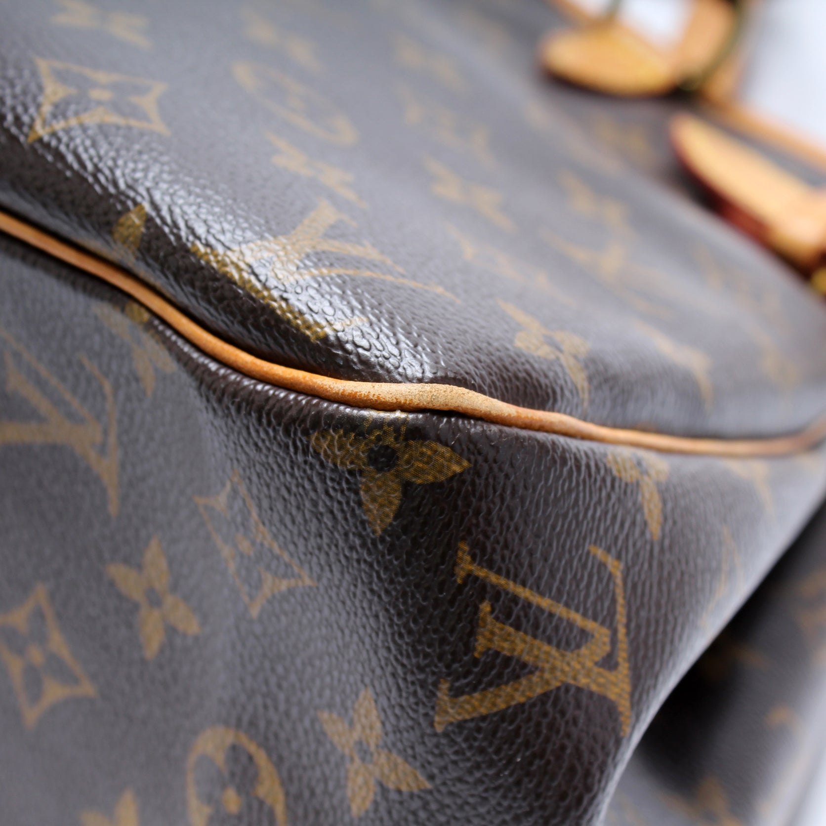 Exterior: The exterior coated canvas is free from any rips or cracks. The leather trim shows signs of wear and discoloration. The corners show minor wear.