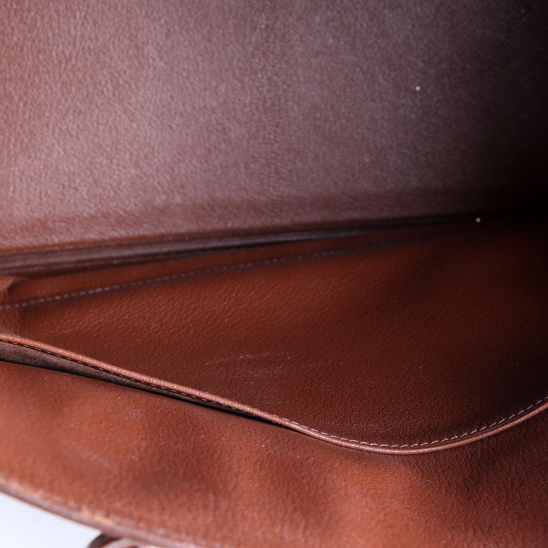 Exterior: The exterior leather shows light scratches throughout. The corners show wear and rubbing.
