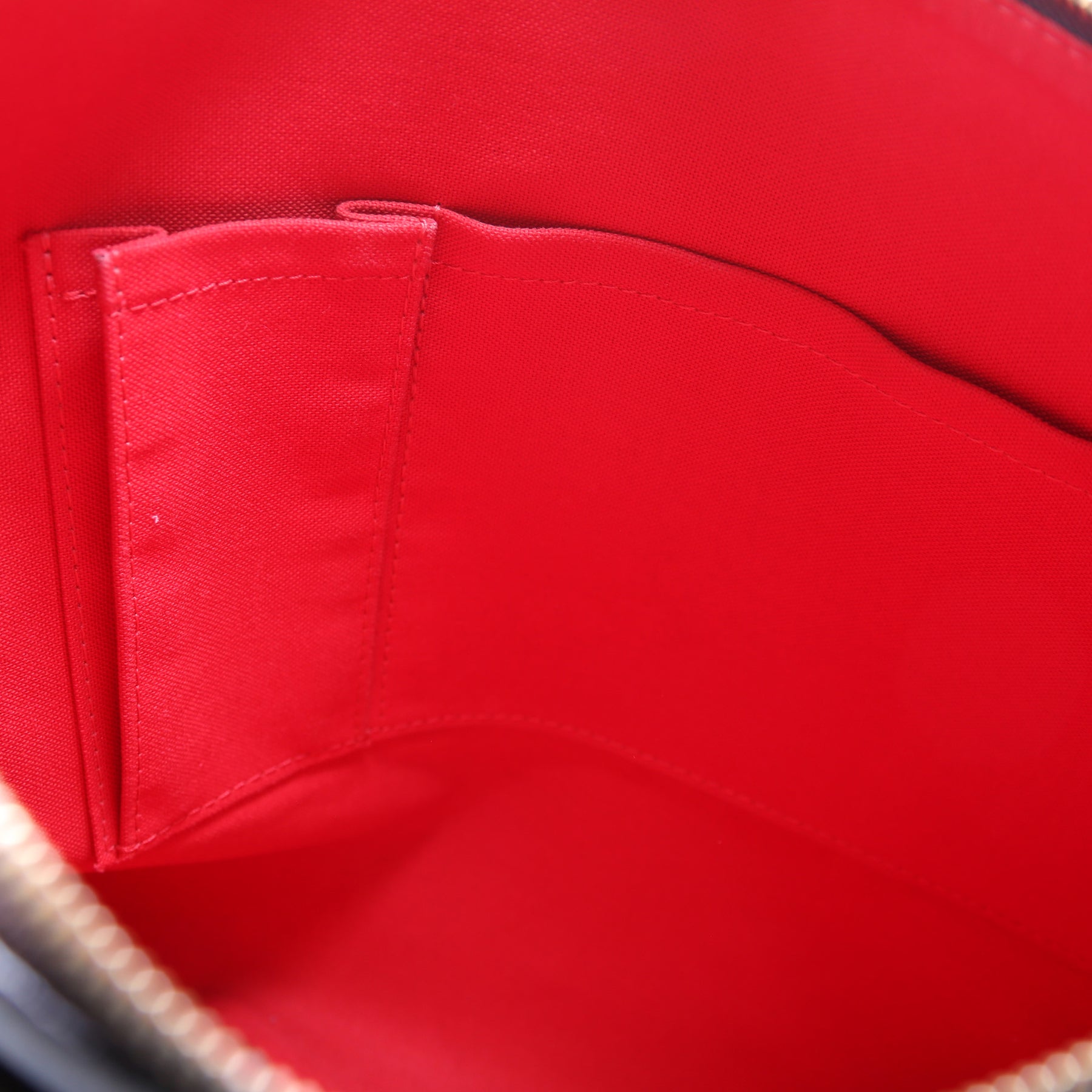 Exterior: The exterior coated canvas is free of any rips or cracks. The leather trim shows minor scuffs. The exterior features one zip closure pocket.
