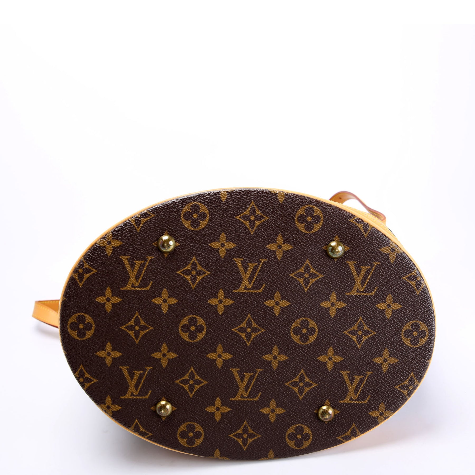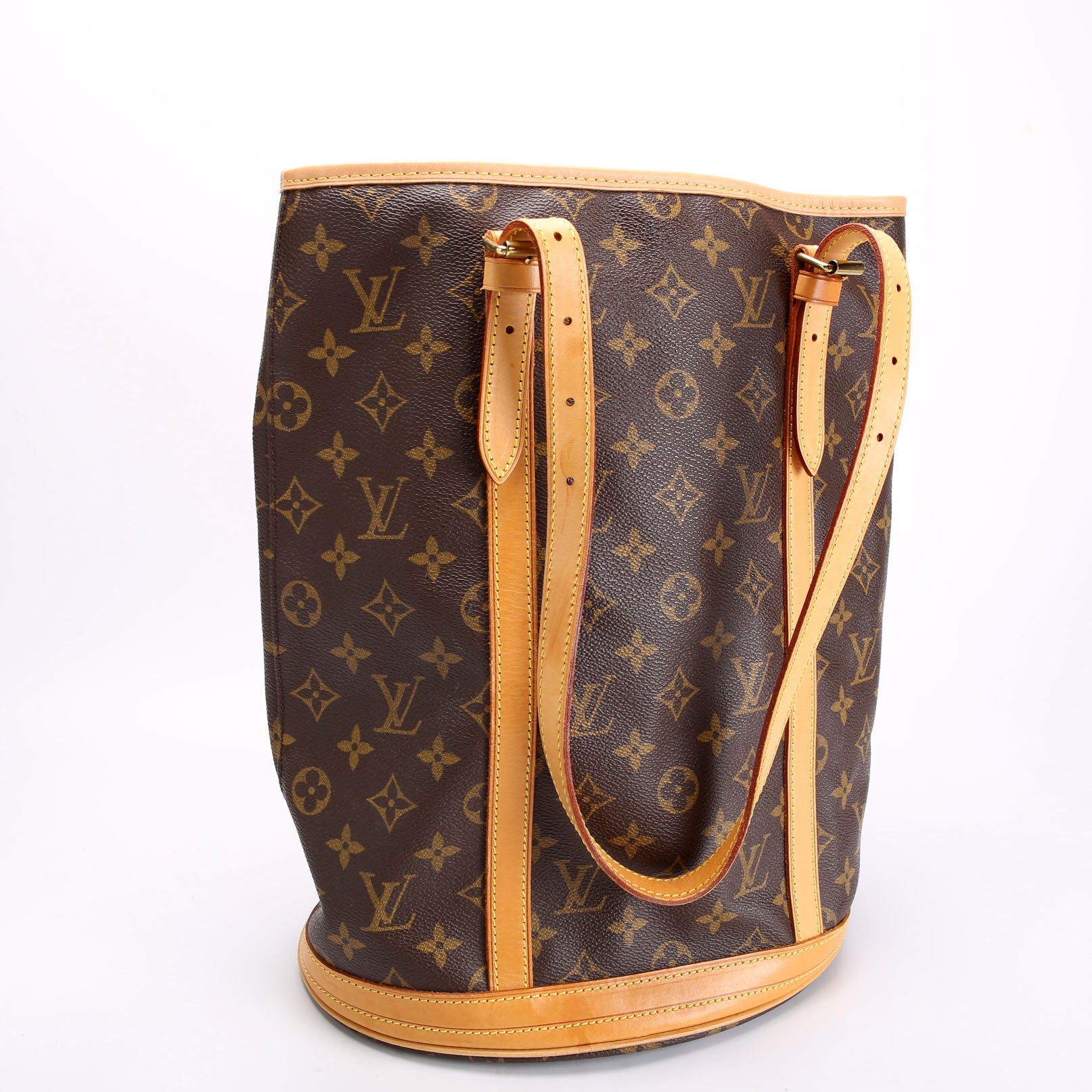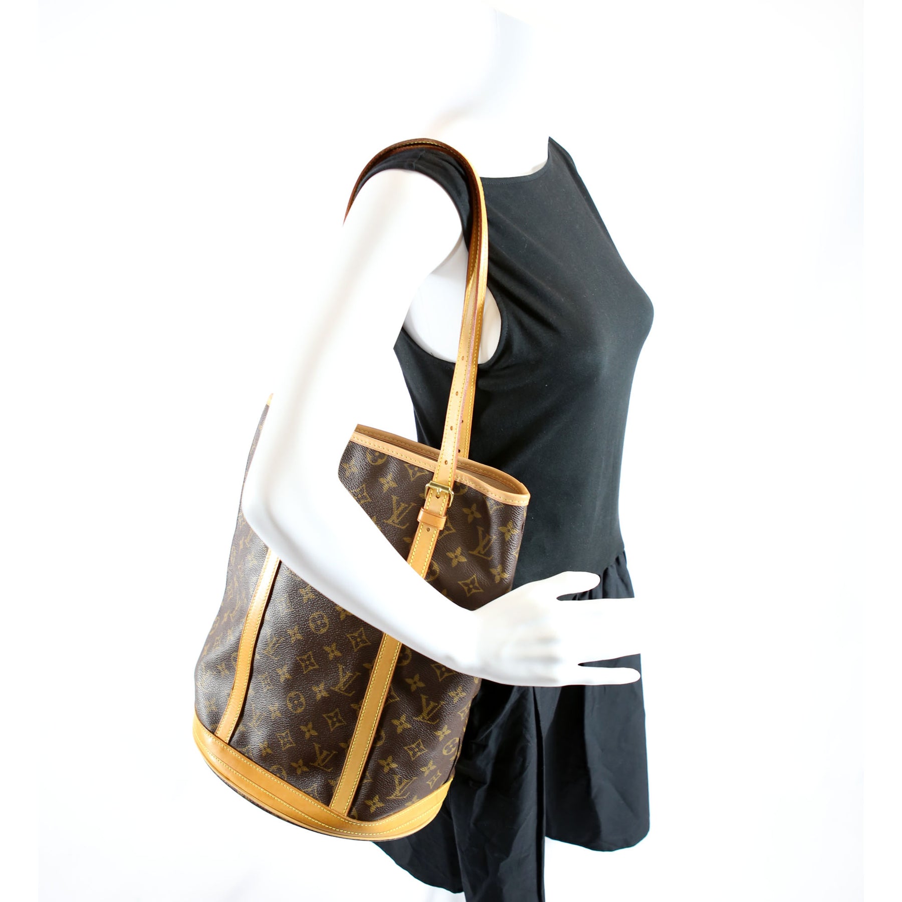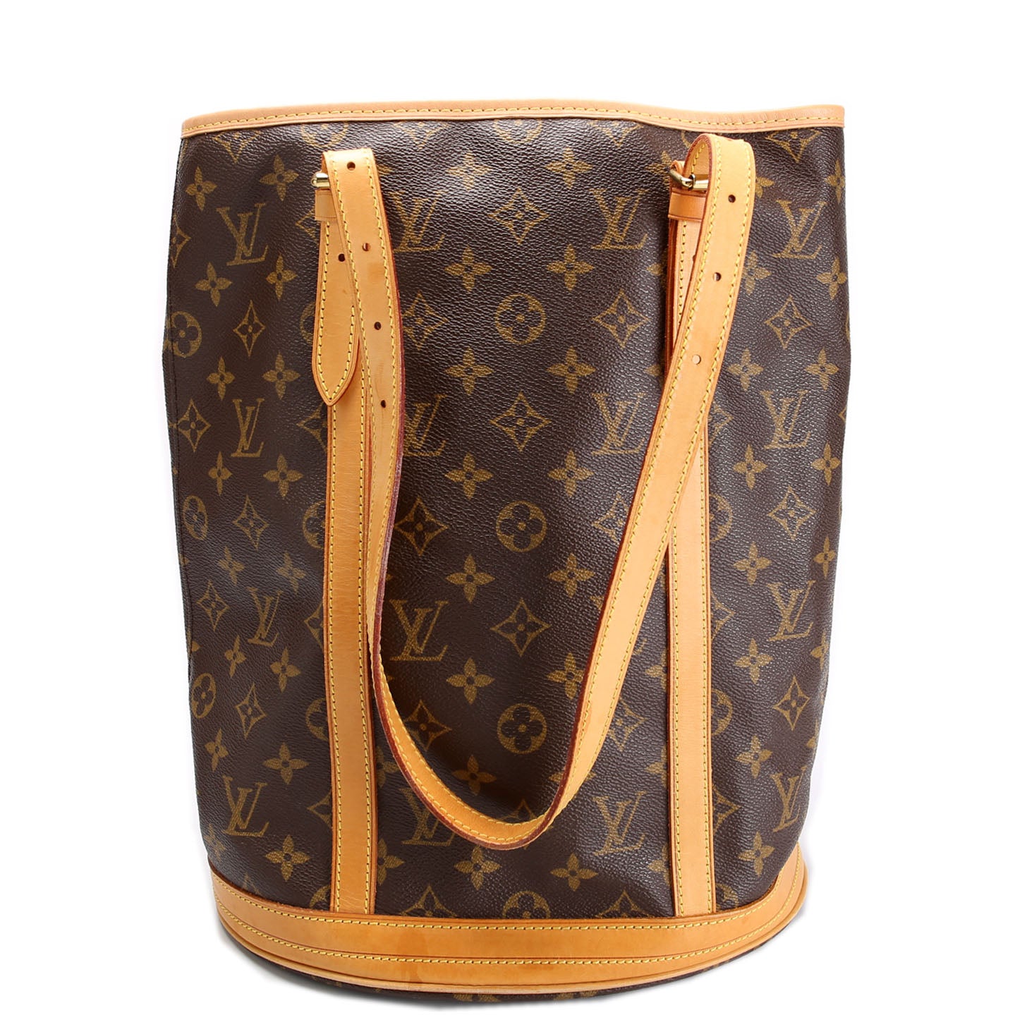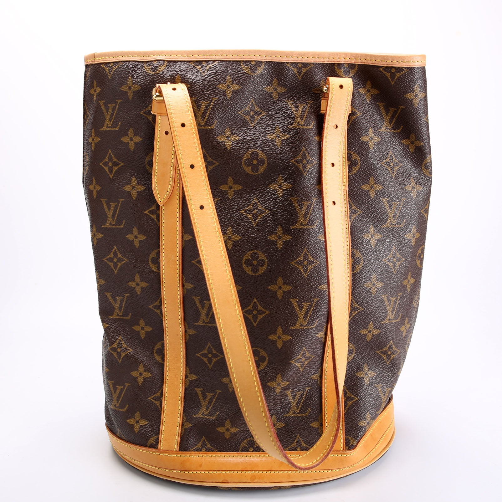This pre-owned Louis Vuitton Bucket GM is guaranteed 100% authentic. The exterior is in the classic Louis Vuitton Coated Canvas Monogram