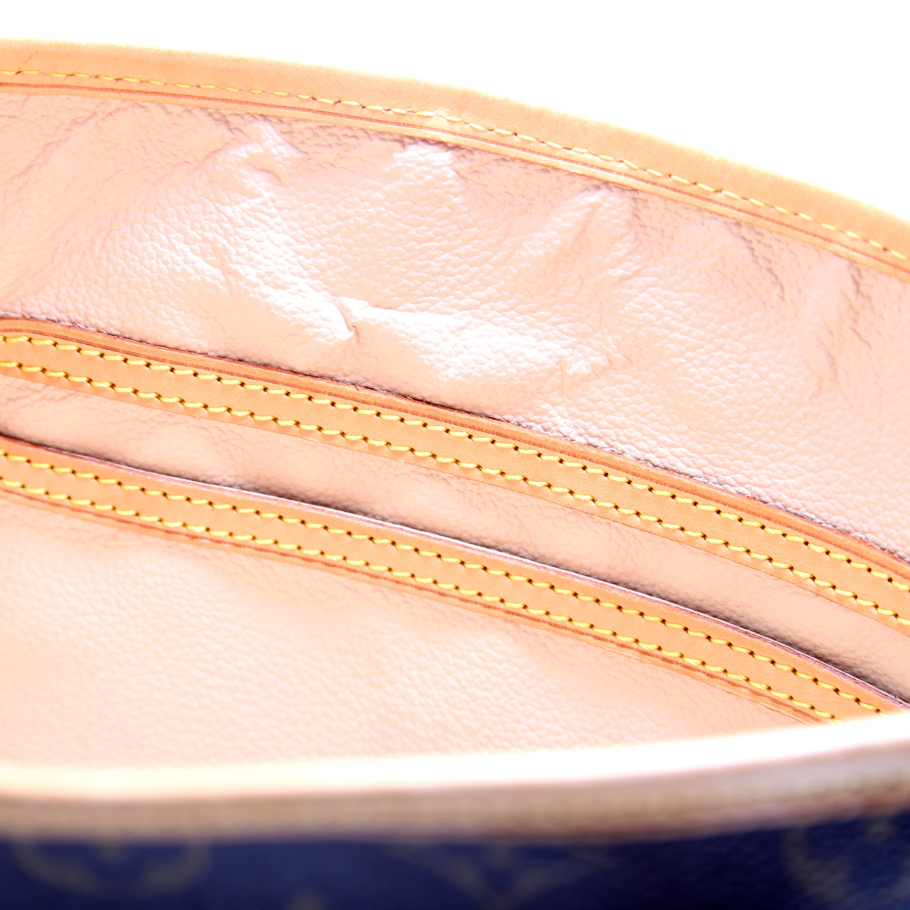 Exterior: The exterior coated canvas is free from any rips or cracks, there is light discoloration throughout. The corners and leather trim show minor wear and discoloration.