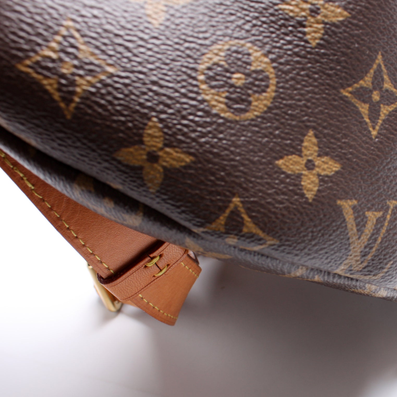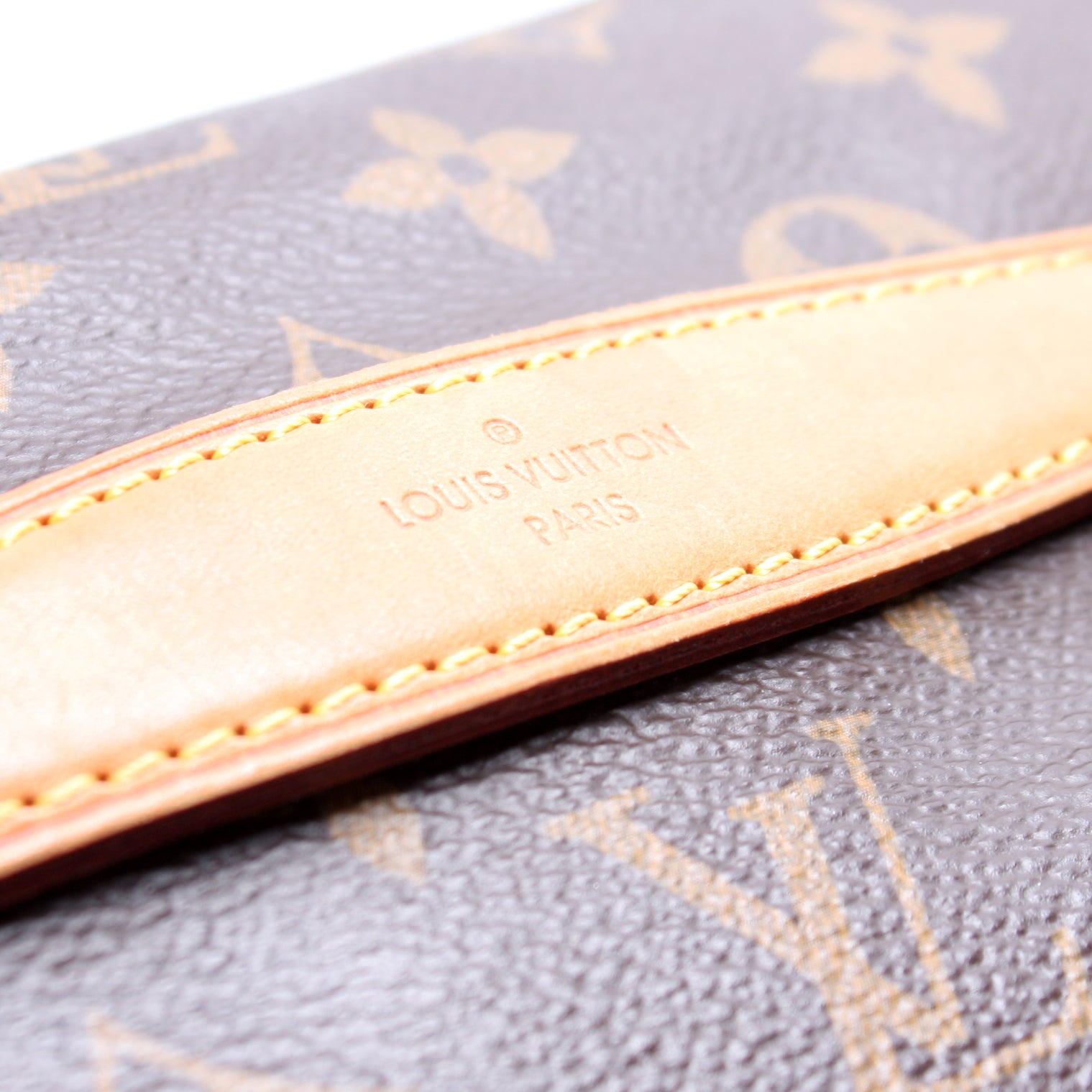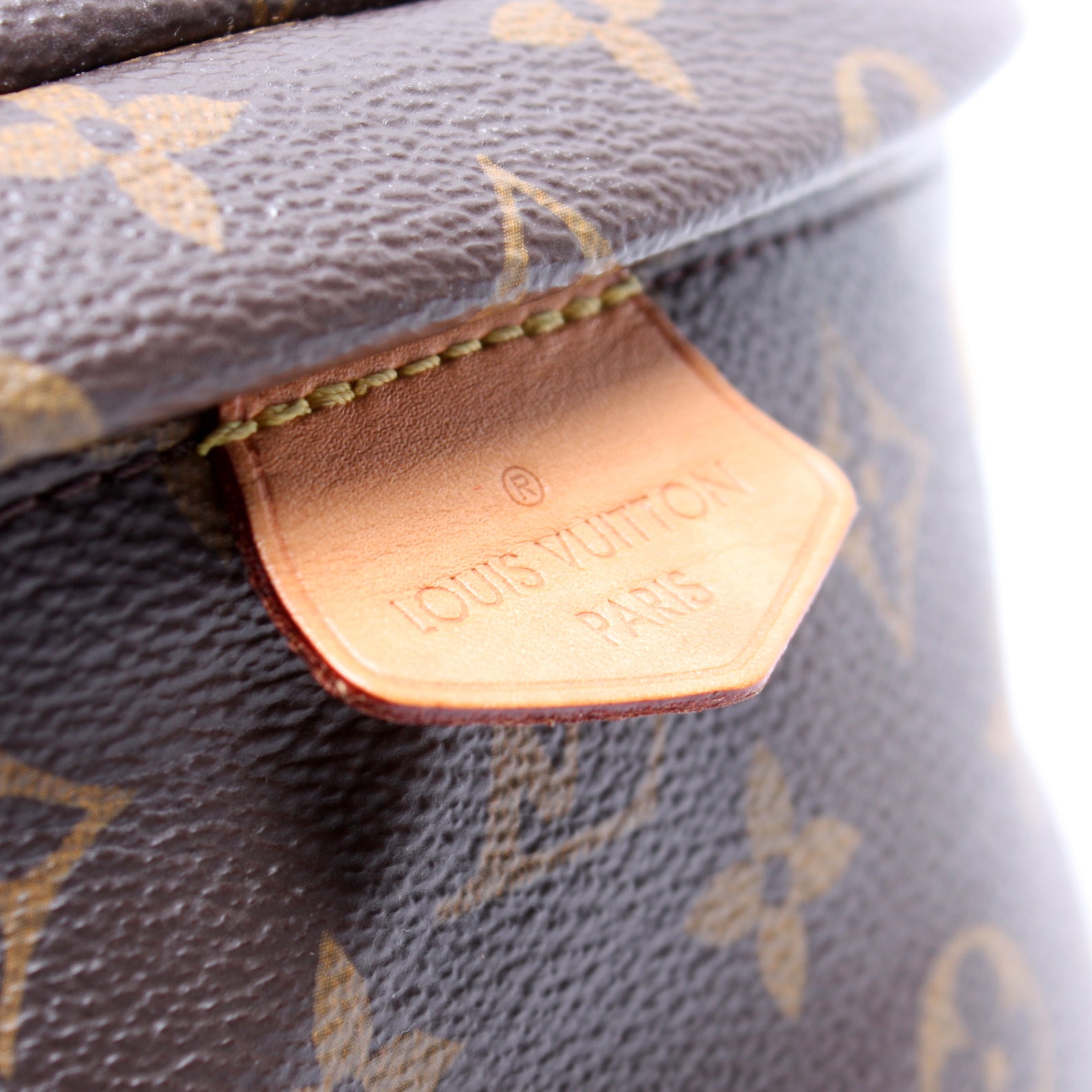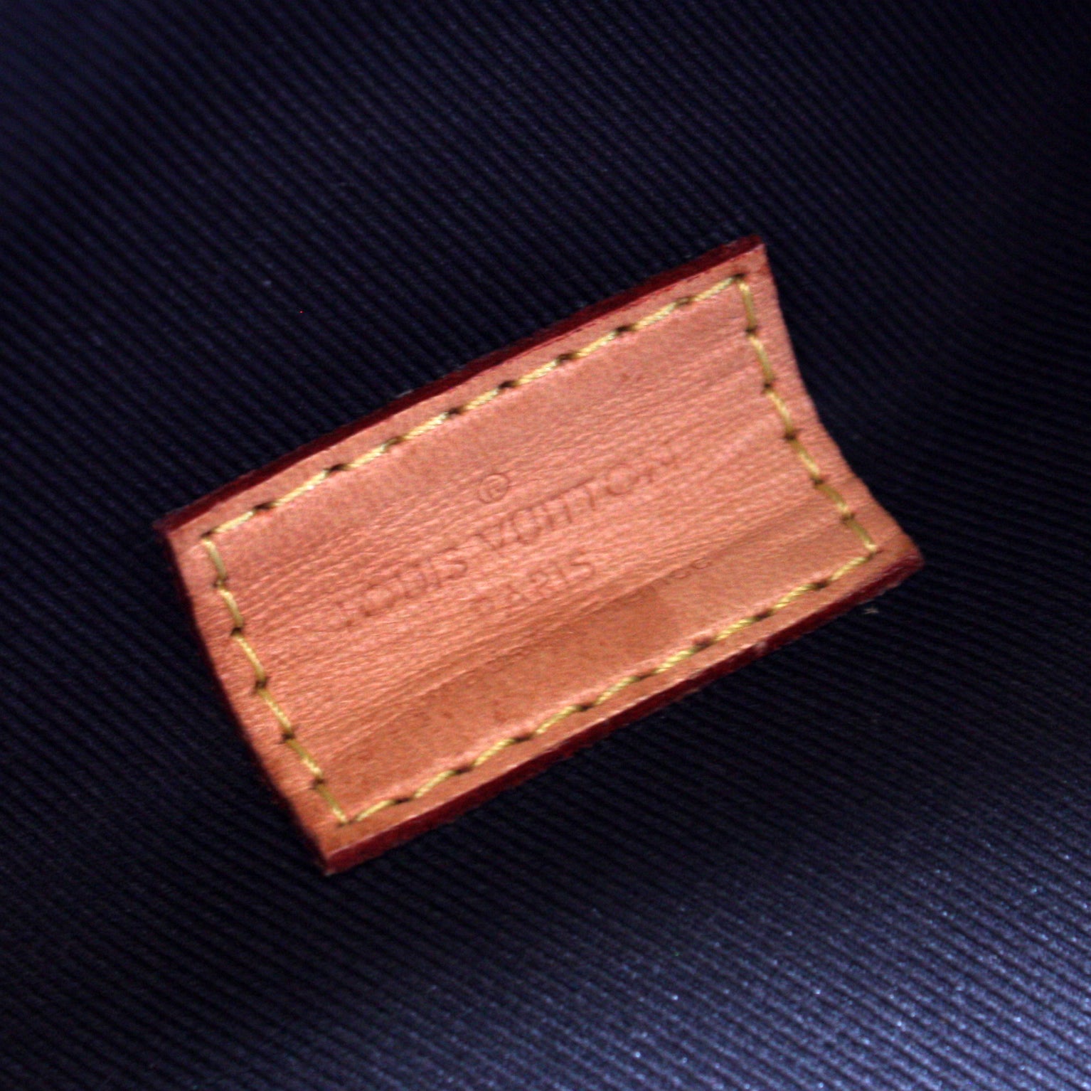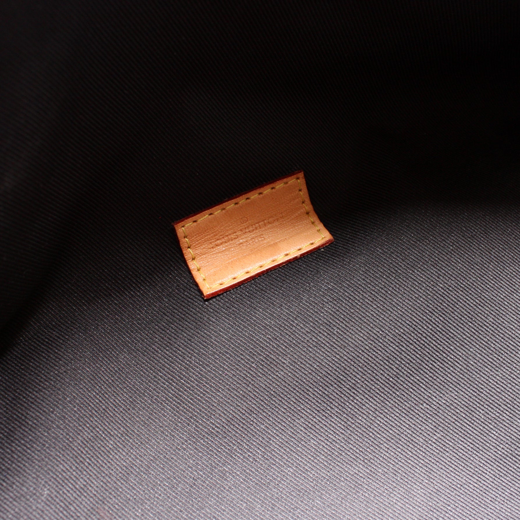 Interior: The interior is clean and free of rips or tears. The LV leather logo shows creasing and discoloration.