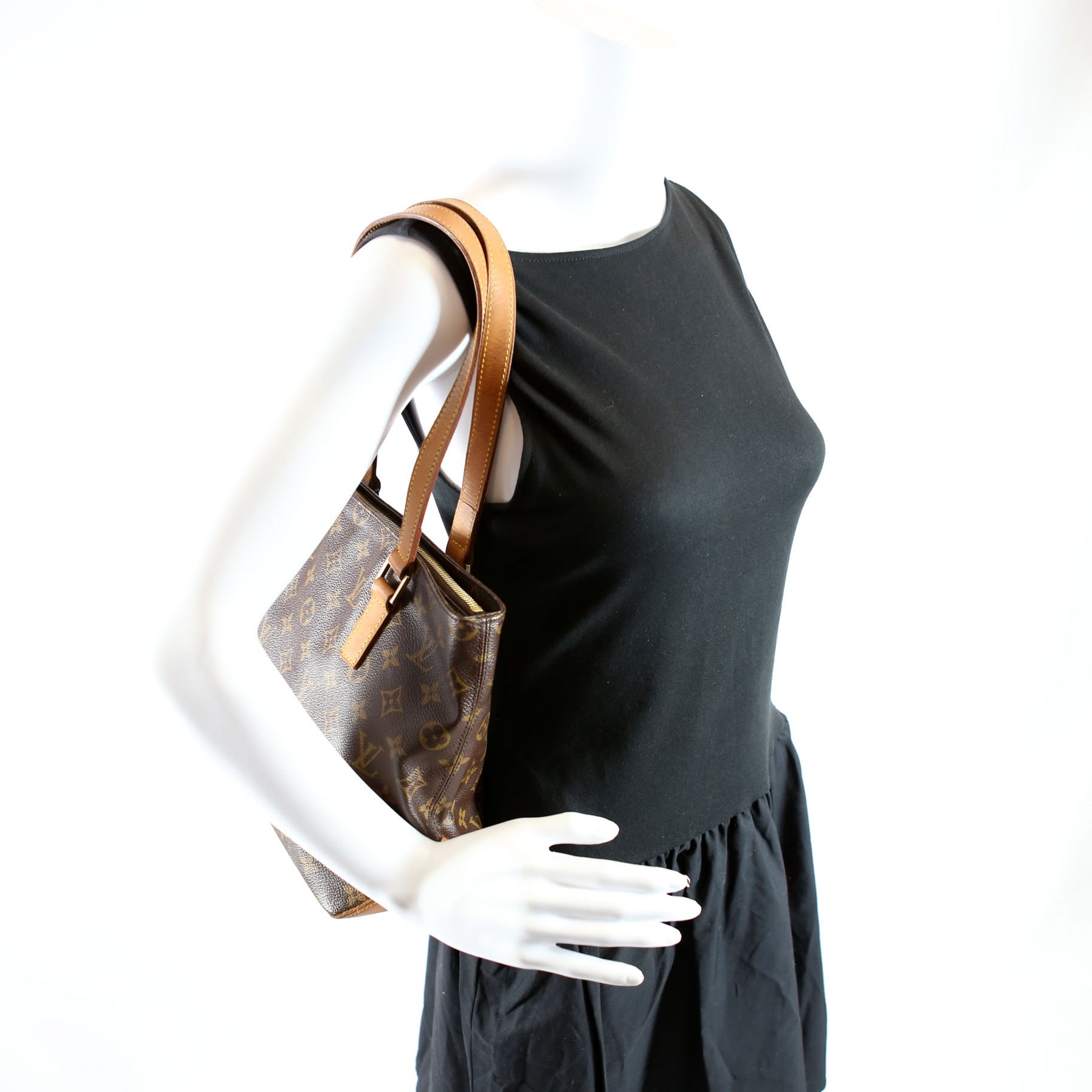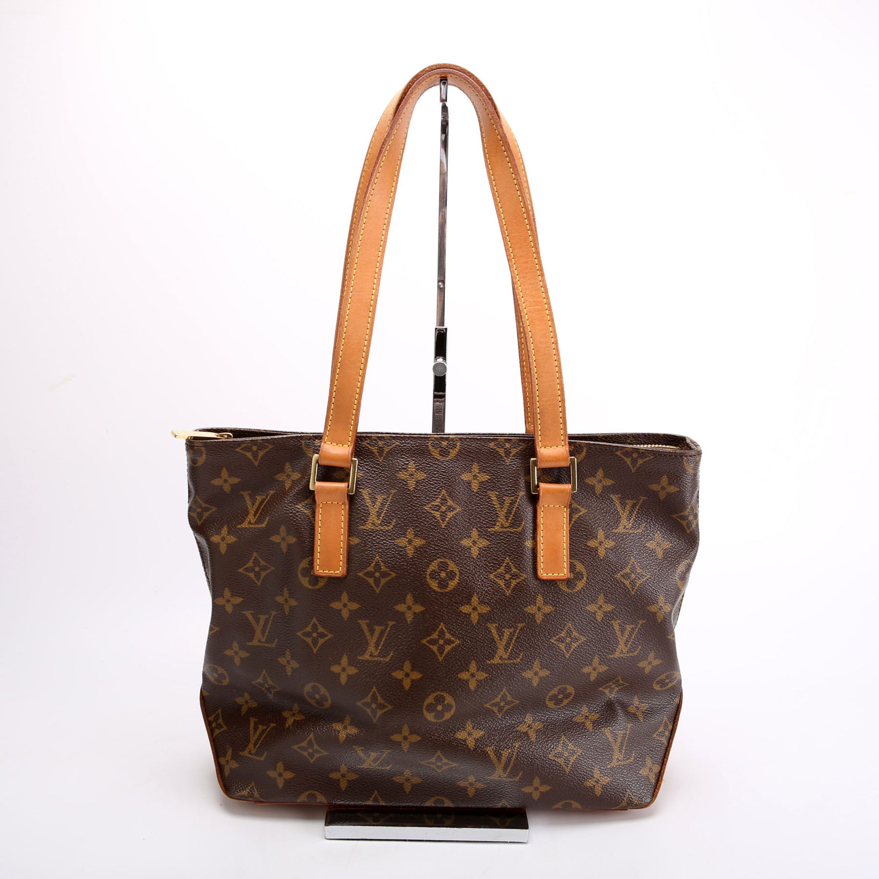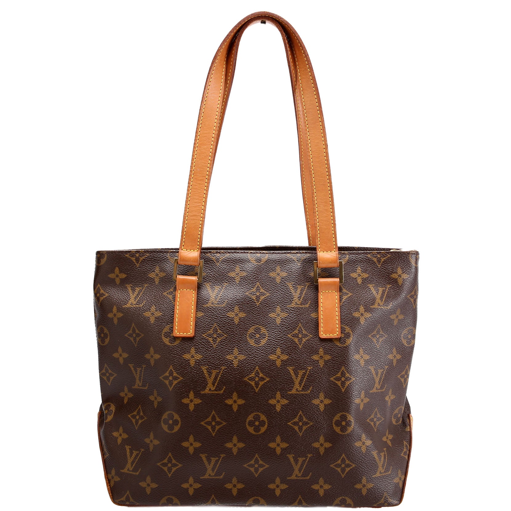 This pre-owned Louis Vuitton Cabas Piano is guaranteed 100% authentic. The exterior is in the classic Louis Vuitton Monogram coated canvas.