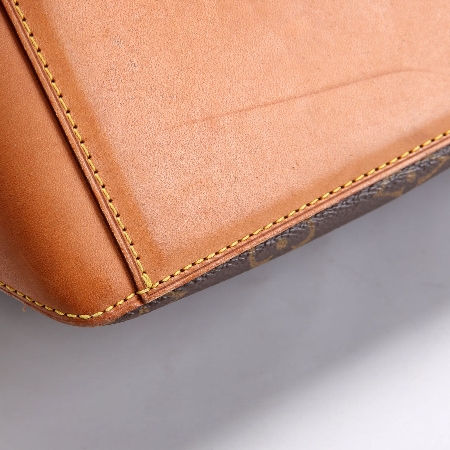 Exterior: The exterior coated canvas shows light fading. The corners show wear and rubbing. The leather base shows wear, scuffs, and rubbing.