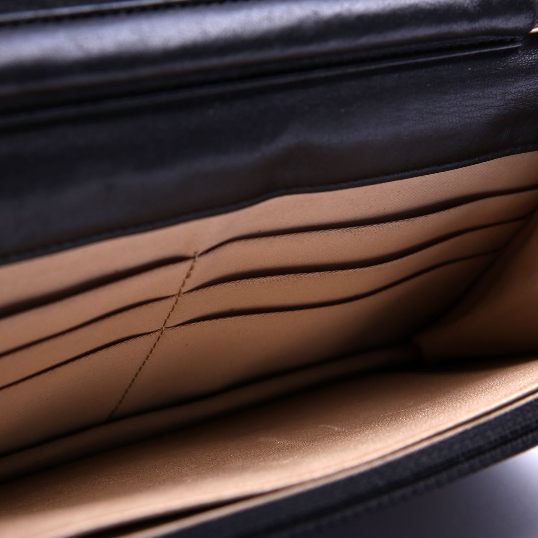 Interior: The interior shows minor wear and discoloration throughout, and it features six card slots, two open pockets, and two zip closure pockets.