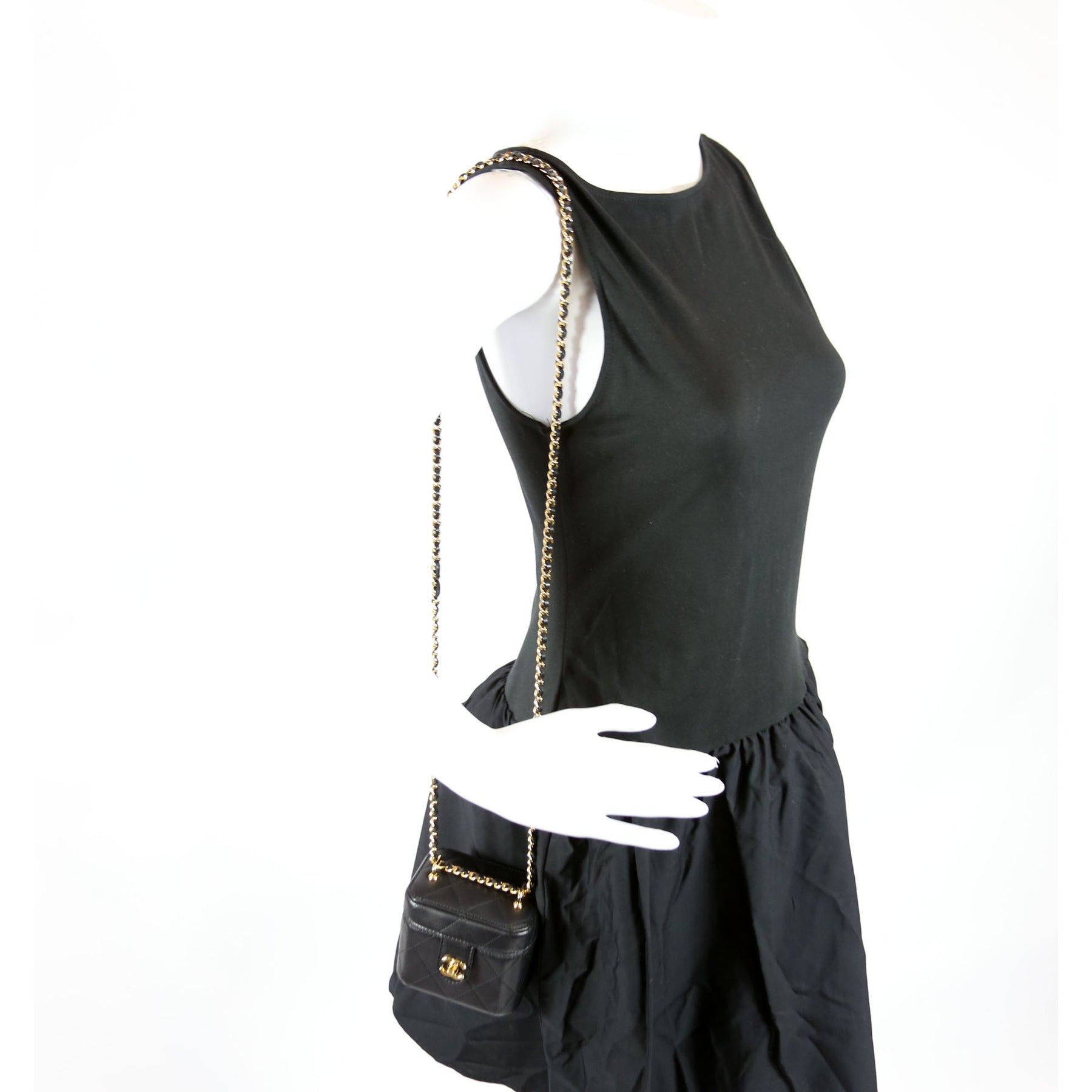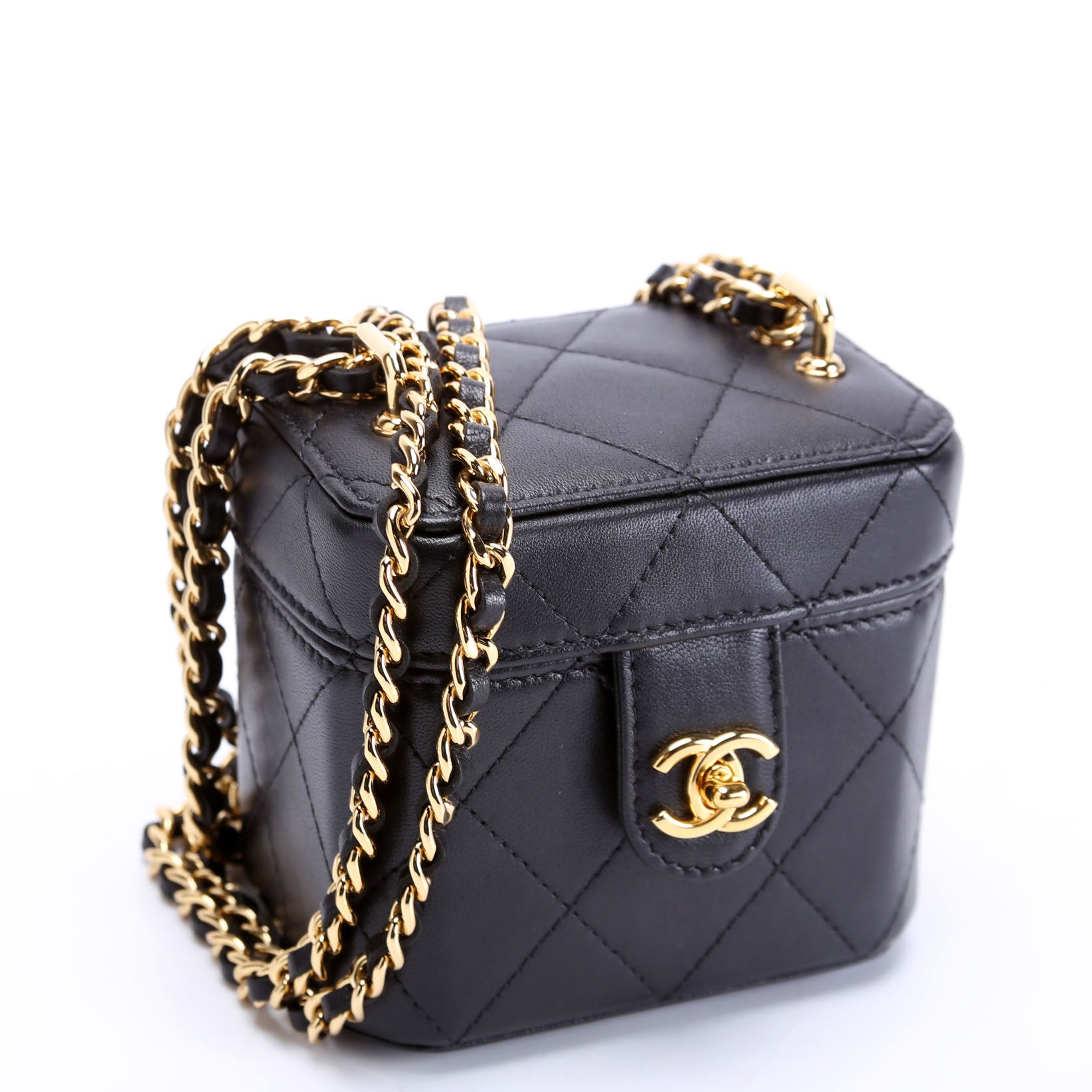 This pre-owned Chanel CC Turnlock Mini Vanity Clutch With Chain is guaranteed 100% authentic. The exterior is in the classic Chanel Quilted Lamb Leather.
