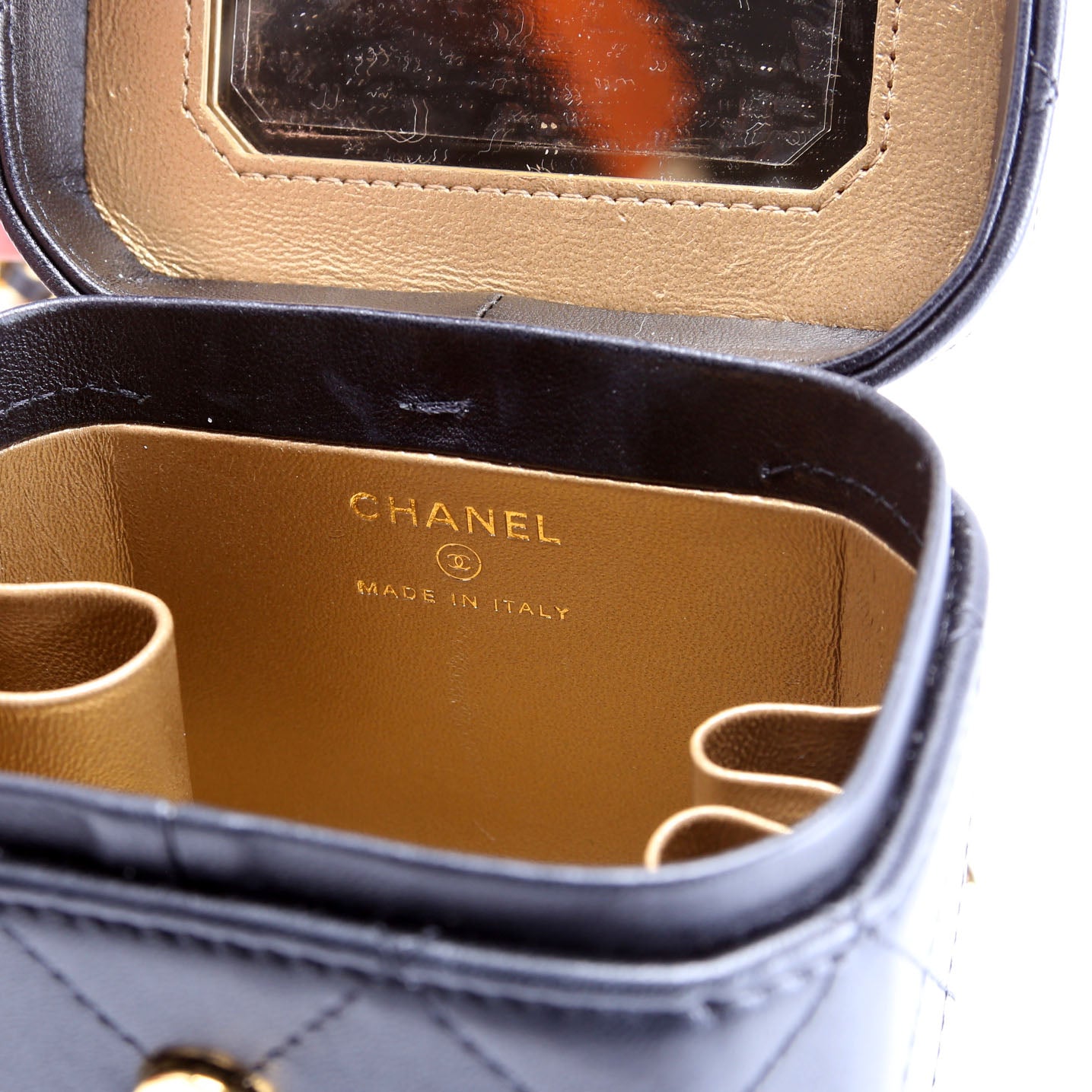 Interior: The interior has signs of discoloration and scratching throughout. The mirror is scratched as pictured. The interior features one mirror and one lipstick open pocket.