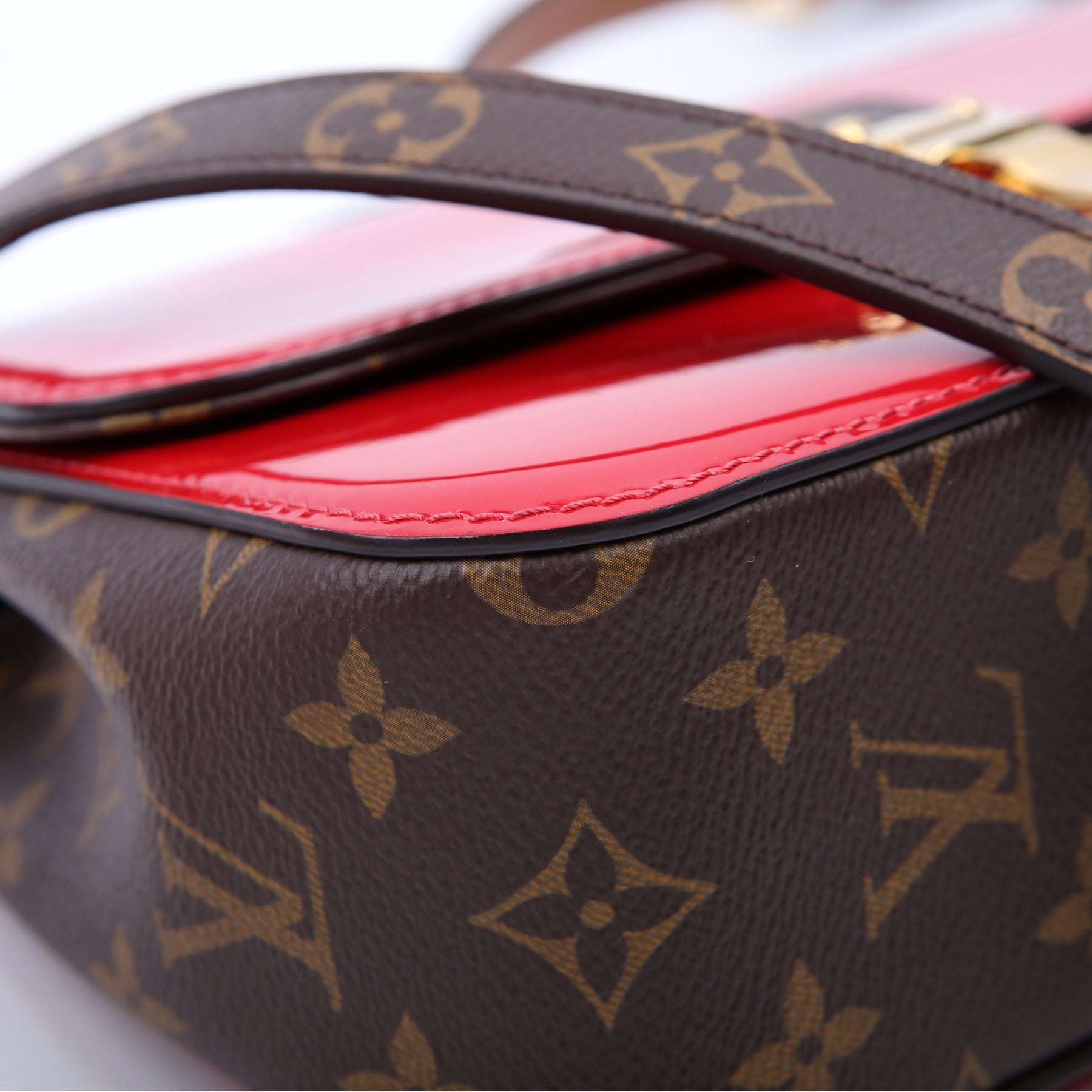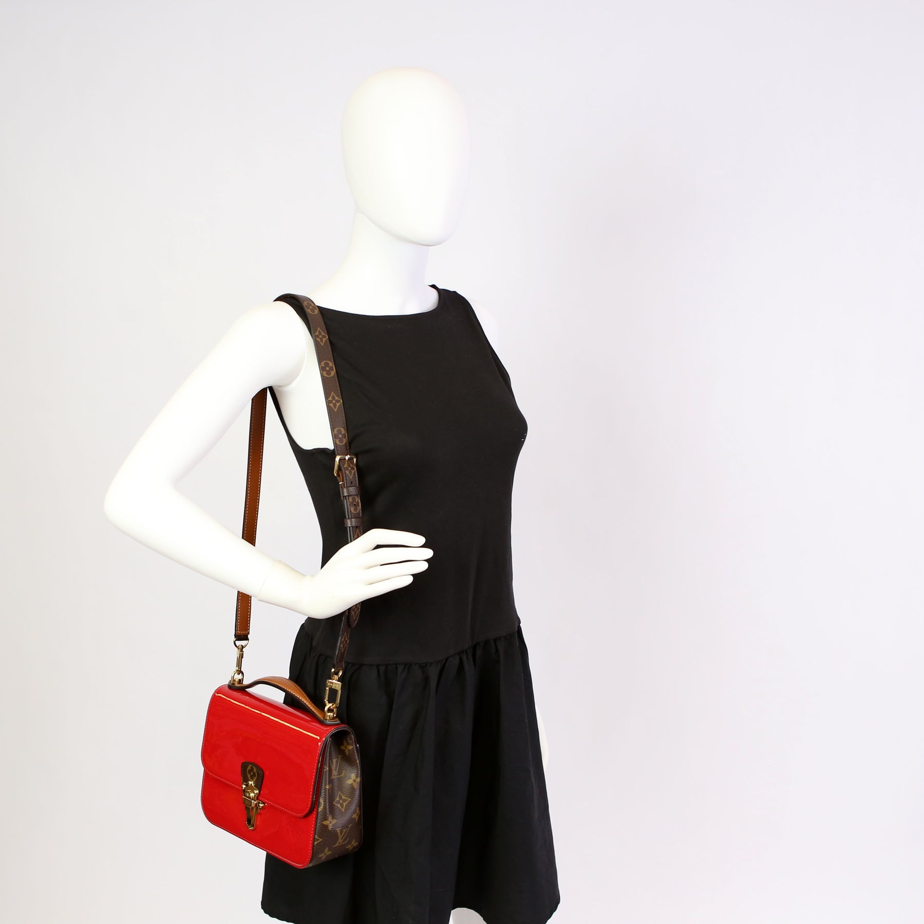 This pre-owned Louis Vuitton Cherrywood BB is guaranteed 100% authentic. The exterior is in the classic Louis Vuitton patent leather and monogram coated canvas.