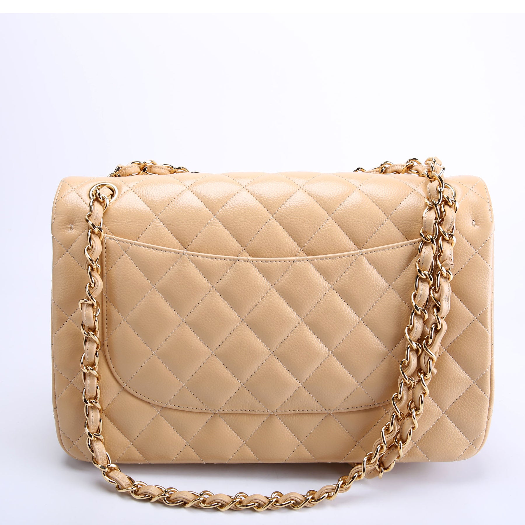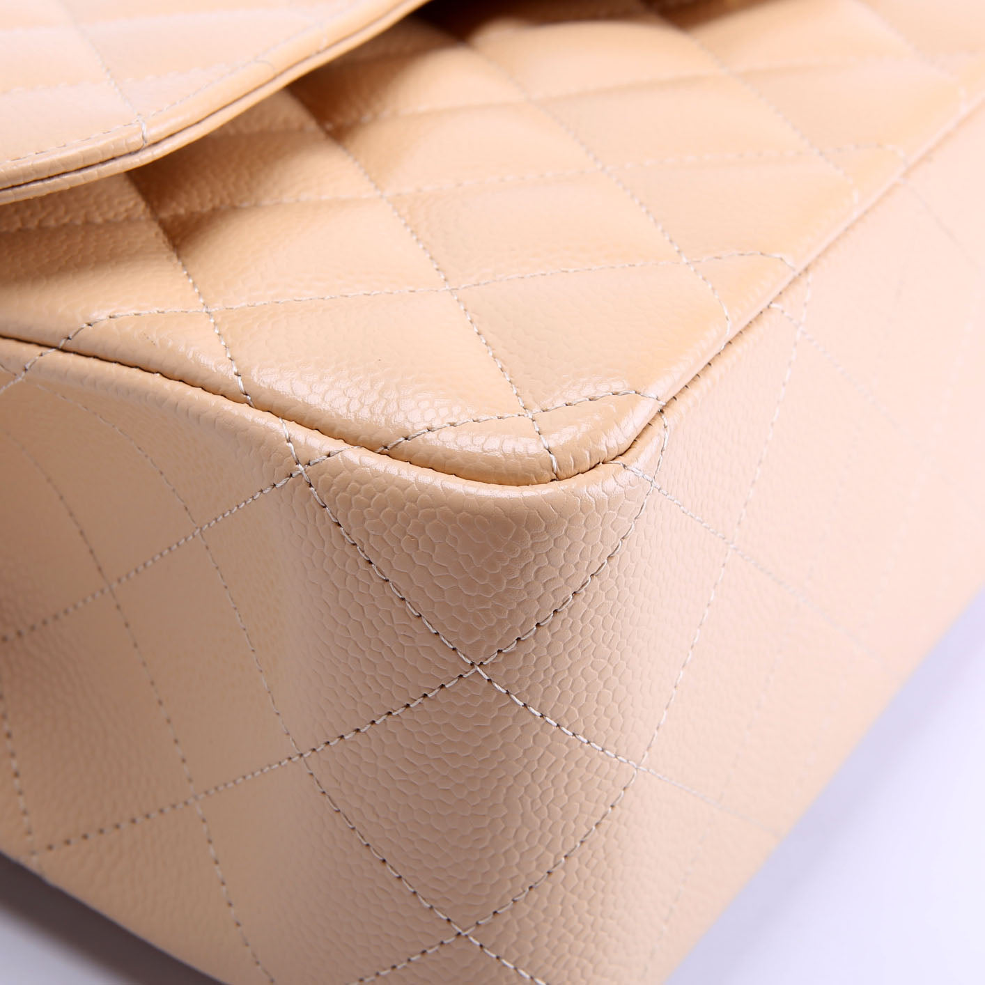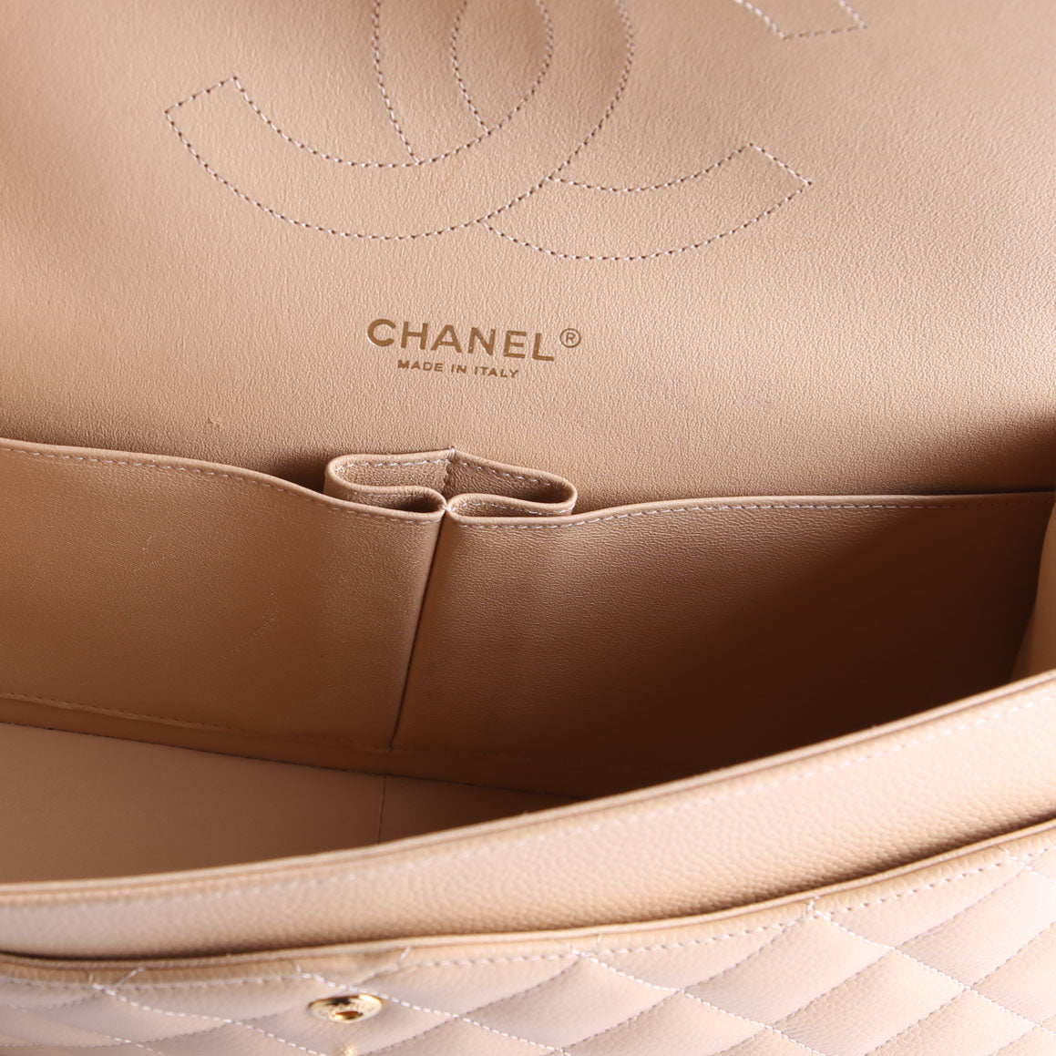 This pre-owned Chanel Classic Flap Jumbo is guaranteed 100% authentic. The exterior is in the classic Chanel Caviar Leather.