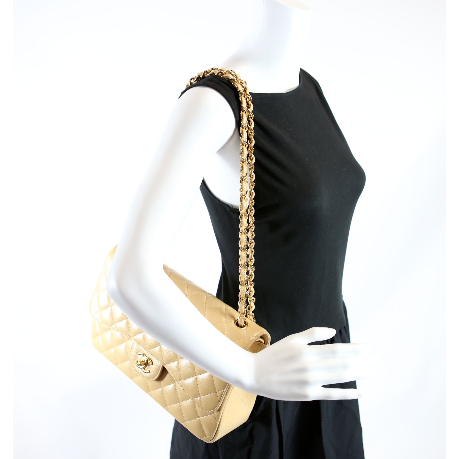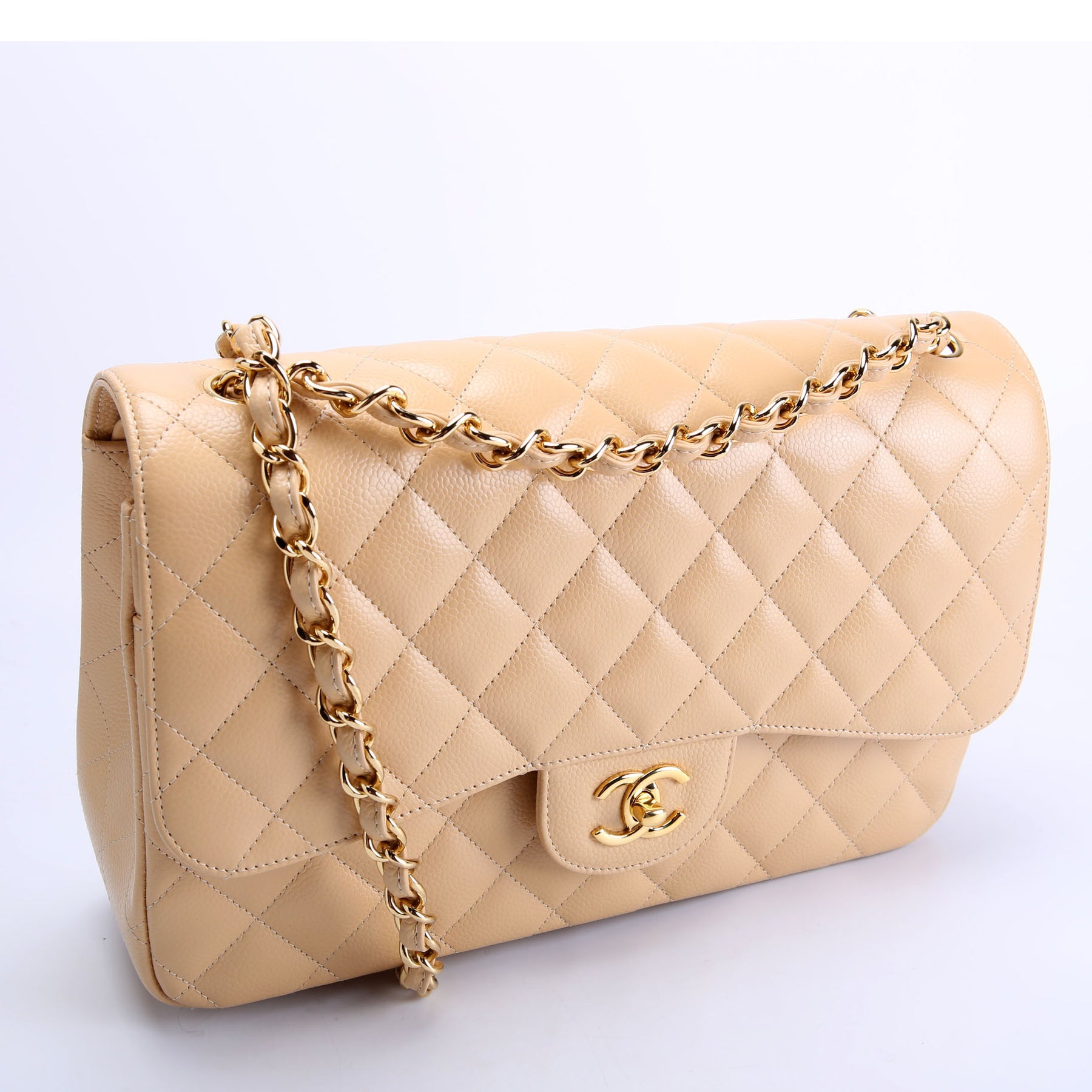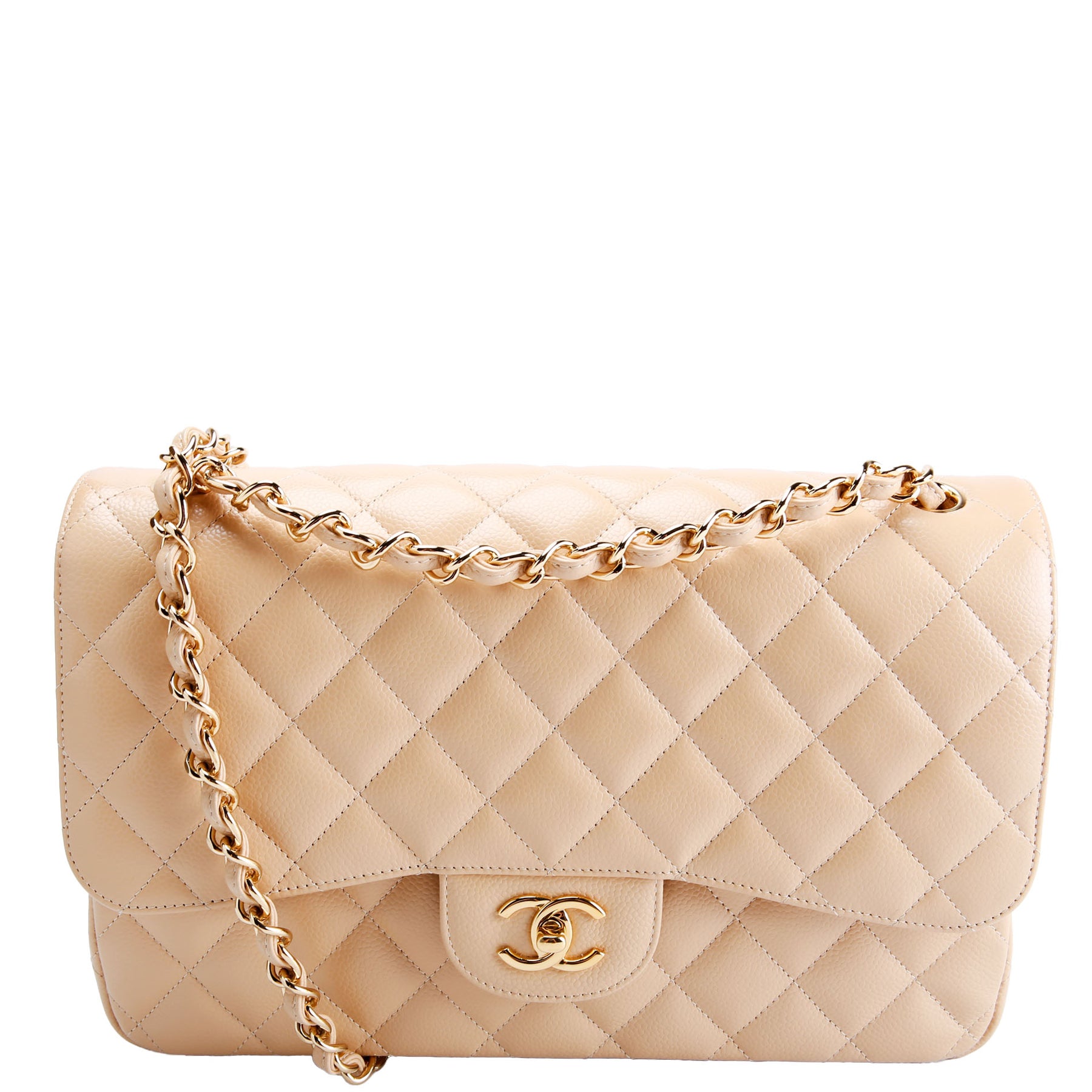 This pre-owned Chanel Classic Flap Jumbo is guaranteed 100% authentic. The exterior is in the classic Chanel Caviar Leather.
