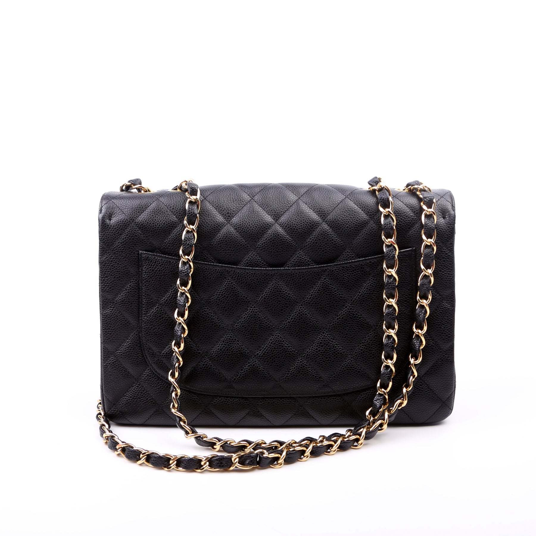 This pre-owned Chanel Classic Flap Jumbo is guaranteed 100% authentic. The exterior is in the classic Chanel Caviar leather.
