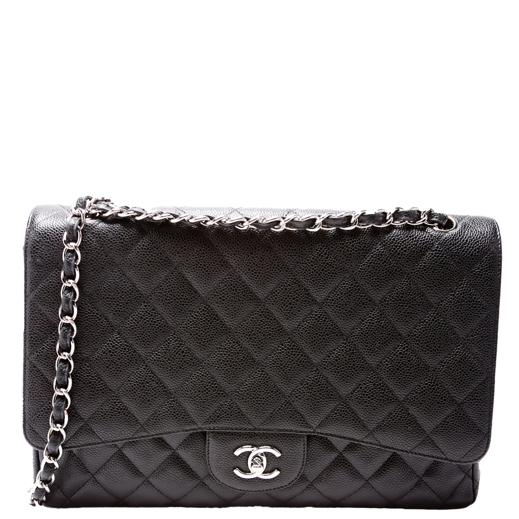 This pre-owned Chanel Classic Flap Maxi Shoulder Bag is guaranteed 100% authentic. The exterior is in the classic Chanel Caviar leather.