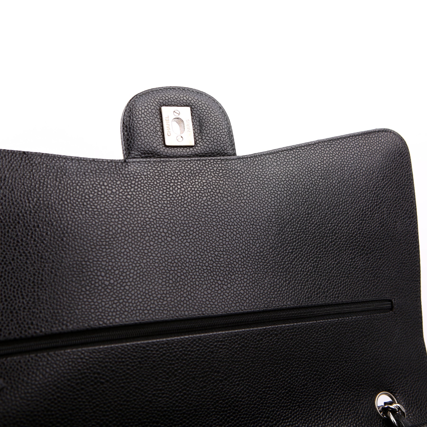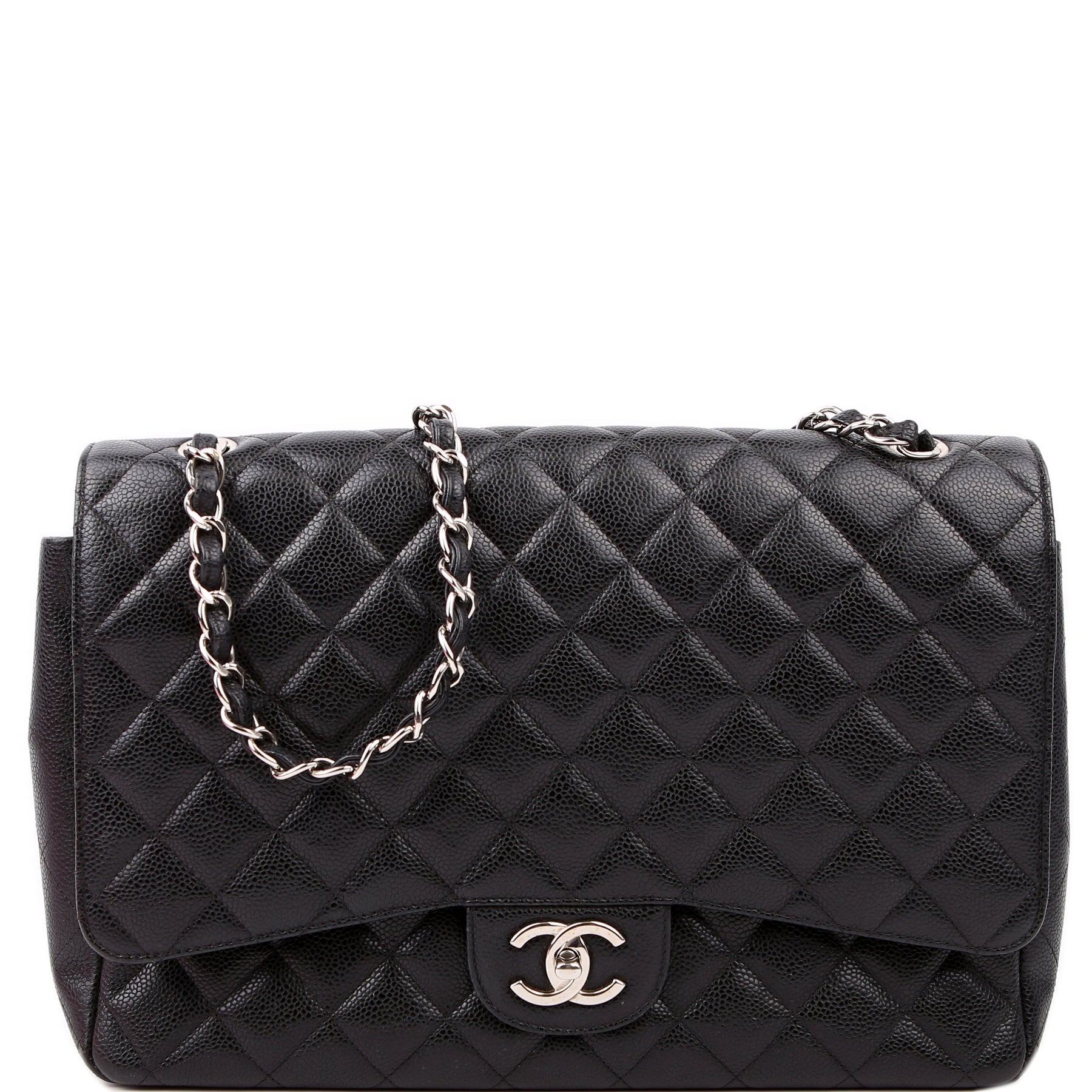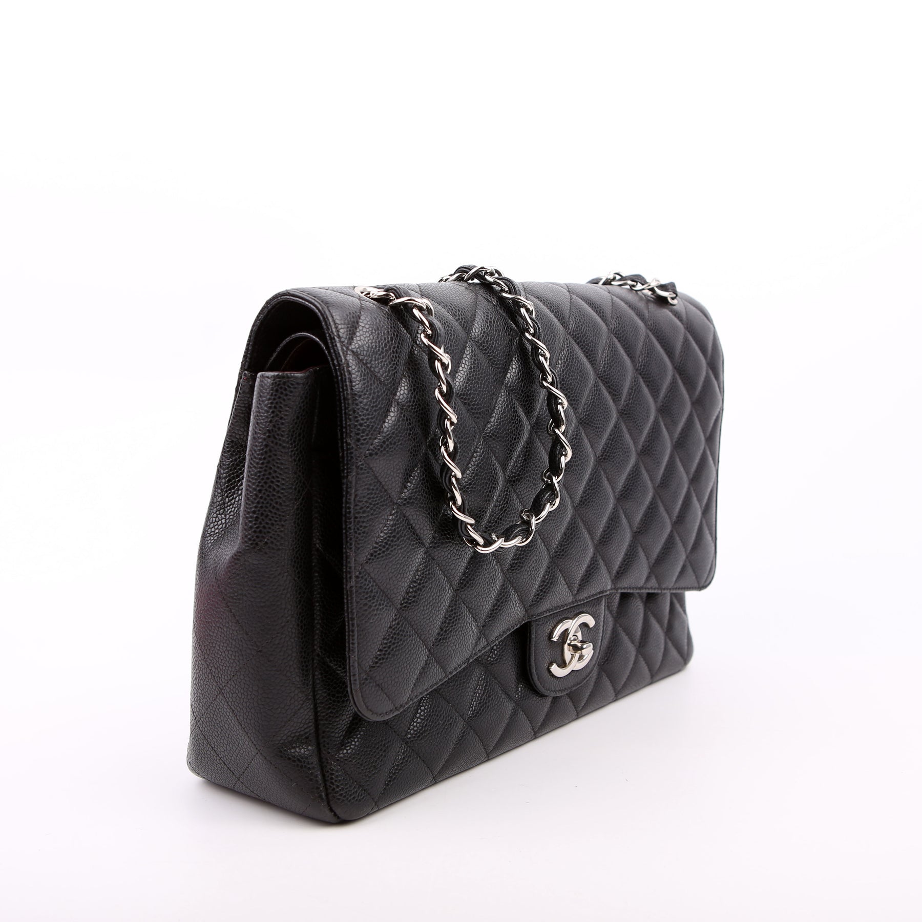 This pre-owned Chanel Classic Flap Maxi Shoulder Bag is guaranteed 100% authentic. The exterior is in the classic Chanel Caviar leather.