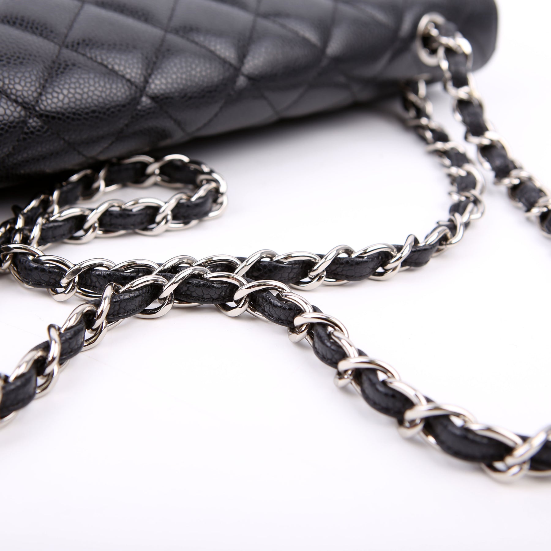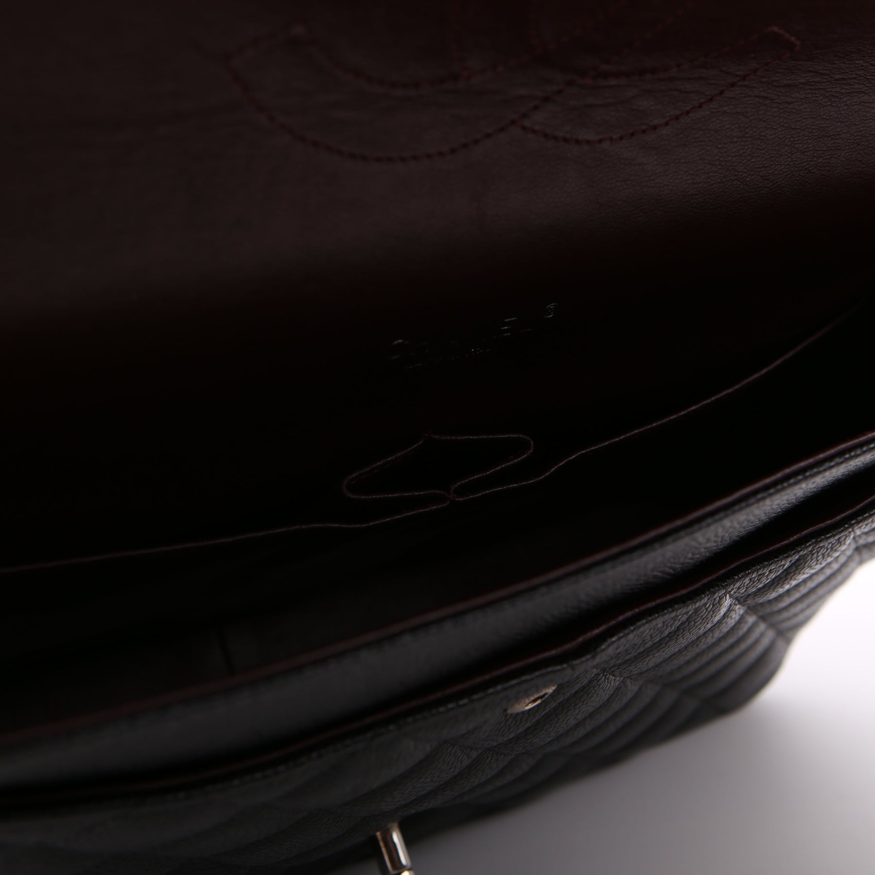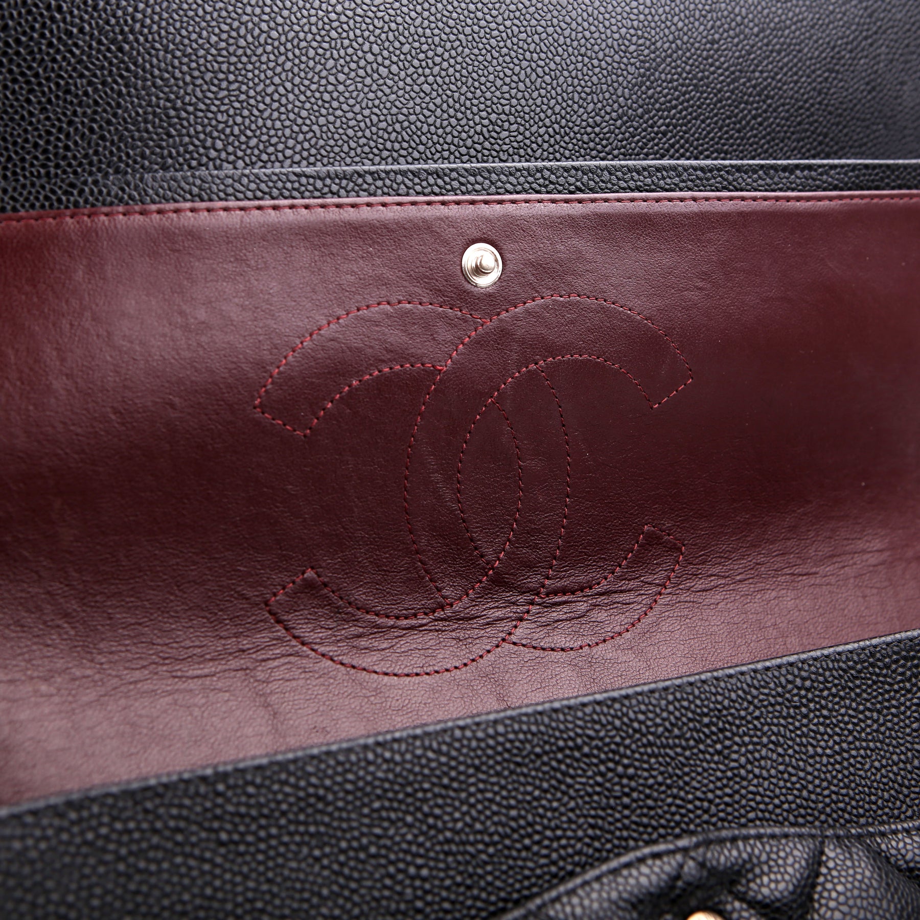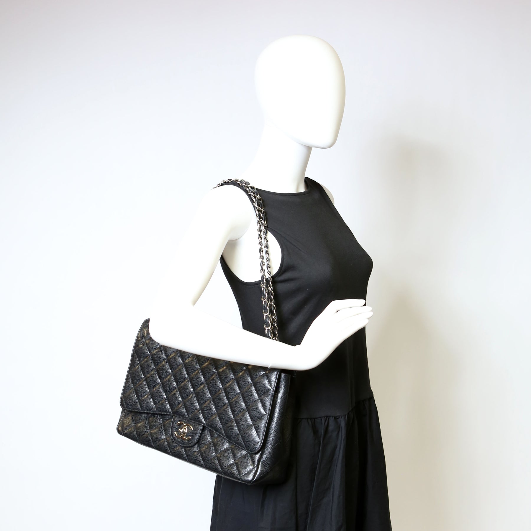 This pre-owned Chanel Classic Flap Maxi Shoulder Bag is guaranteed 100% authentic. The exterior is in the classic Chanel Caviar leather.