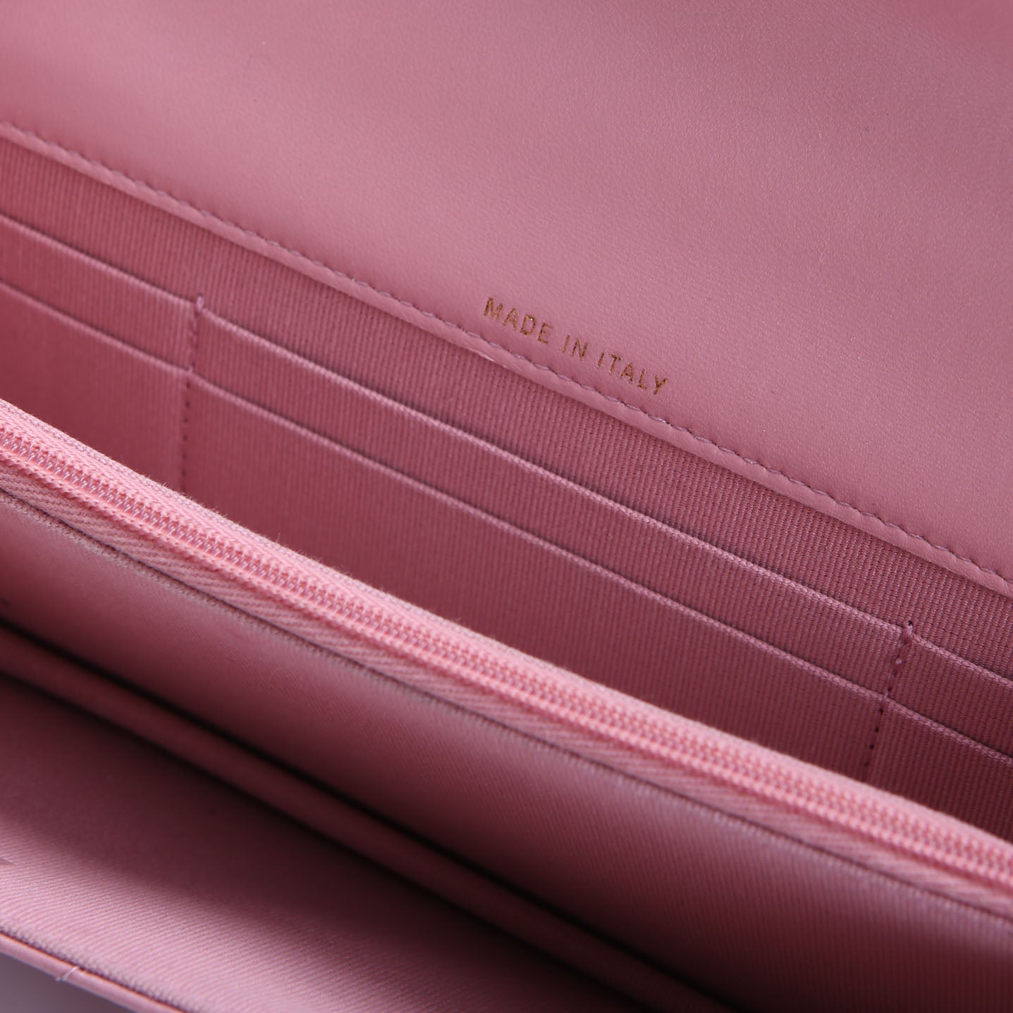 Interior: The interior shows very minor marks under logo. The fabric shows light stains. The interior features two open sections, one zip closure pocket, and two card slots.