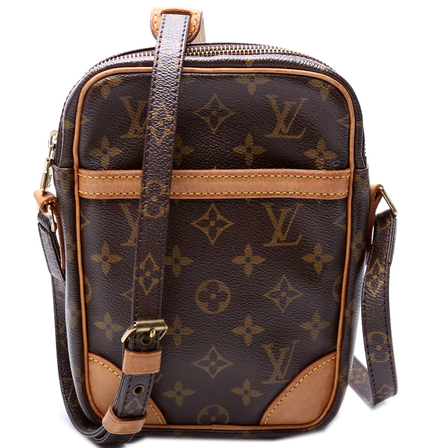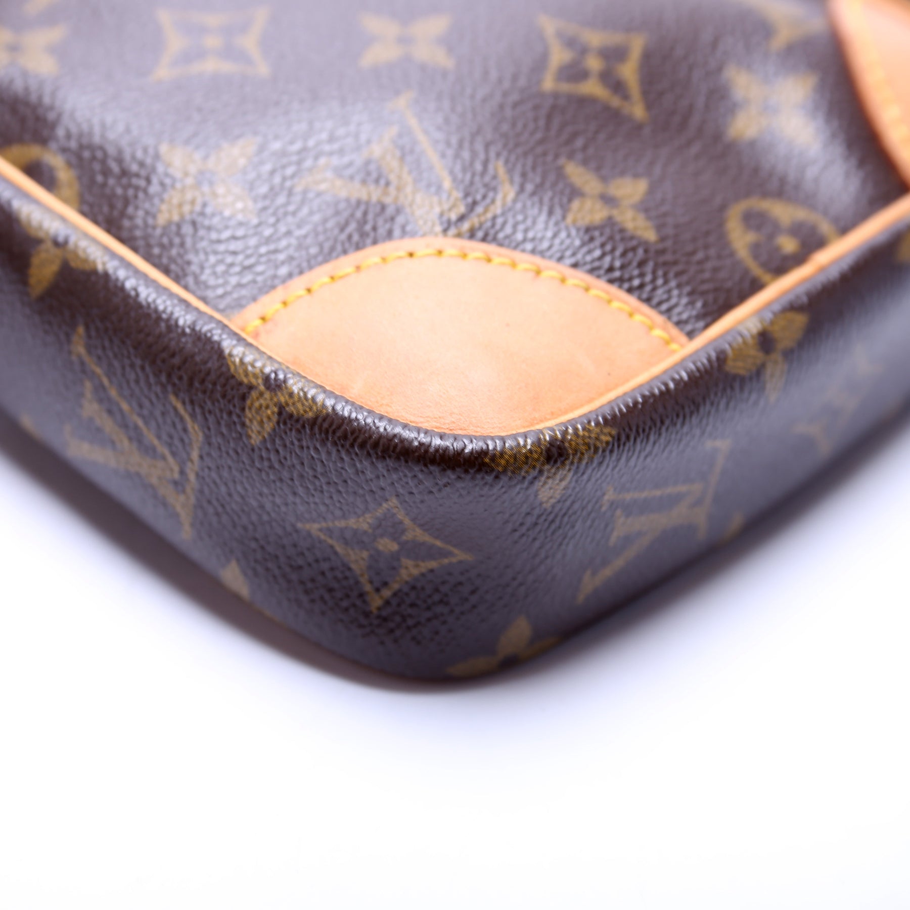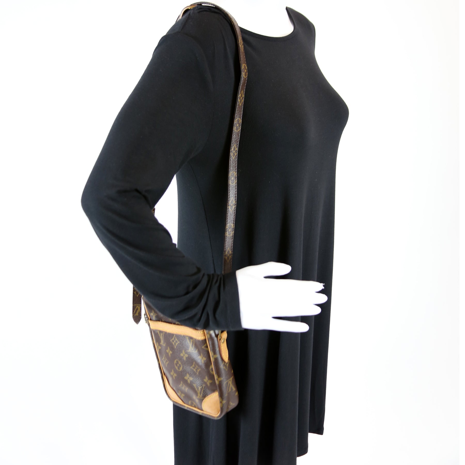 This pre-owned Louis Vuitton Danube is guaranteed 100% authentic. The exterior is in the classic Louis Vuitton Monogram coated canvas.