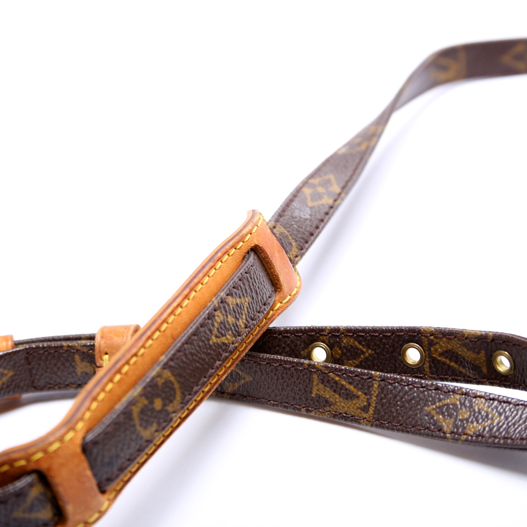 Exterior: The exterior Monogram coated canvas is free of any rips or cracks. The exterior features one open pocket. The leather details show minor discoloration.